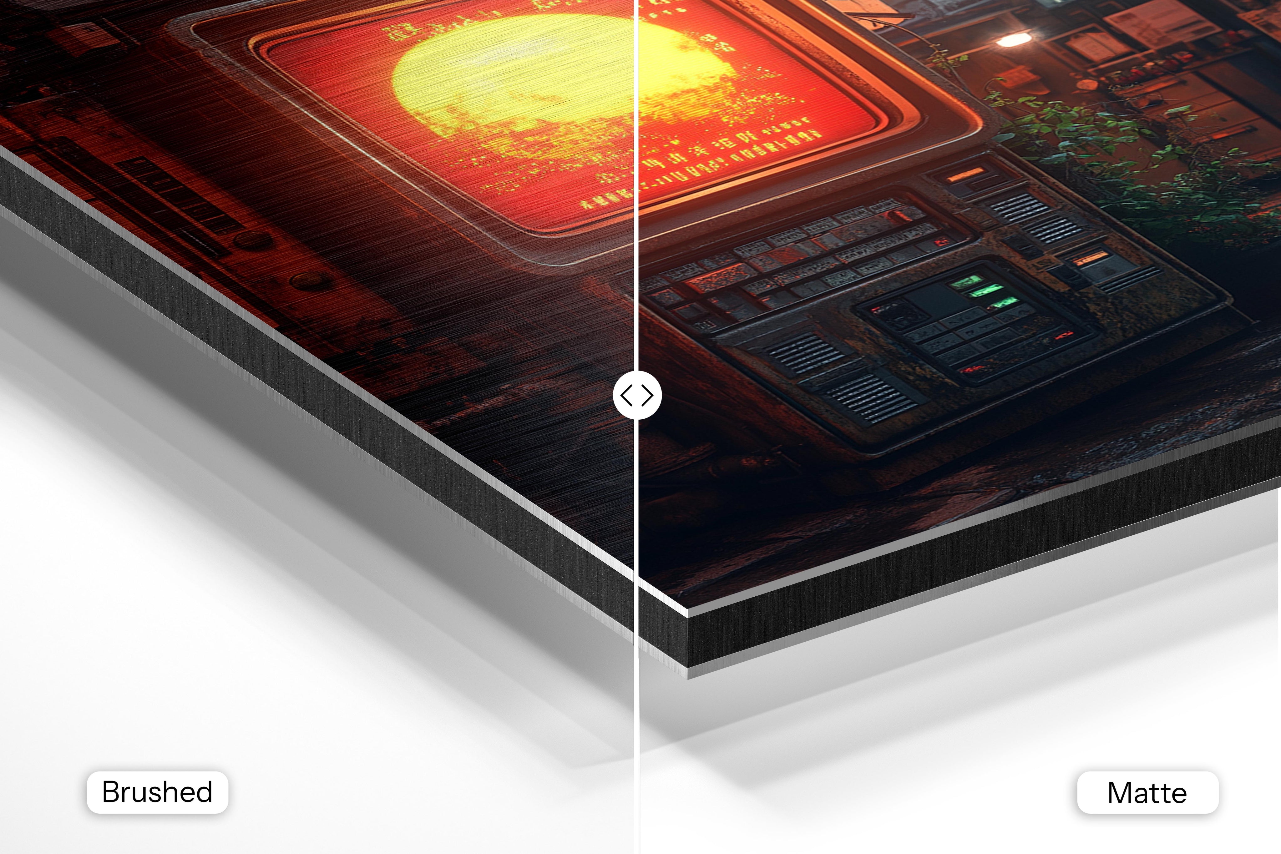 - Brushed Aluminum, on the other hand, features a raw metallic texture with visible brush strokes. Whites and highlights in your image let the silver surface show through, adding a dramatic, shimmering effect. Ideal for black-and-white images, minimalist designs, or abstract art, it creates a bold, industrial vibe with a modern edge.