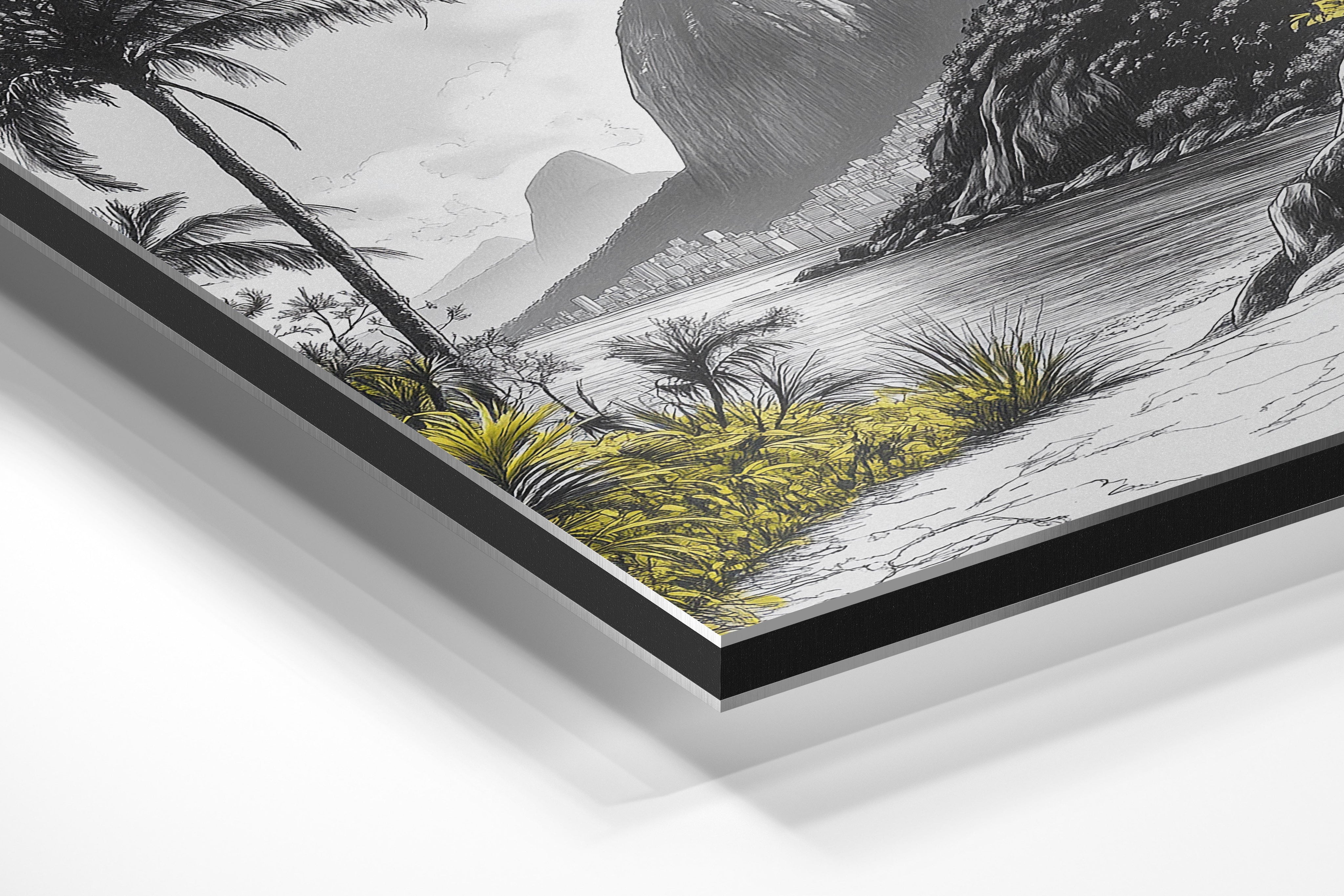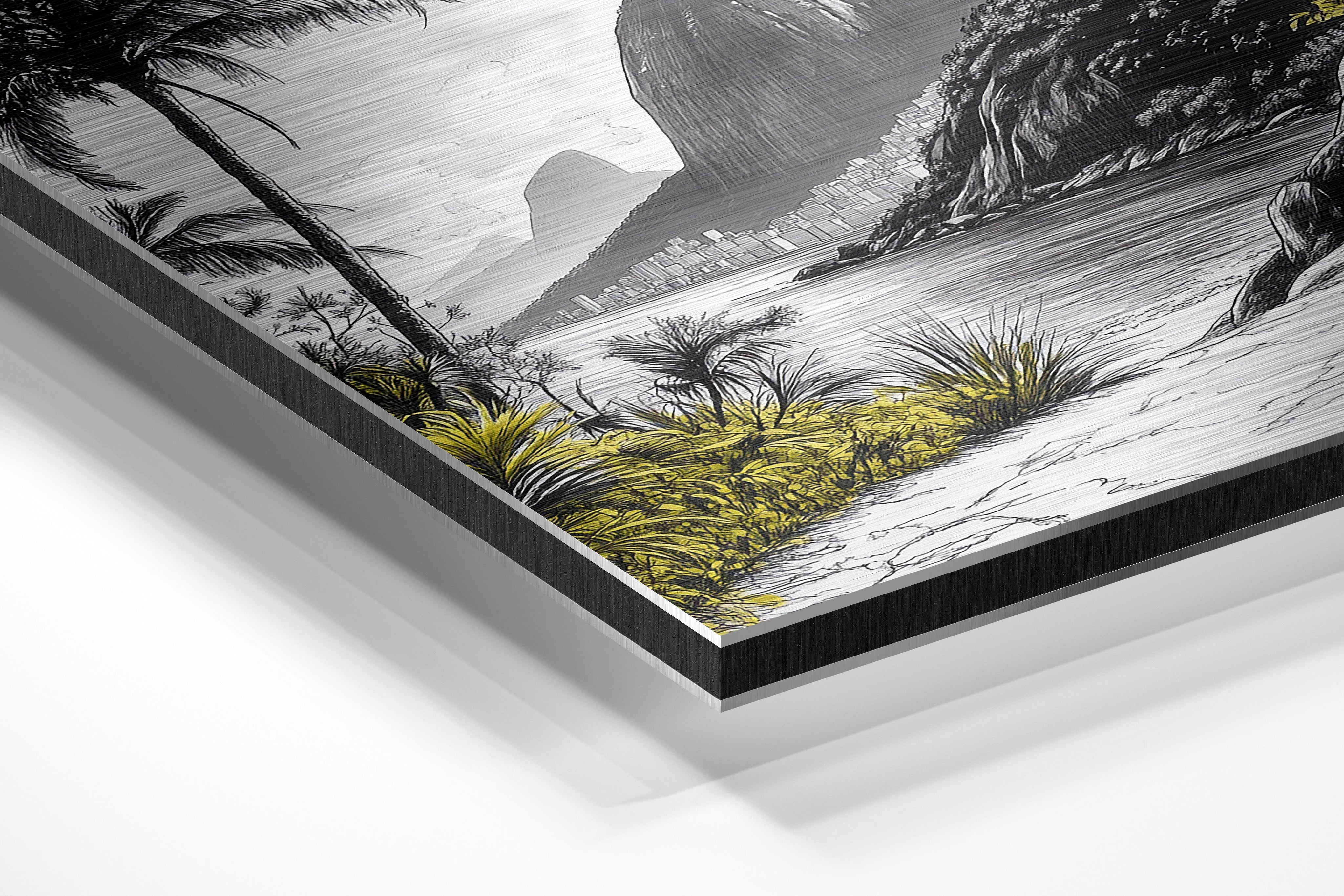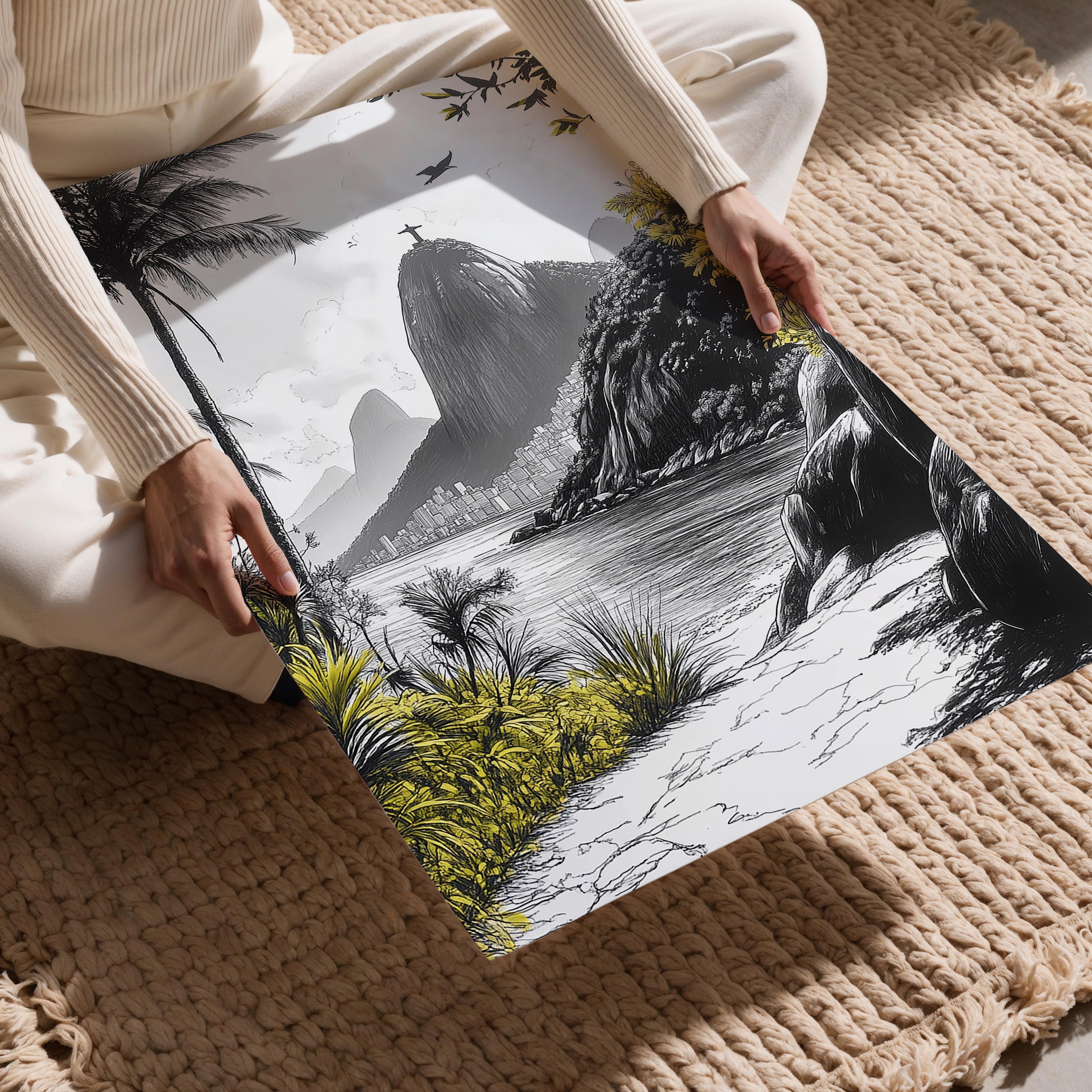 A detailed illustration of Rio de Janeiro, featuring Christ the Redeemer atop Corcovado Mountain, surrounded by lush vegetation and dramatic hills. This black-and-white composition with touches of yellow-green captures the vibrant, tropical energy of Rio while maintaining a refined, artistic style. This piece is ideal for world travelers or anyone with a love for exotic landscapes, offering a touch of warmth and adventure to any room. Its artistic finesse makes it a great fit for eclectic interiors.