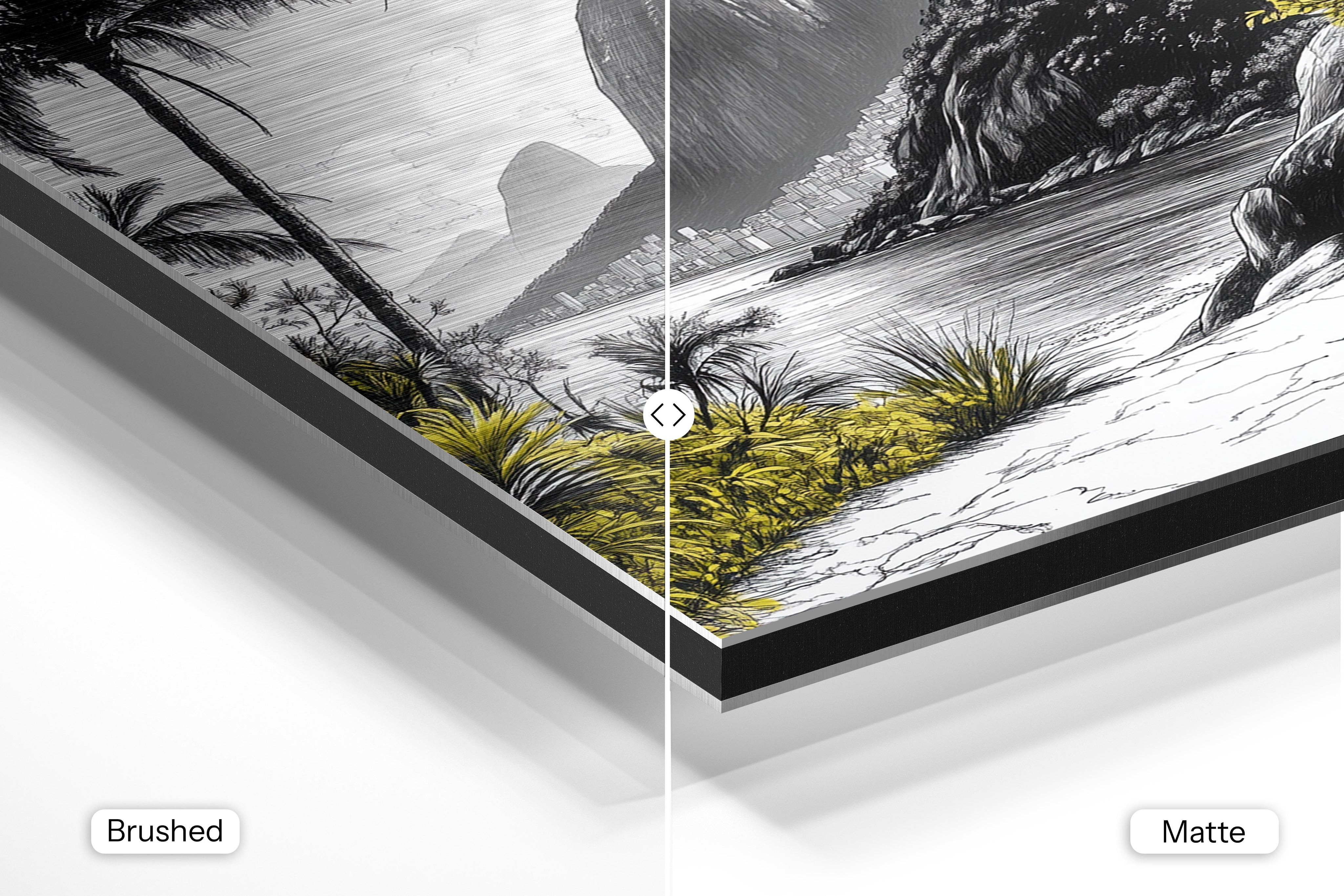 - Brushed Aluminum, on the other hand, features a raw metallic texture with visible brush strokes. Whites and highlights in your image let the silver surface show through, adding a dramatic, shimmering effect. Ideal for black-and-white images, minimalist designs, or abstract art, it creates a bold, industrial vibe with a modern edge.