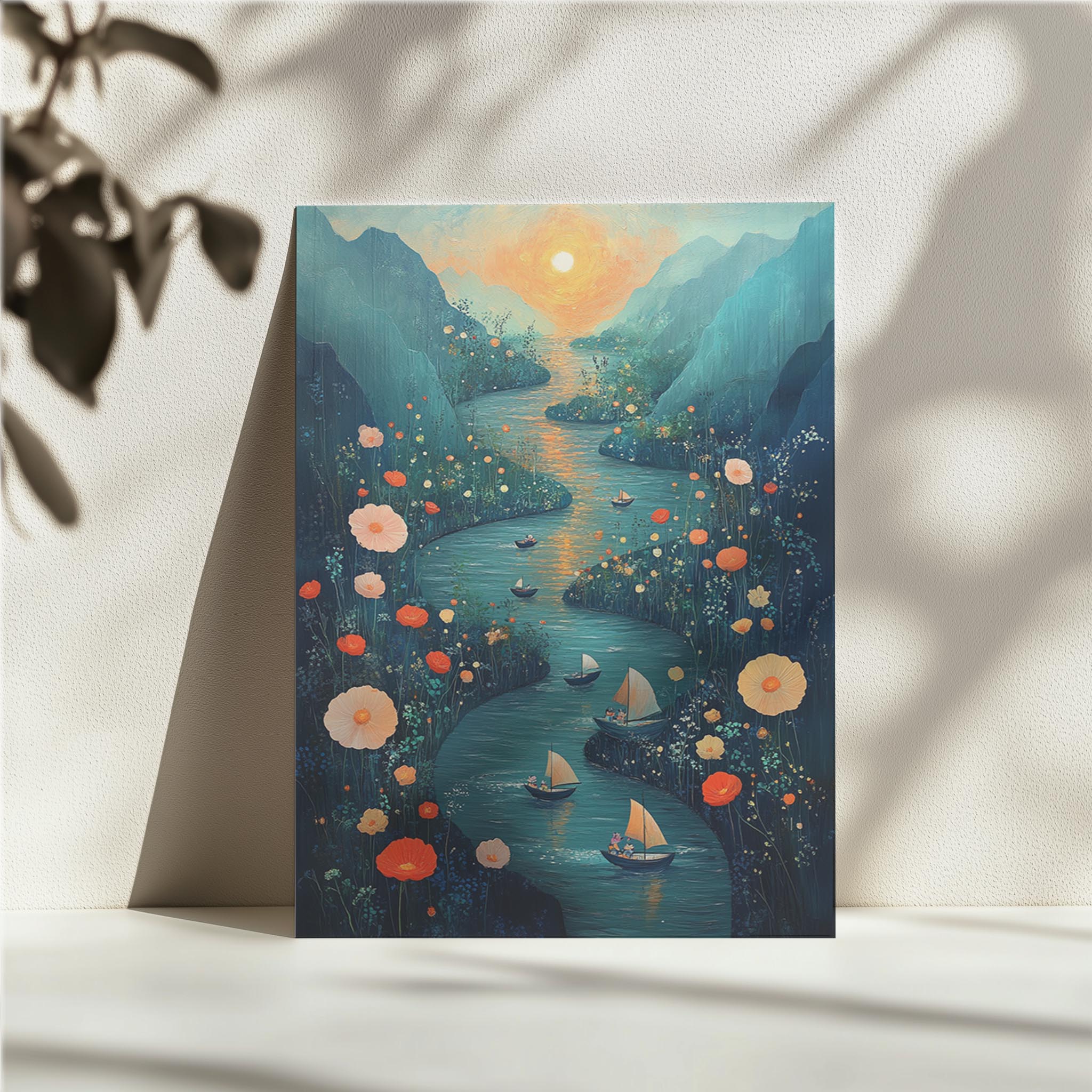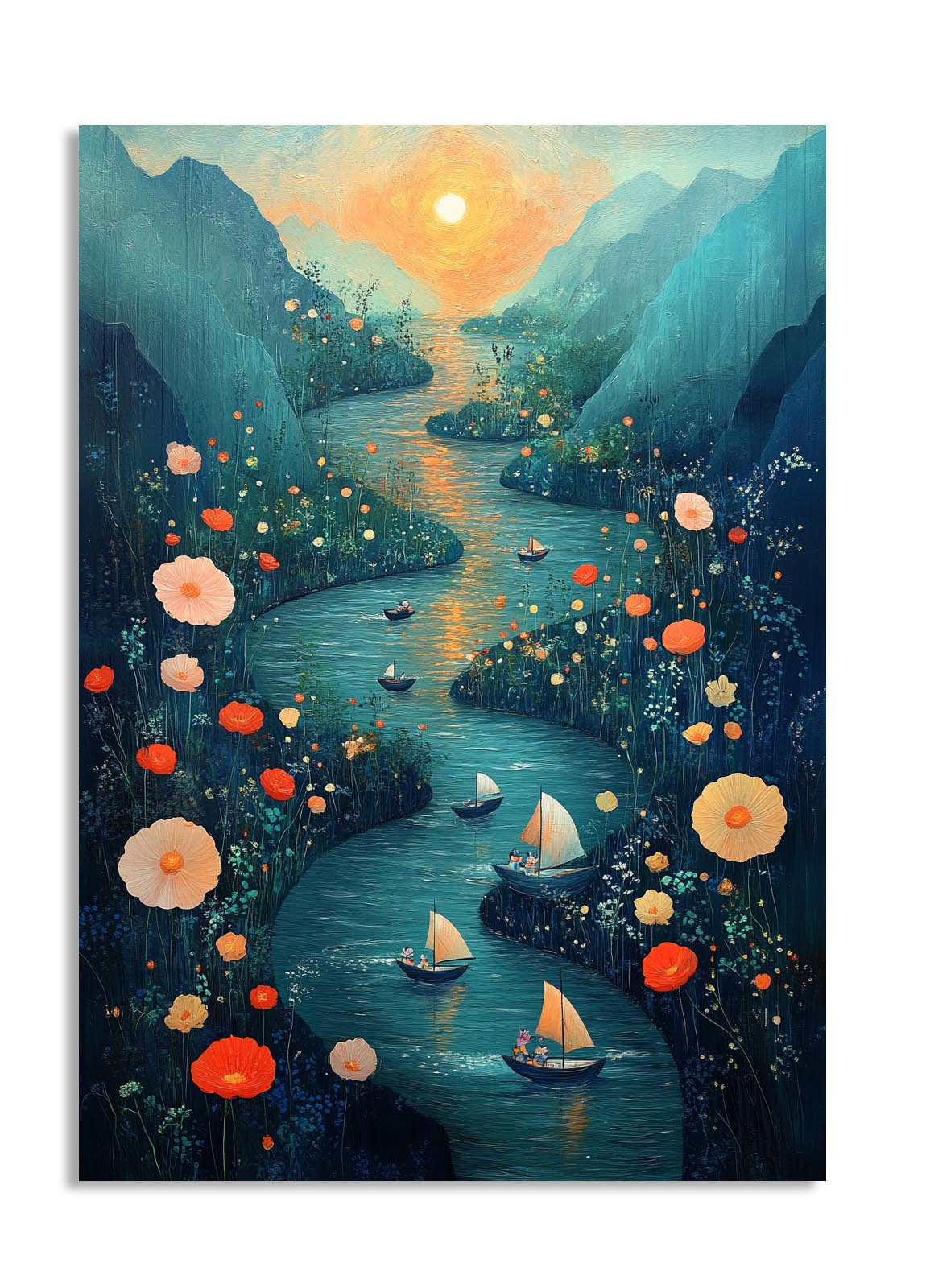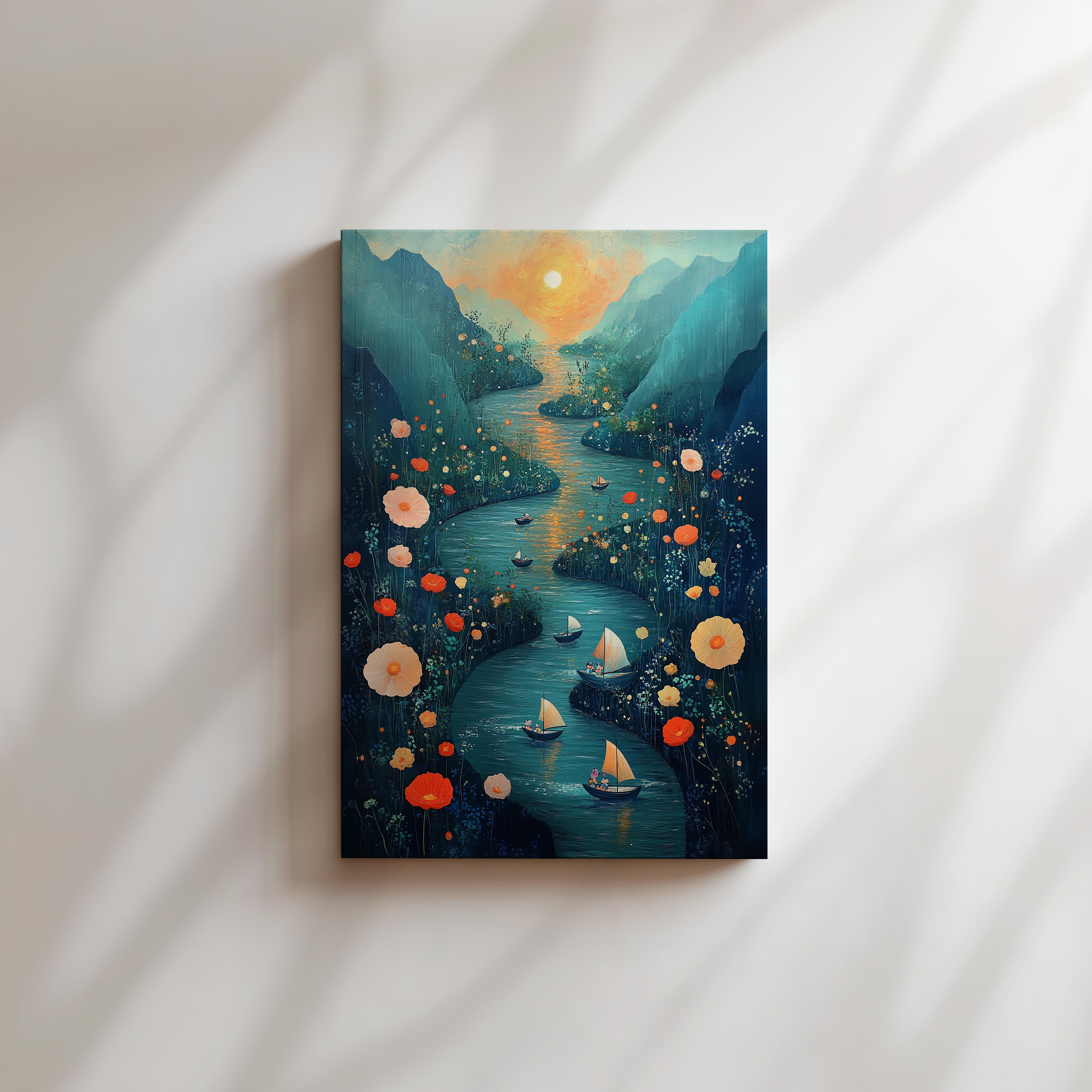 A mesmerizing depiction of a meandering river surrounded by wildflowers, with small boats sailing under a glowing sunset. The distant mountains and warm colors create a romantic and dreamy vibe, immersing viewers in a tranquil escape. Each element, from the golden hues of the sunset to the detailed wildflowers, is masterfully rendered to evoke serenity and wonder. This piece is ideal for a cozy dining room or bedroom wall, where it can inspire relaxation and a love for natural beauty. Its intricate details ensure it remains captivating, encouraging viewers to lose themselves in its peaceful charm.