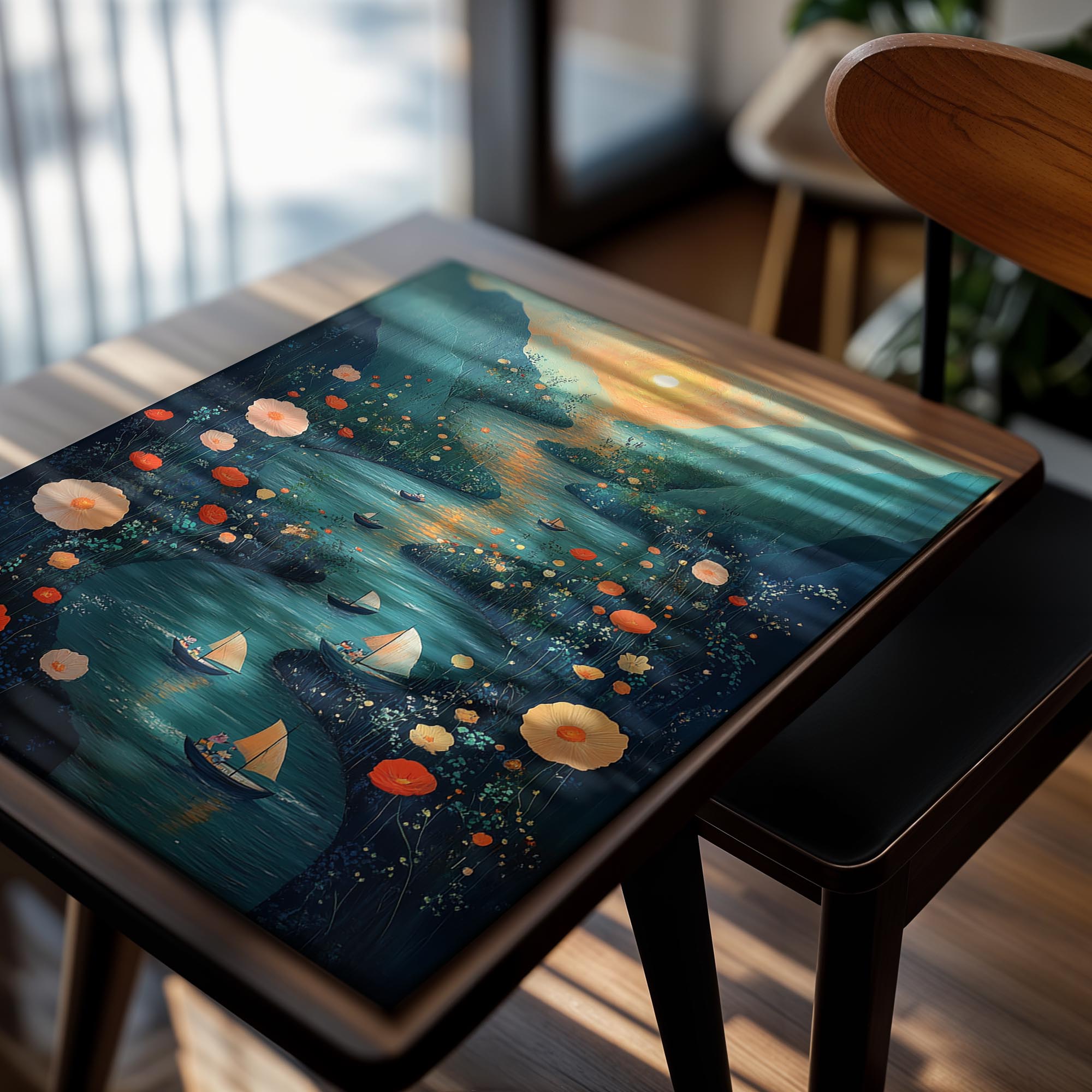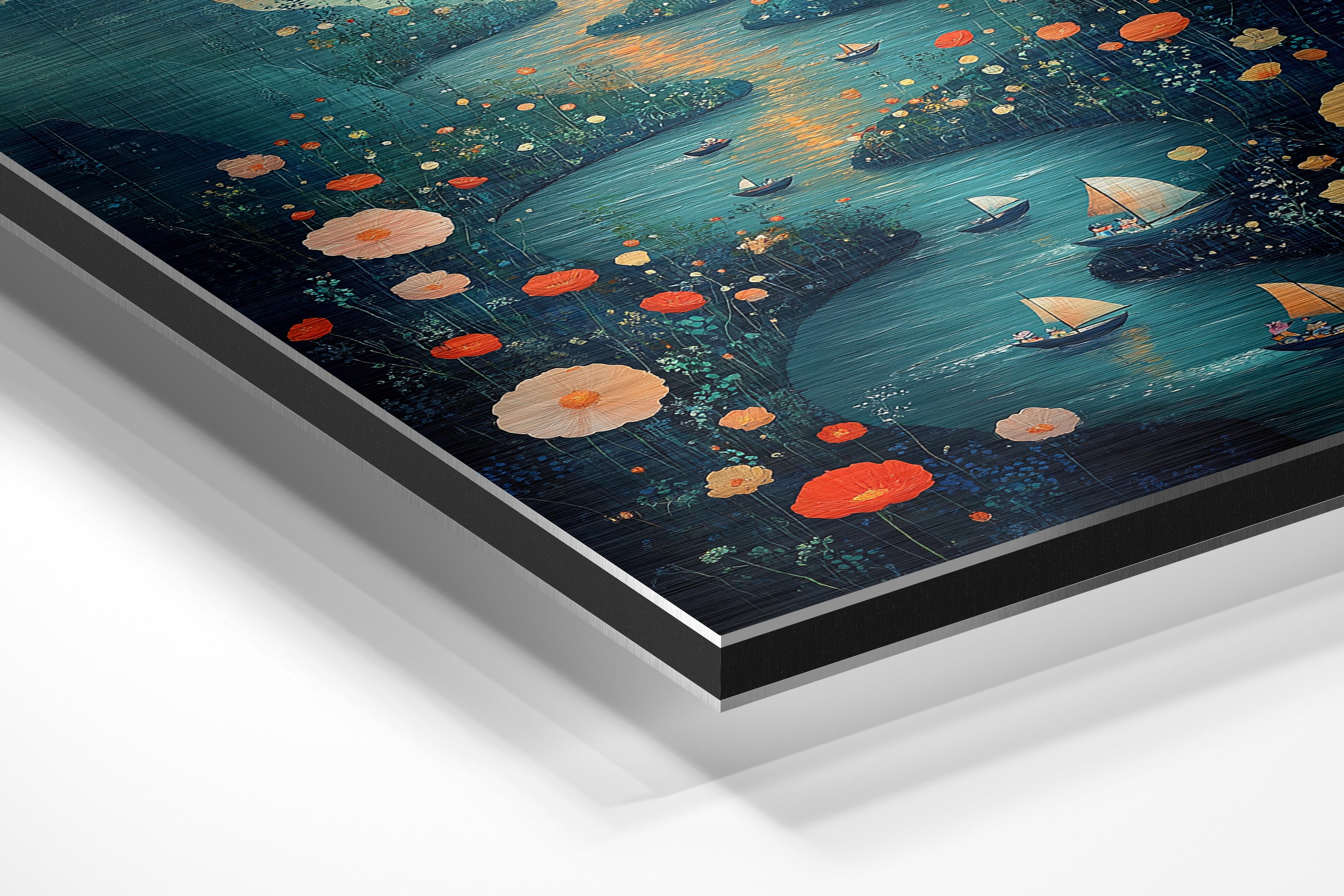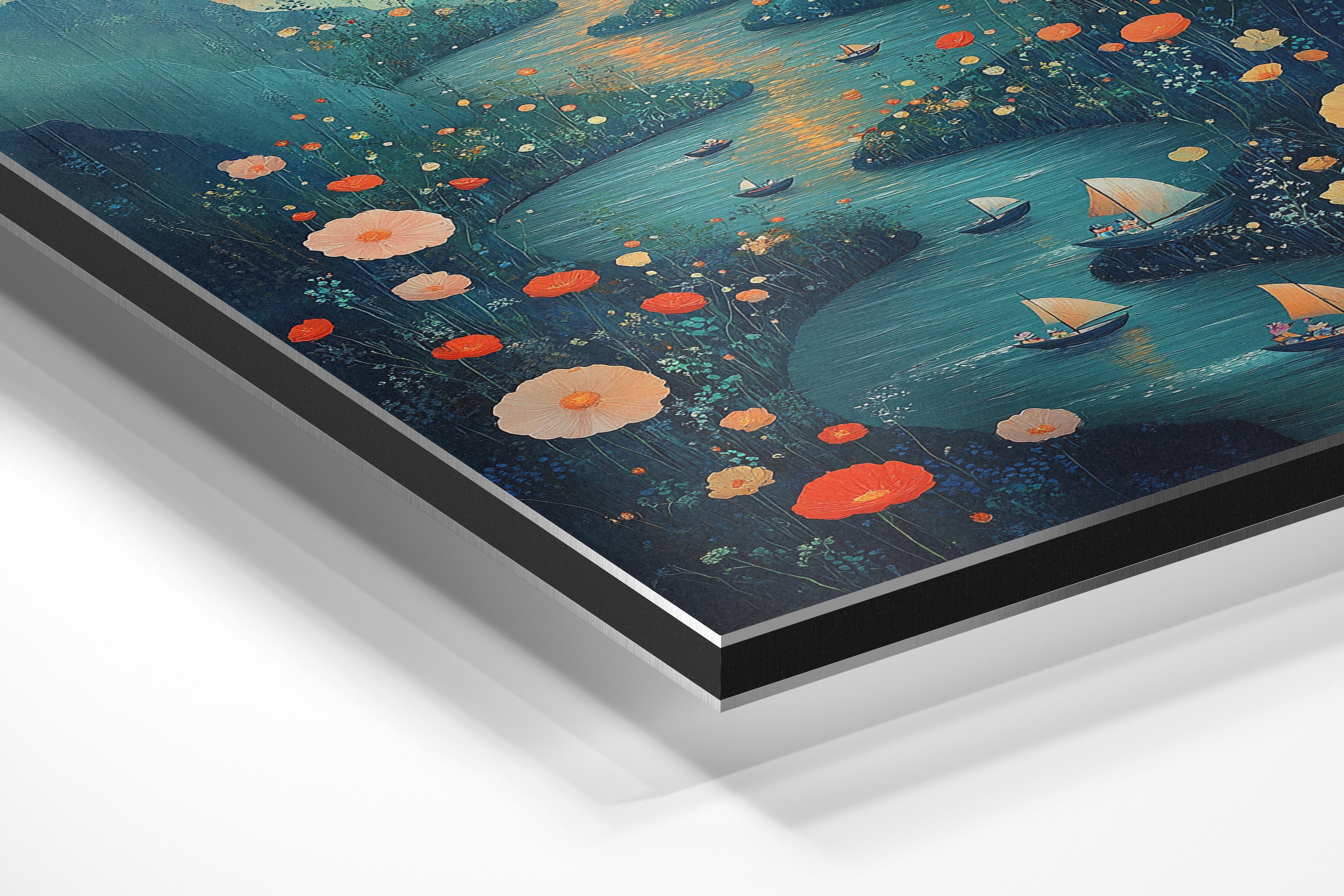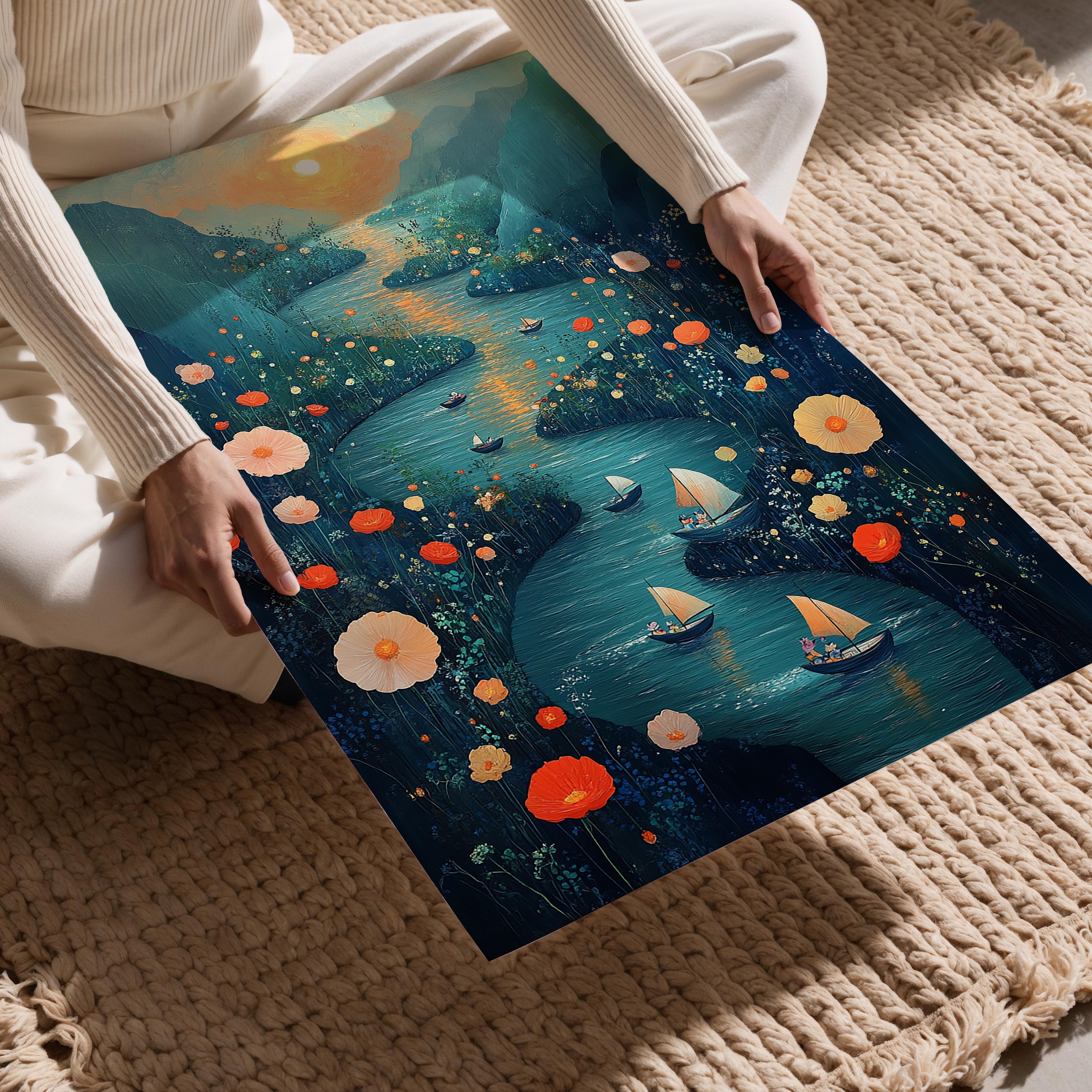 A mesmerizing depiction of a meandering river surrounded by wildflowers, with small boats sailing under a glowing sunset. The distant mountains and warm colors create a romantic and dreamy vibe, immersing viewers in a tranquil escape. Each element, from the golden hues of the sunset to the detailed wildflowers, is masterfully rendered to evoke serenity and wonder. This piece is ideal for a cozy dining room or bedroom wall, where it can inspire relaxation and a love for natural beauty. Its intricate details ensure it remains captivating, encouraging viewers to lose themselves in its peaceful charm.