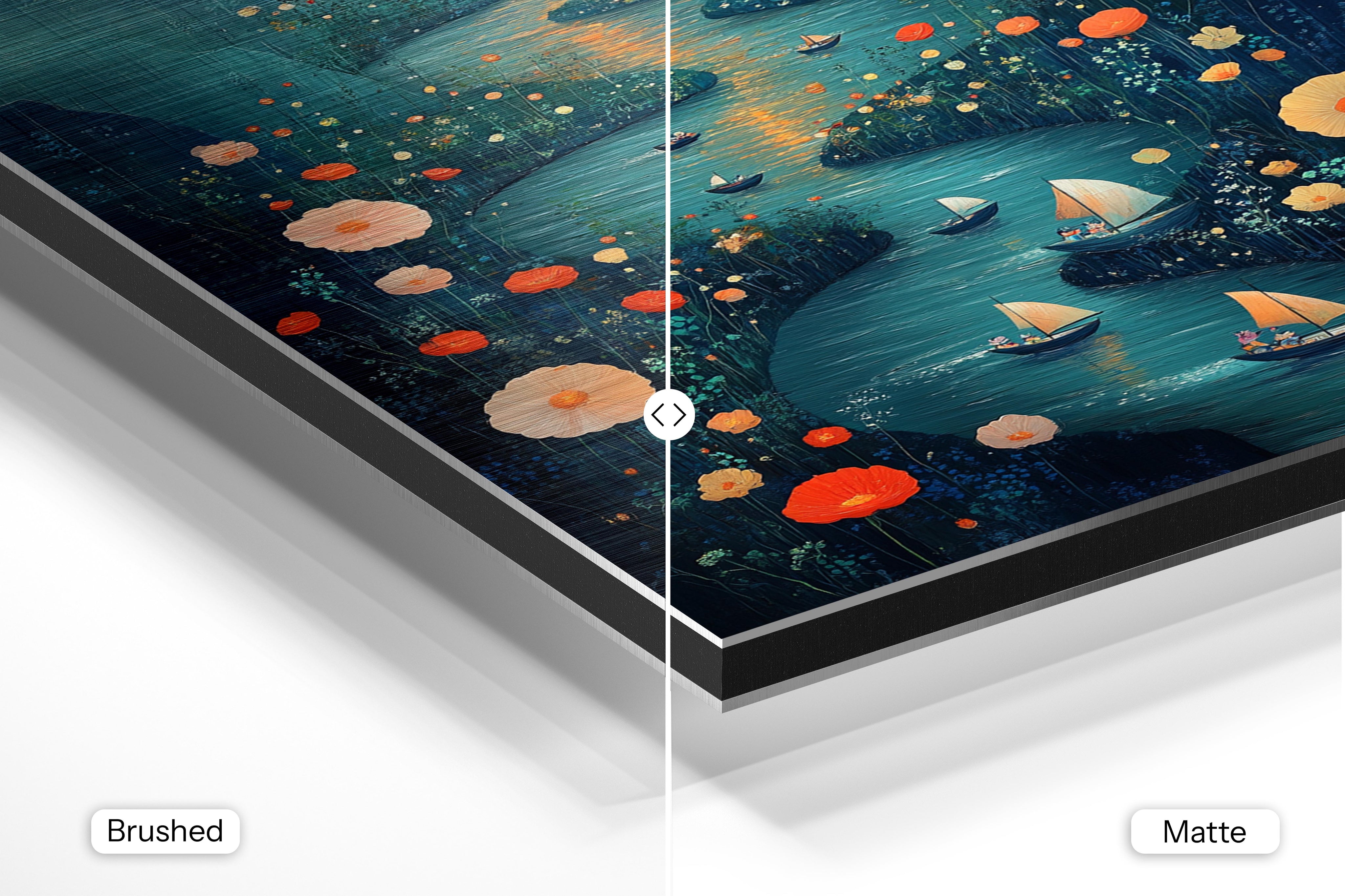 - Matte Aluminum offers a smooth, bright white surface that delivers crisp details and vibrant, true-to-life colors. With its non-reflective finish and subtle silky sheen, it’s perfect for photography, portraits, and colorful artwork—bringing a clean, polished look to any interior.