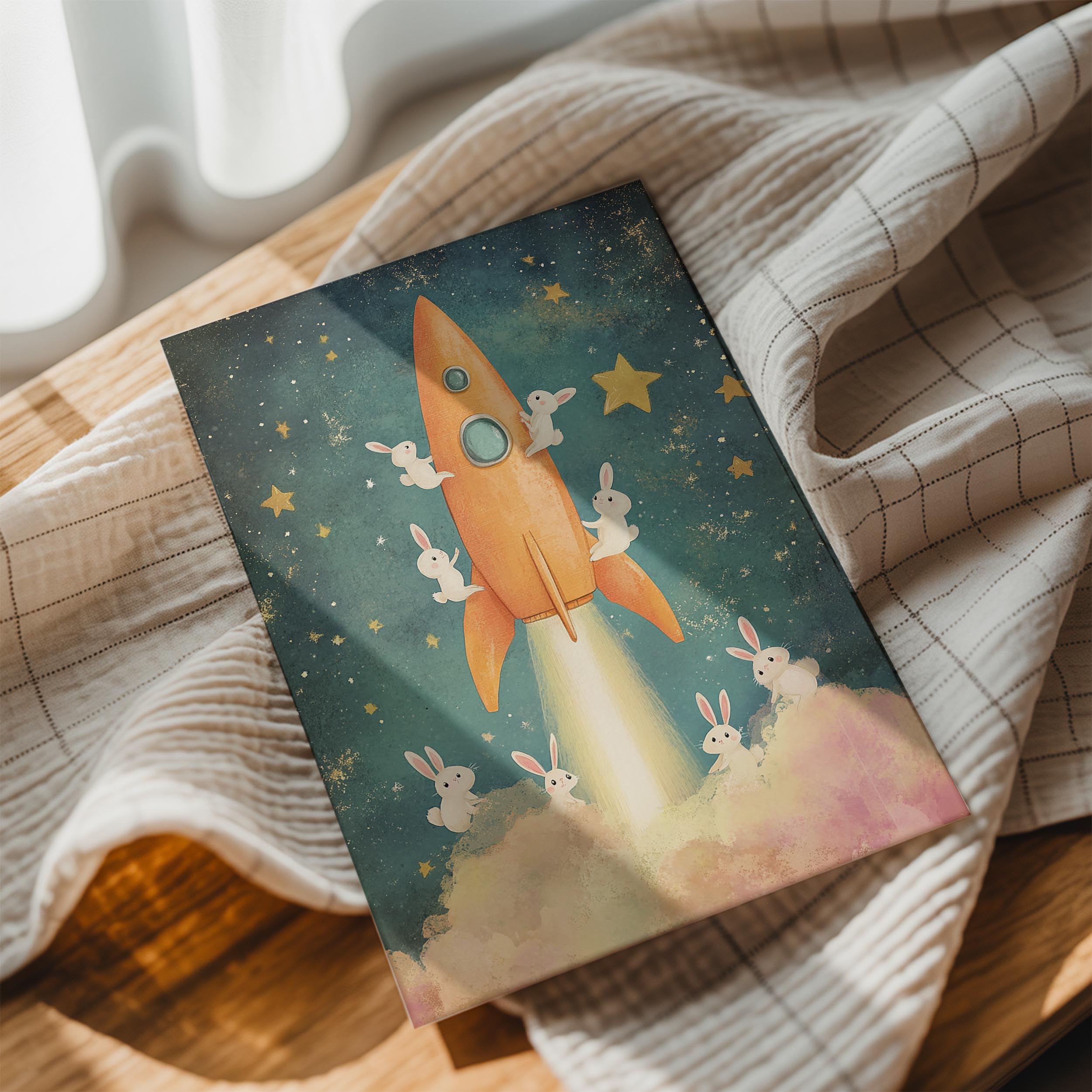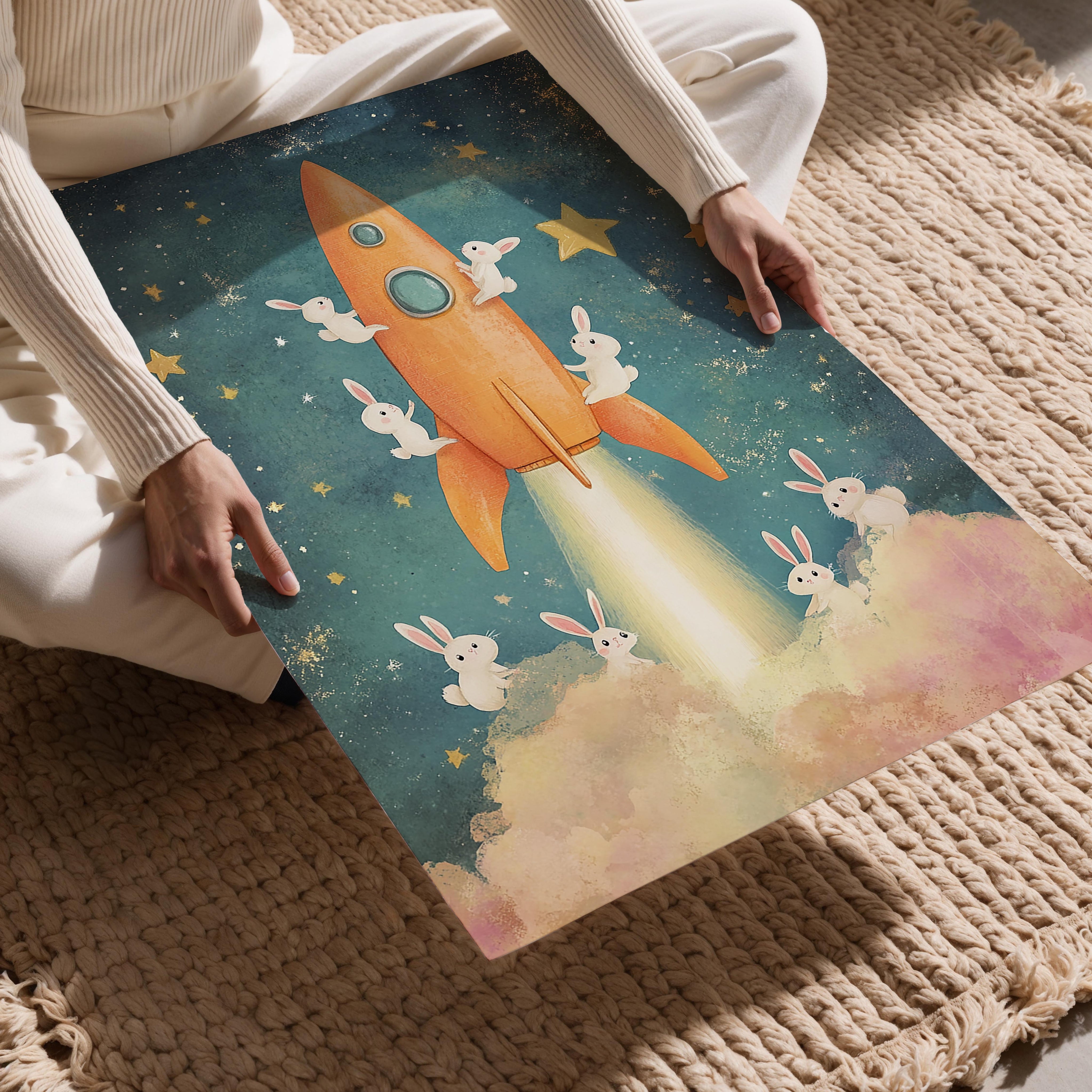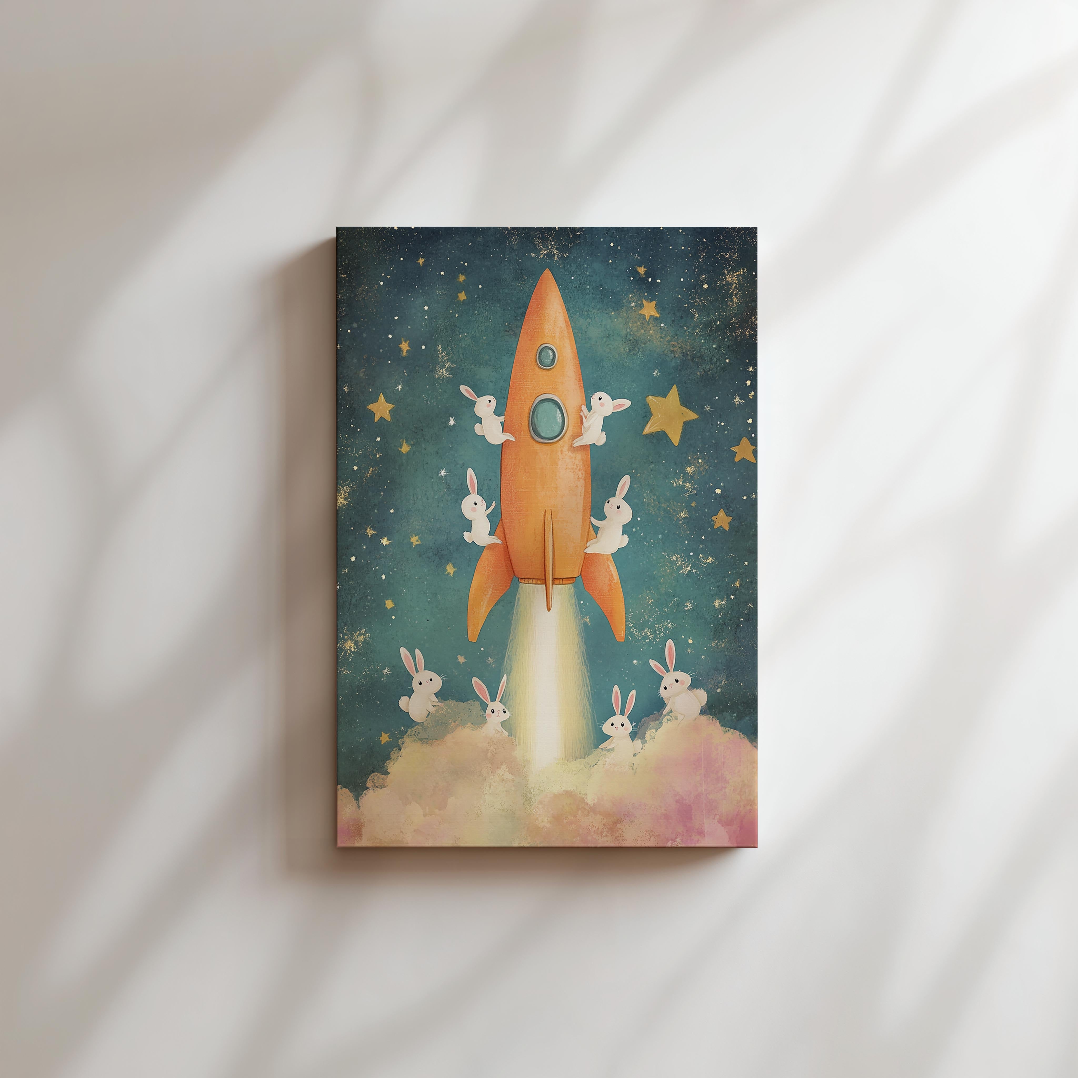 A delightful artwork showing playful bunnies climbing an orange rocket amidst a starry night sky. The whimsical composition adds charm and fun to any space, particularly a nursery or a playroom. The gentle pastel hues, combined with the joy-filled bunnies, create a heartwarming image that appeals to both children and adults who enjoy imaginative art. This scene can inspire daydreams of adventures and storytelling, making it an excellent gift or centerpiece for family-friendly settings.