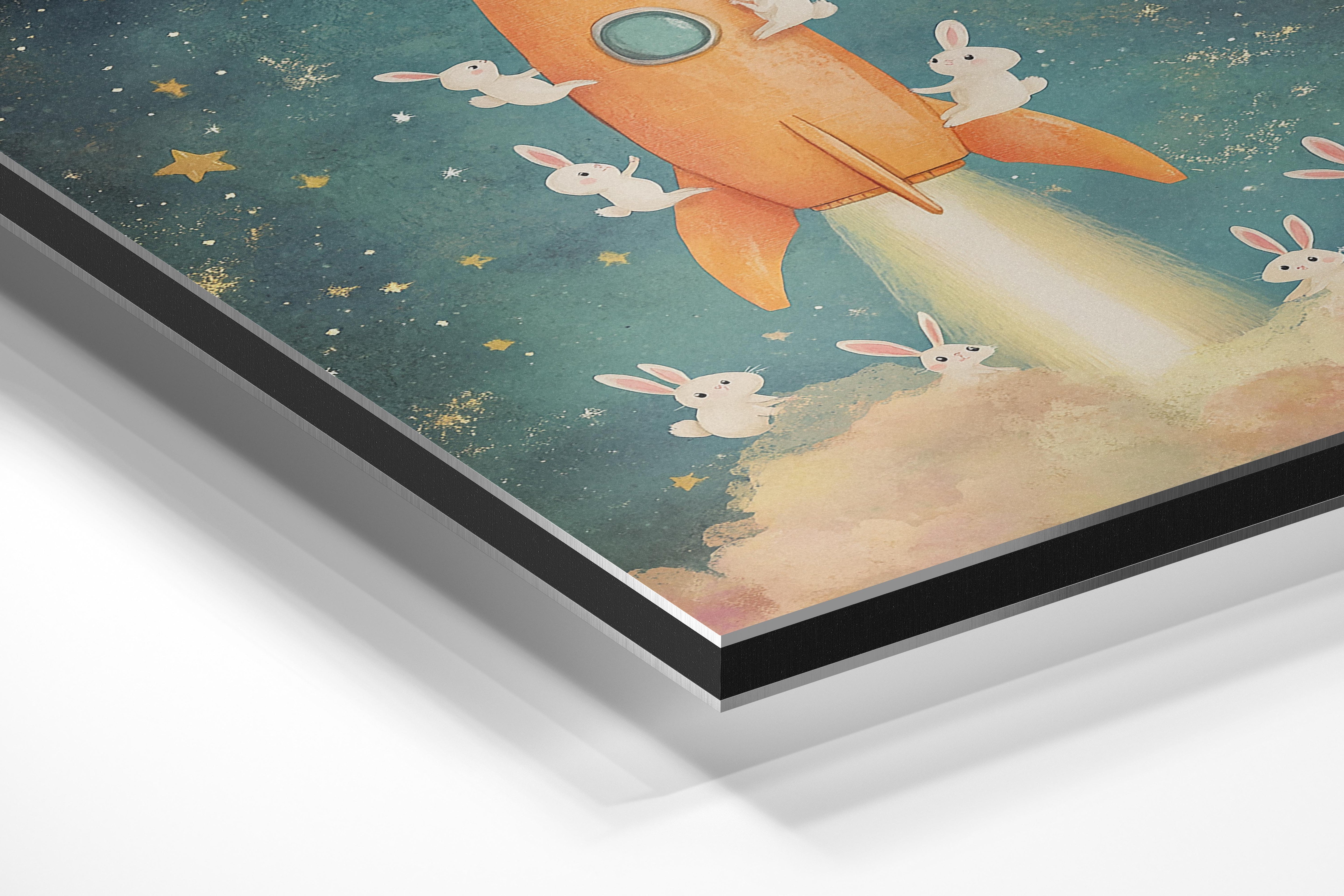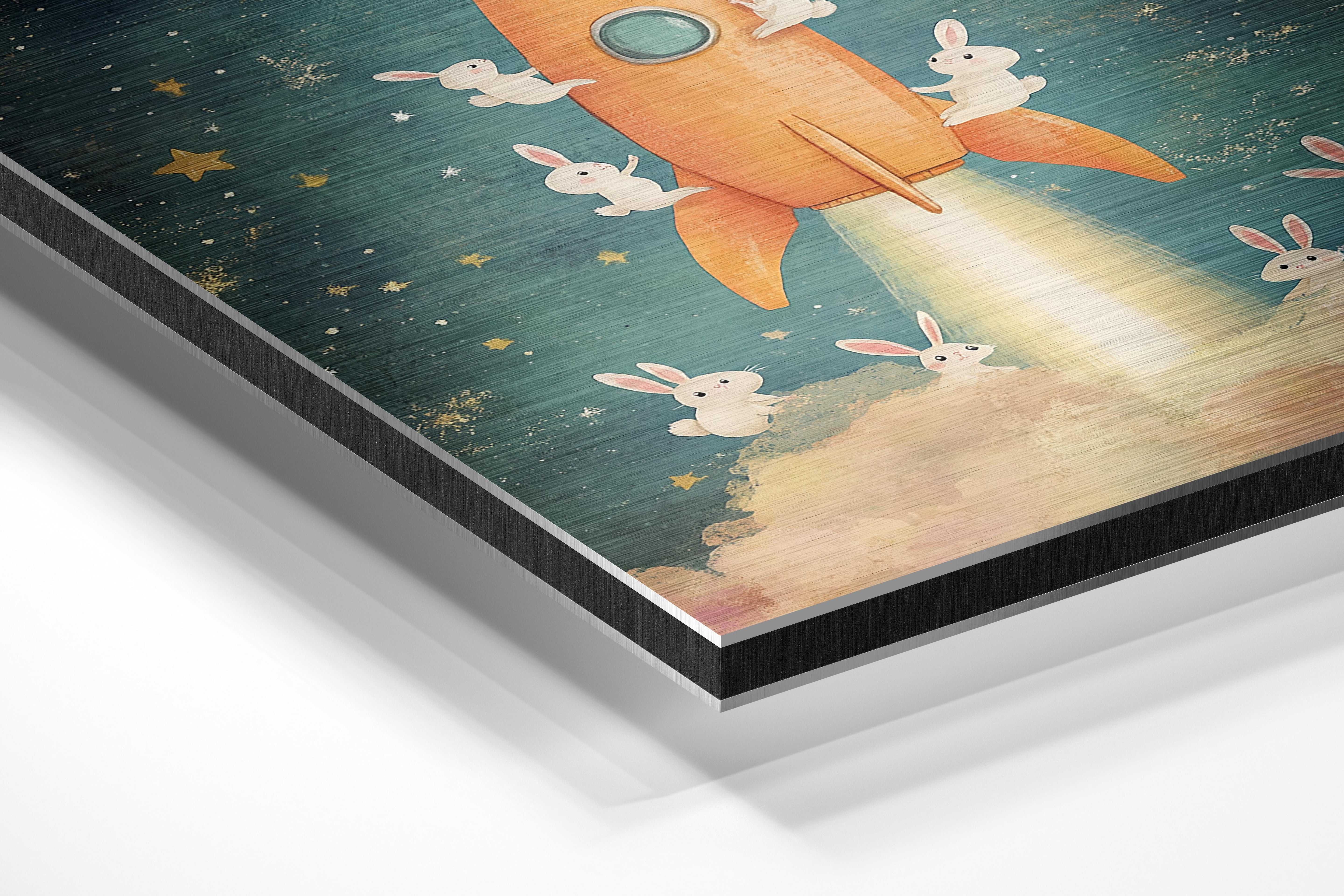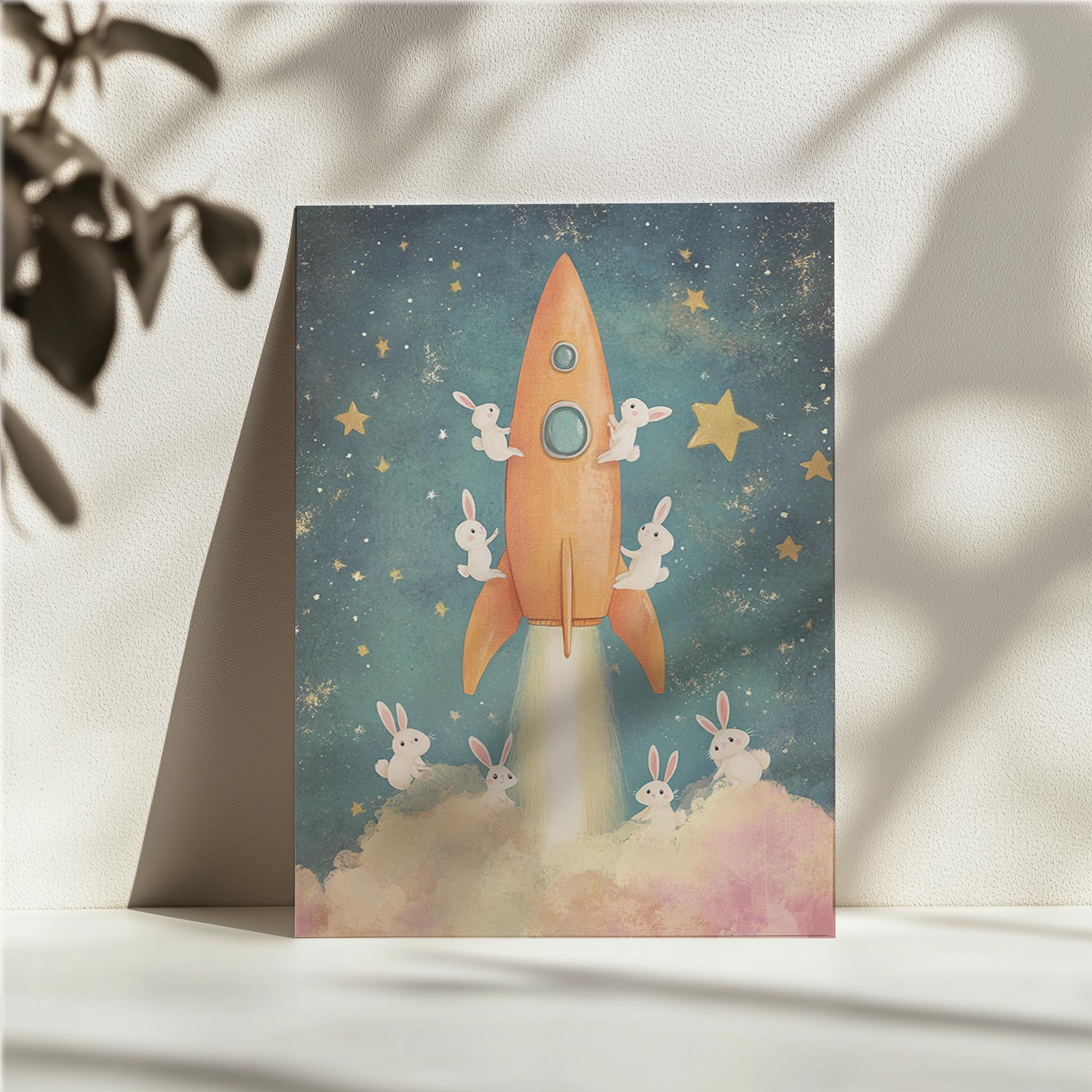 A delightful artwork showing playful bunnies climbing an orange rocket amidst a starry night sky. The whimsical composition adds charm and fun to any space, particularly a nursery or a playroom. The gentle pastel hues, combined with the joy-filled bunnies, create a heartwarming image that appeals to both children and adults who enjoy imaginative art. This scene can inspire daydreams of adventures and storytelling, making it an excellent gift or centerpiece for family-friendly settings.