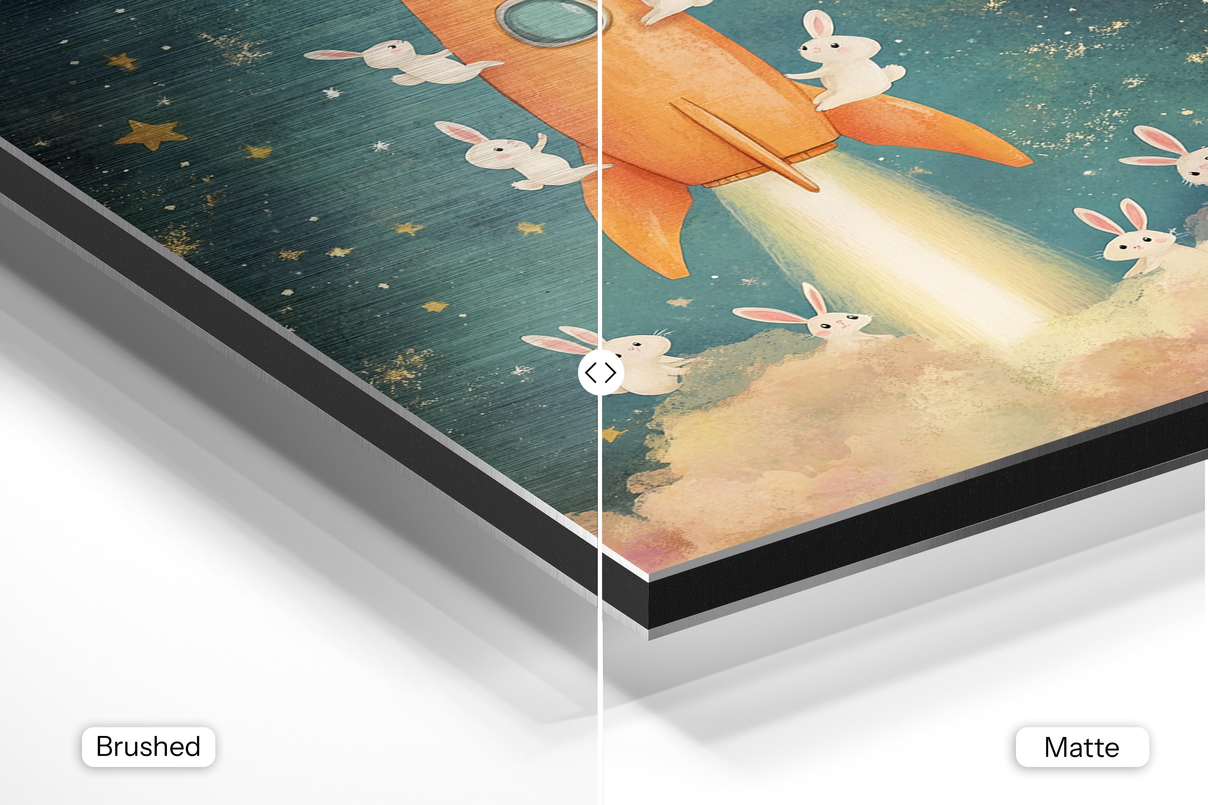 - Matte Aluminum offers a smooth, bright white surface that delivers crisp details and vibrant, true-to-life colors. With its non-reflective finish and subtle silky sheen, it’s perfect for photography, portraits, and colorful artwork—bringing a clean, polished look to any interior.