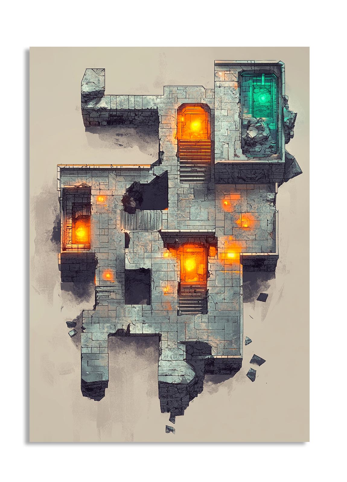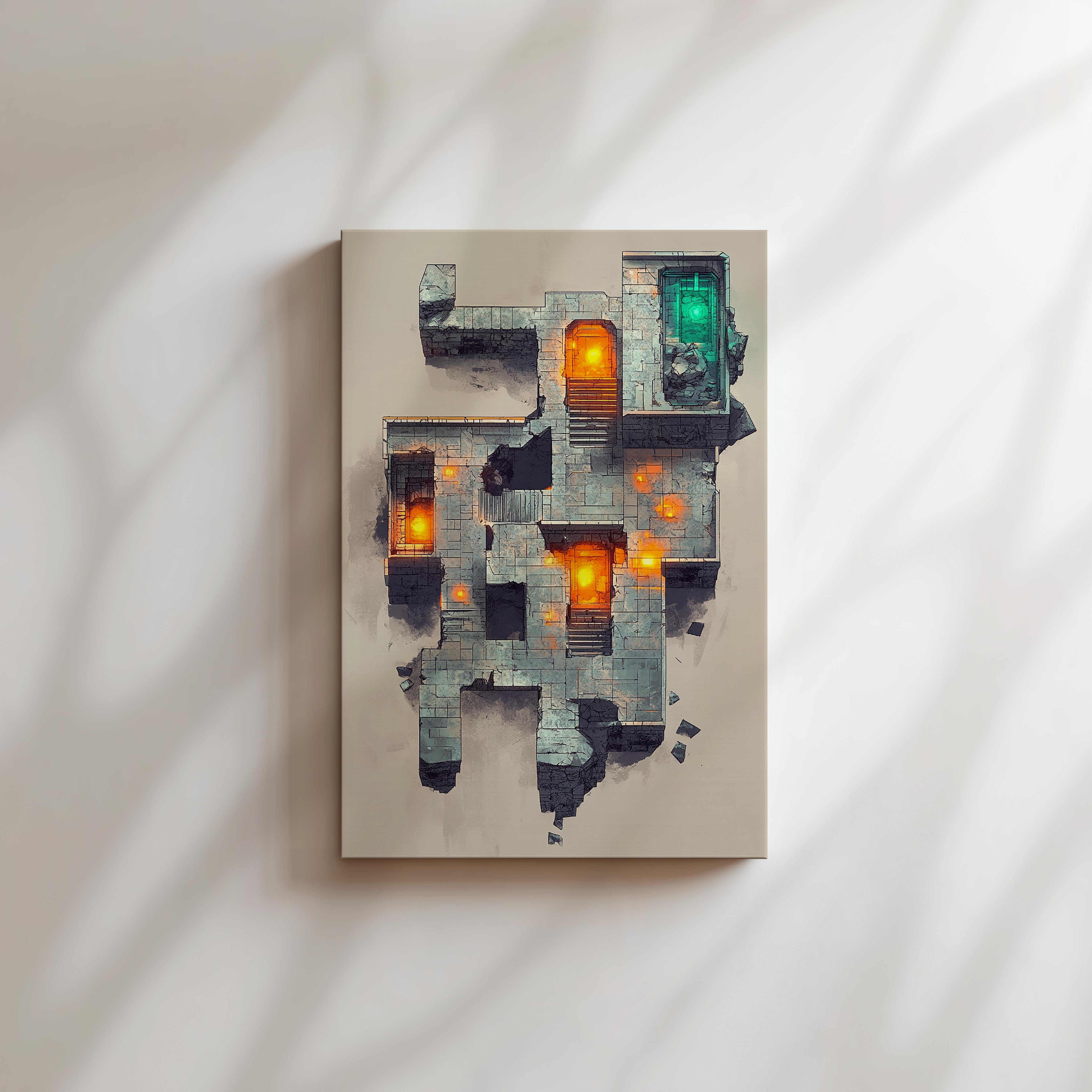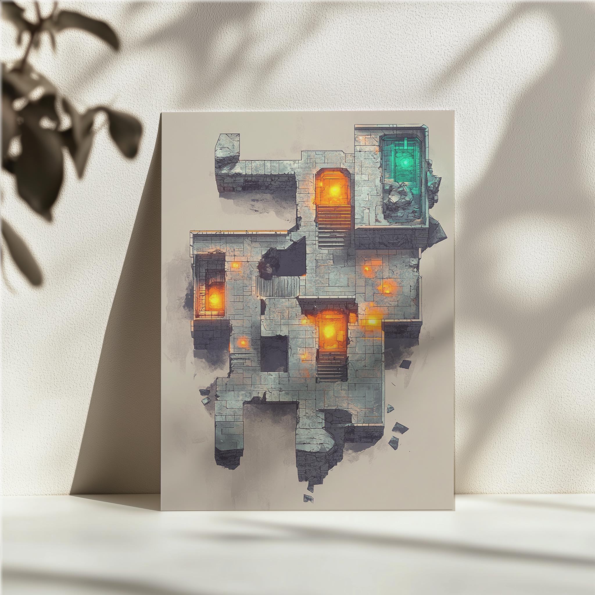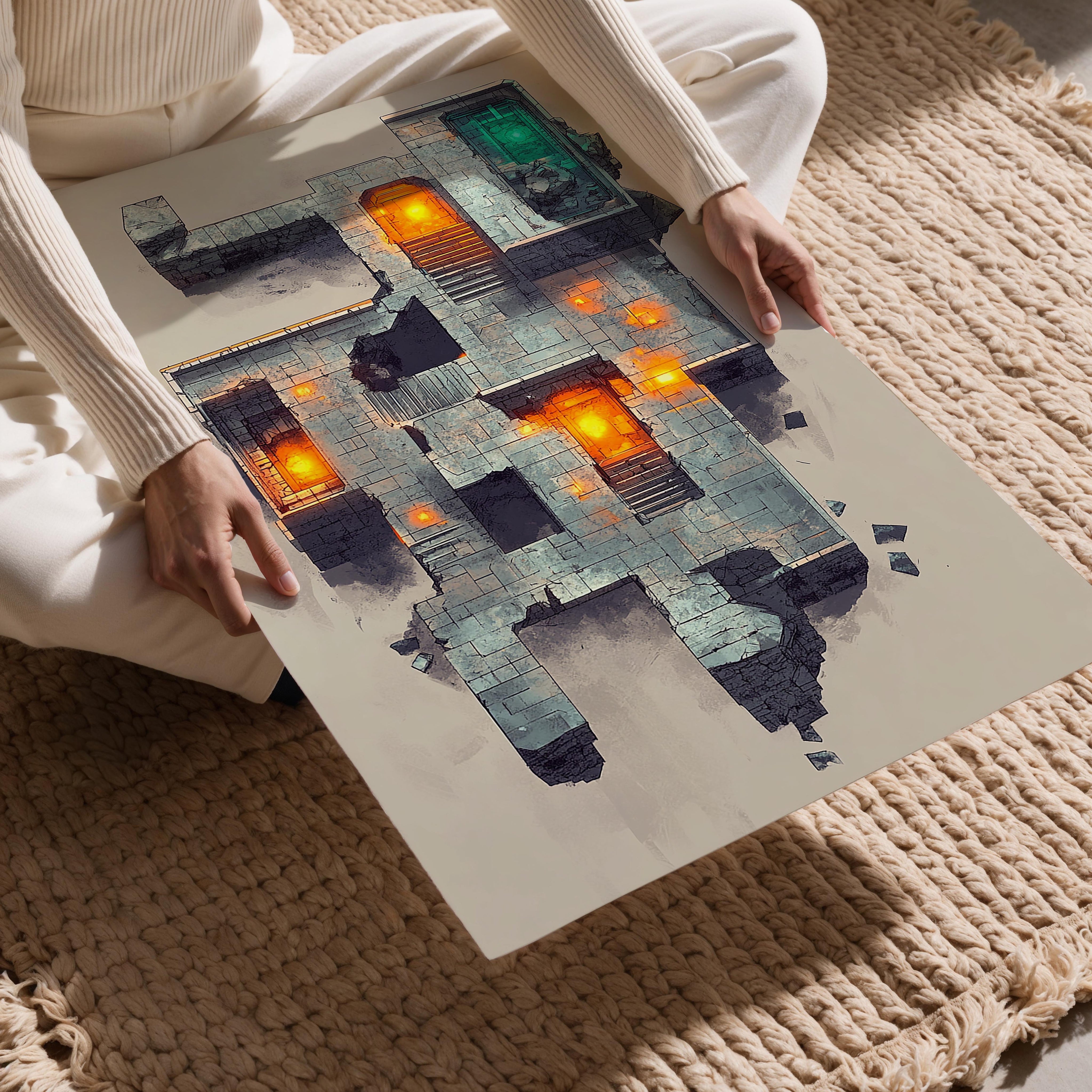 This image depicts the intricate layout of a ruined dungeon with warm glowing lights and mysterious teal accents. The cracked stonework and fragmented walls evoke a sense of mystery and exploration. It’s a perfect addition for fans of fantasy RPGs, dungeon-crawling adventures, or as decor in a game room or creative workspace.