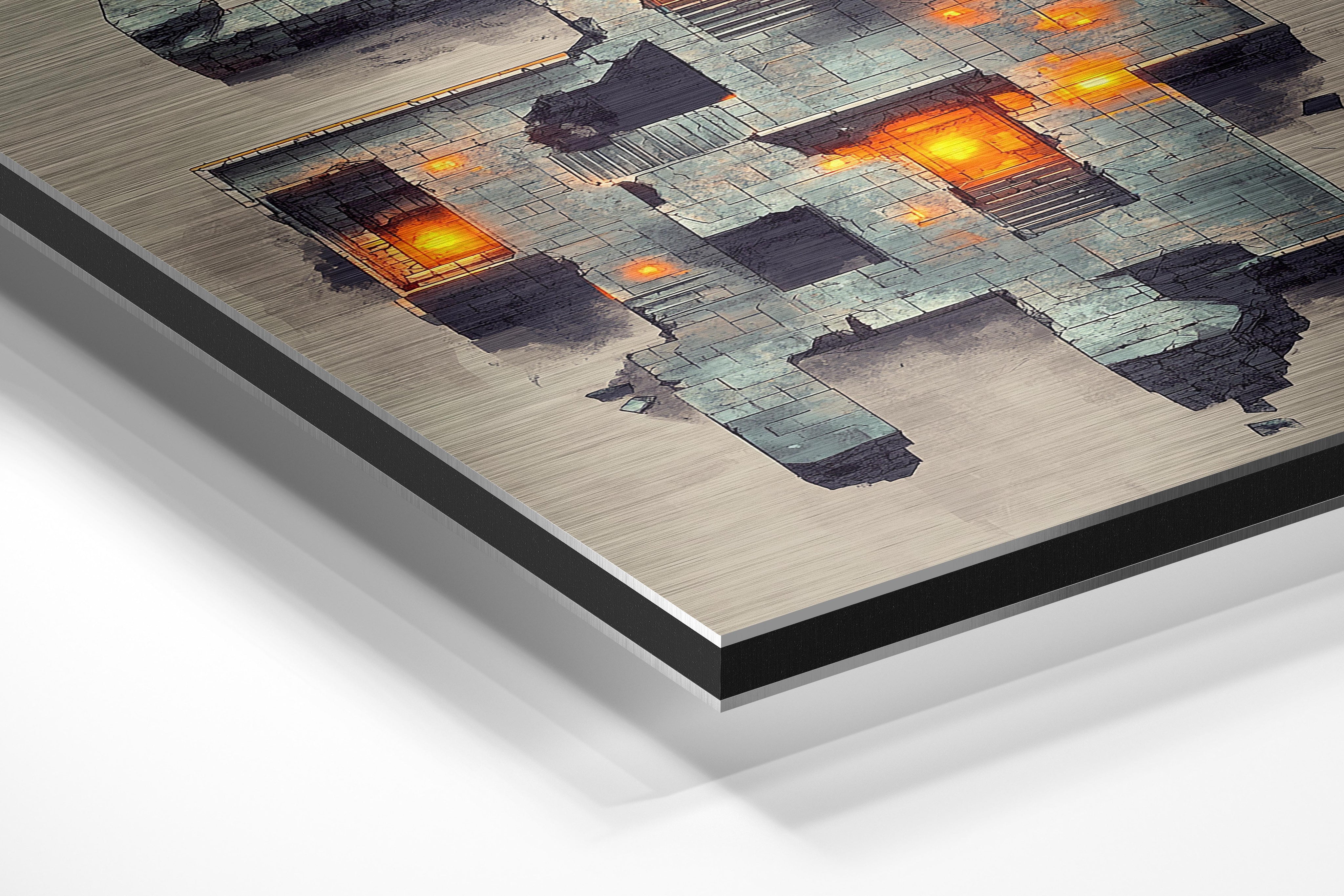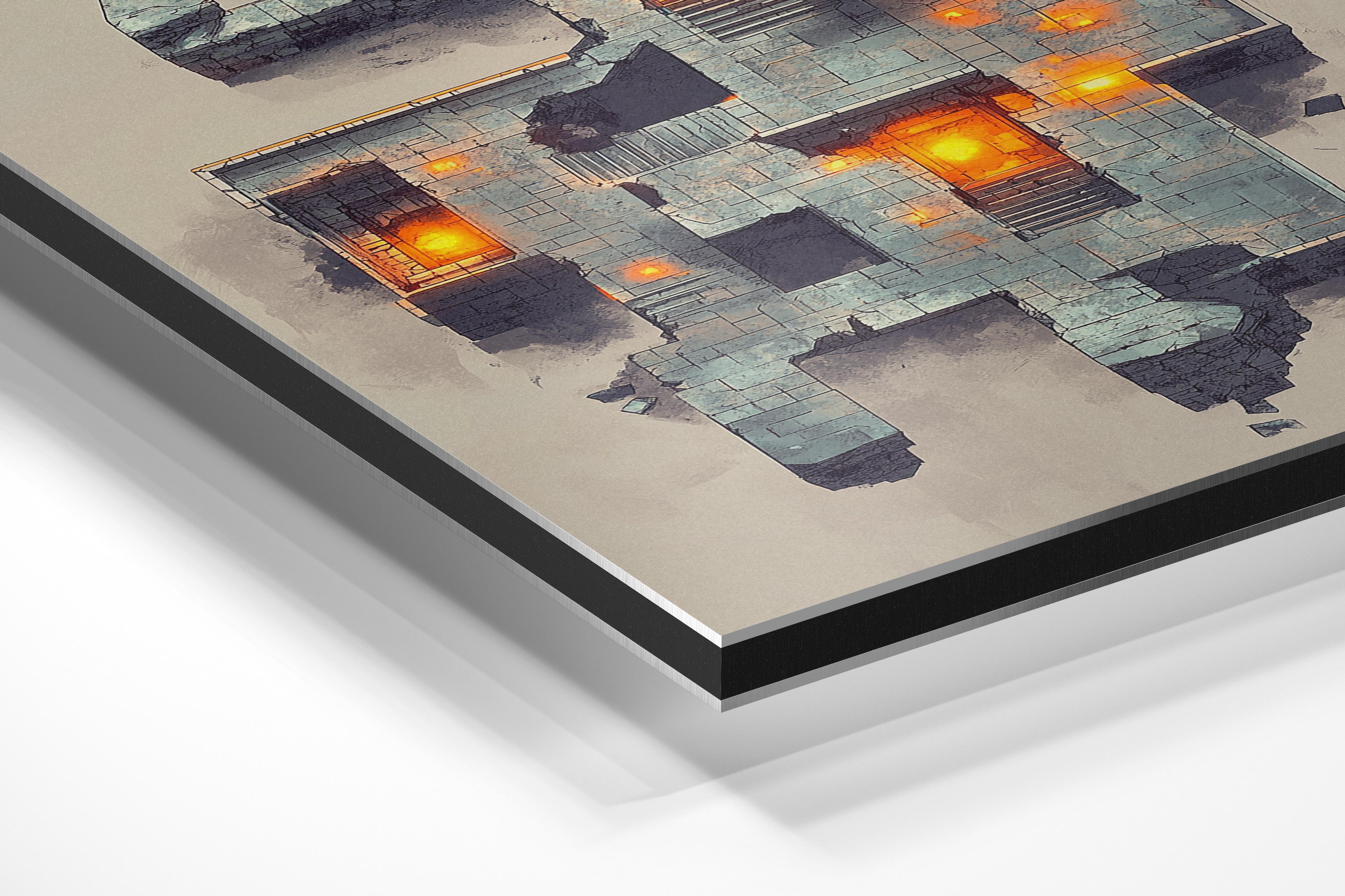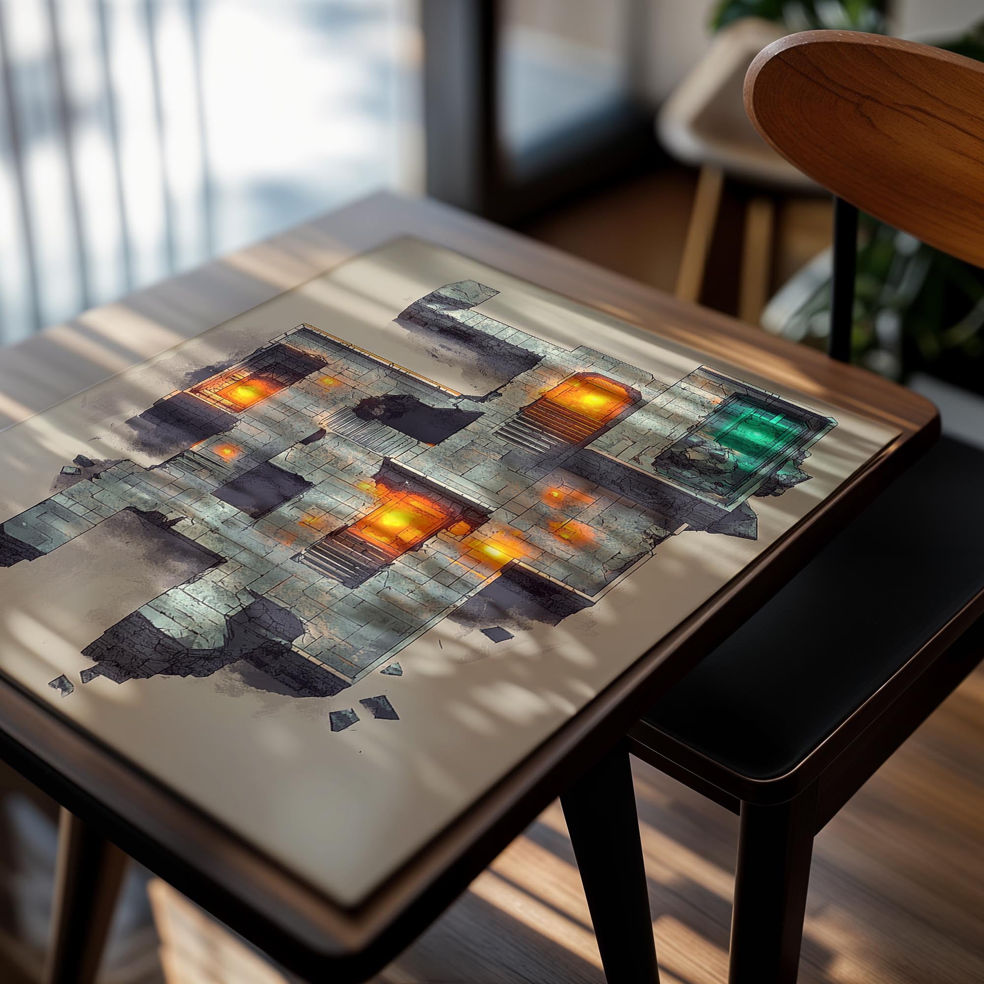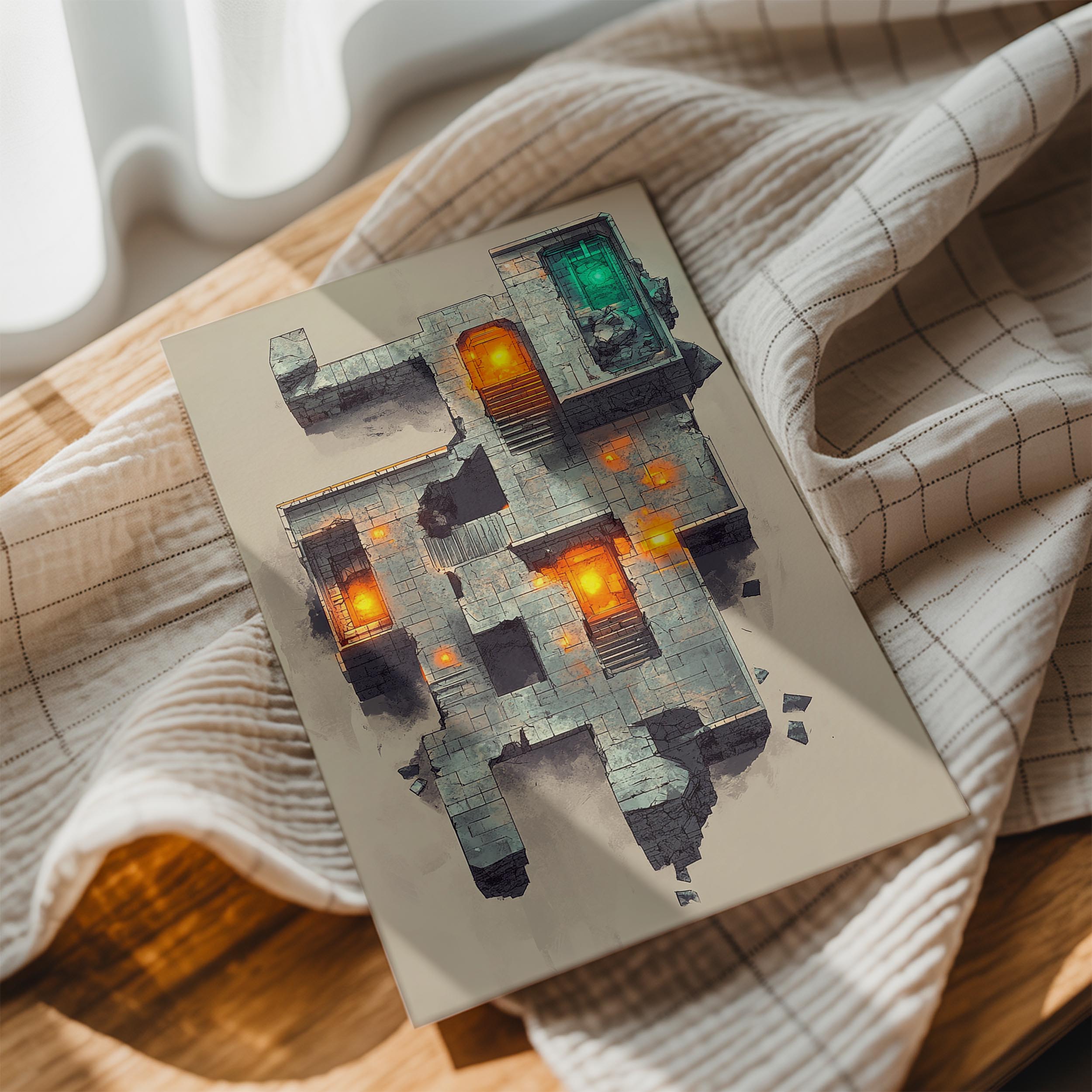 This image depicts the intricate layout of a ruined dungeon with warm glowing lights and mysterious teal accents. The cracked stonework and fragmented walls evoke a sense of mystery and exploration. It’s a perfect addition for fans of fantasy RPGs, dungeon-crawling adventures, or as decor in a game room or creative workspace.