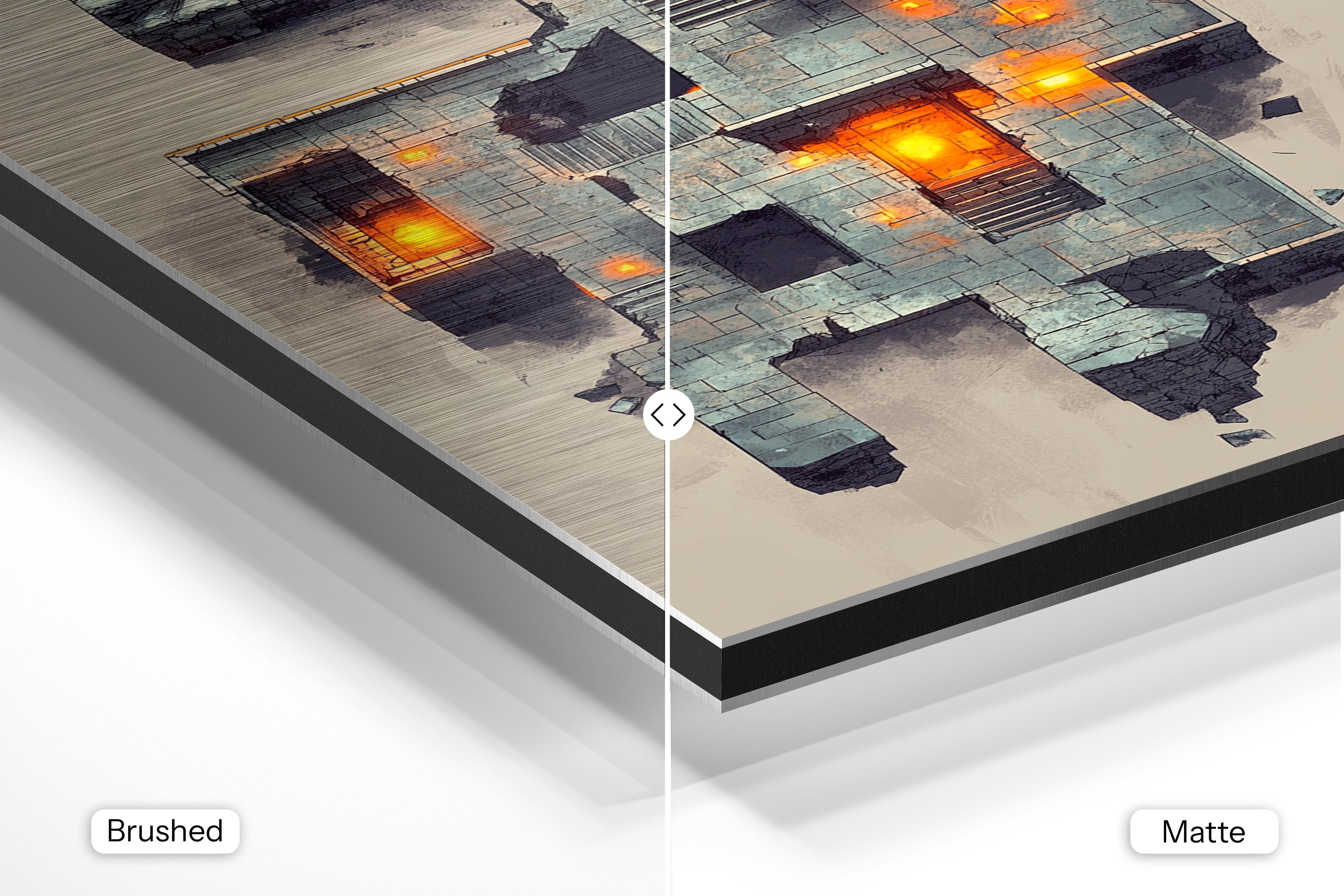 - Brushed Aluminum, on the other hand, features a raw metallic texture with visible brush strokes. Whites and highlights in your image let the silver surface show through, adding a dramatic, shimmering effect. Ideal for black-and-white images, minimalist designs, or abstract art, it creates a bold, industrial vibe with a modern edge.