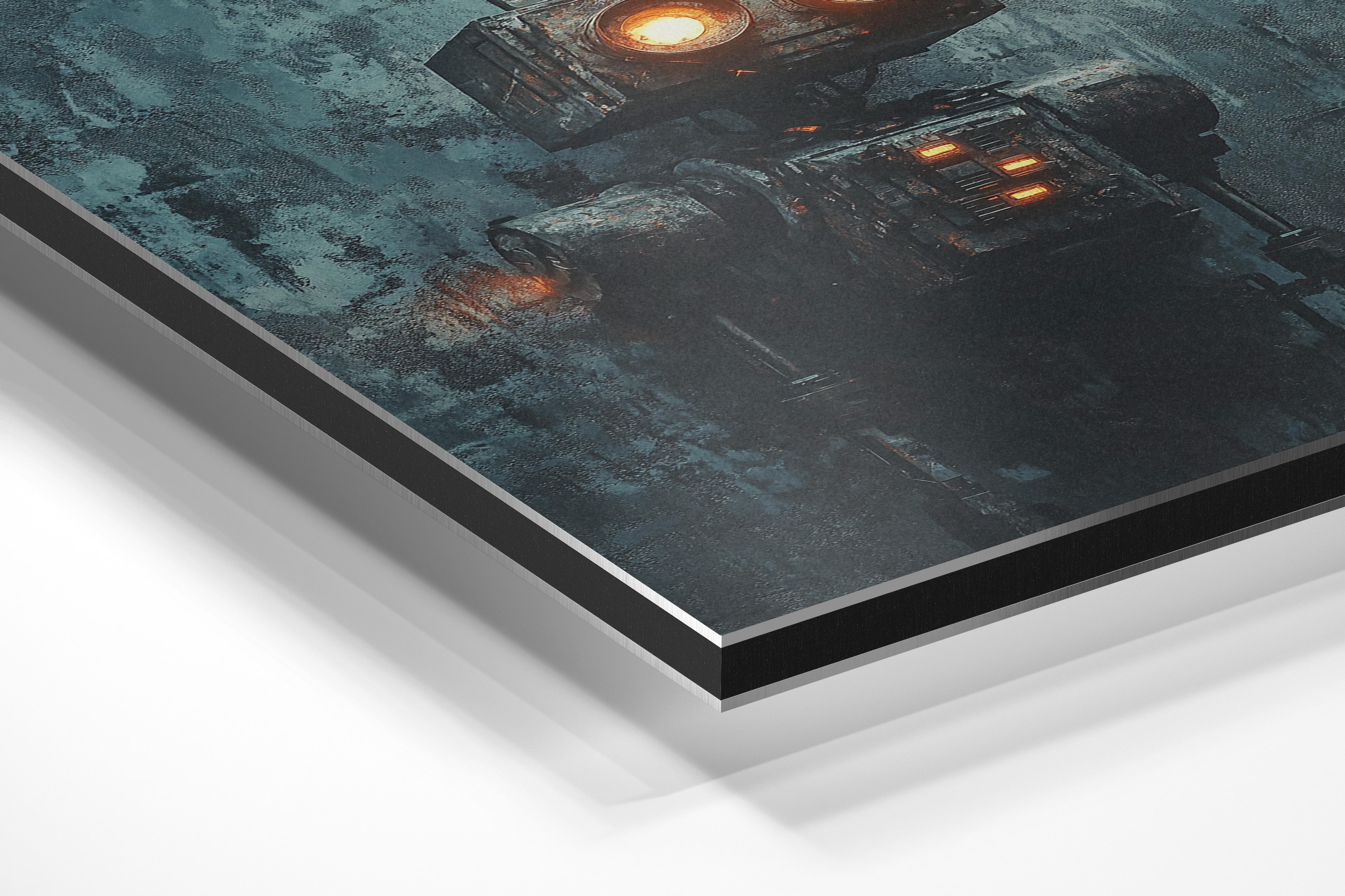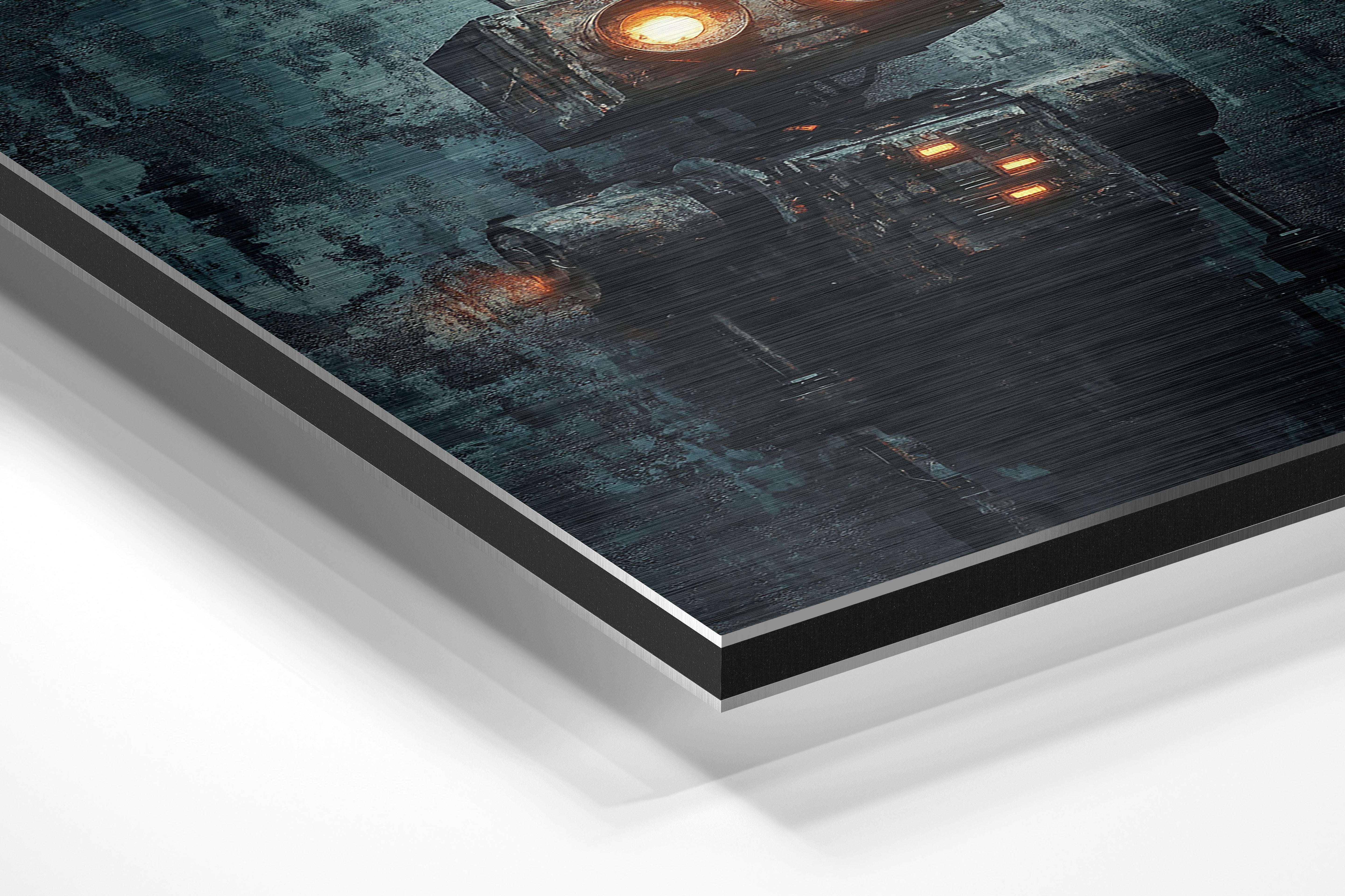 An evocative image of a rustic robot leaning against a weathered wall, its glowing eyes adding a mysterious and melancholic vibe. The industrial textures and moody lighting make this piece ideal for modern or industrial-style interiors. It offers a unique blend of technology and art that sparks curiosity.