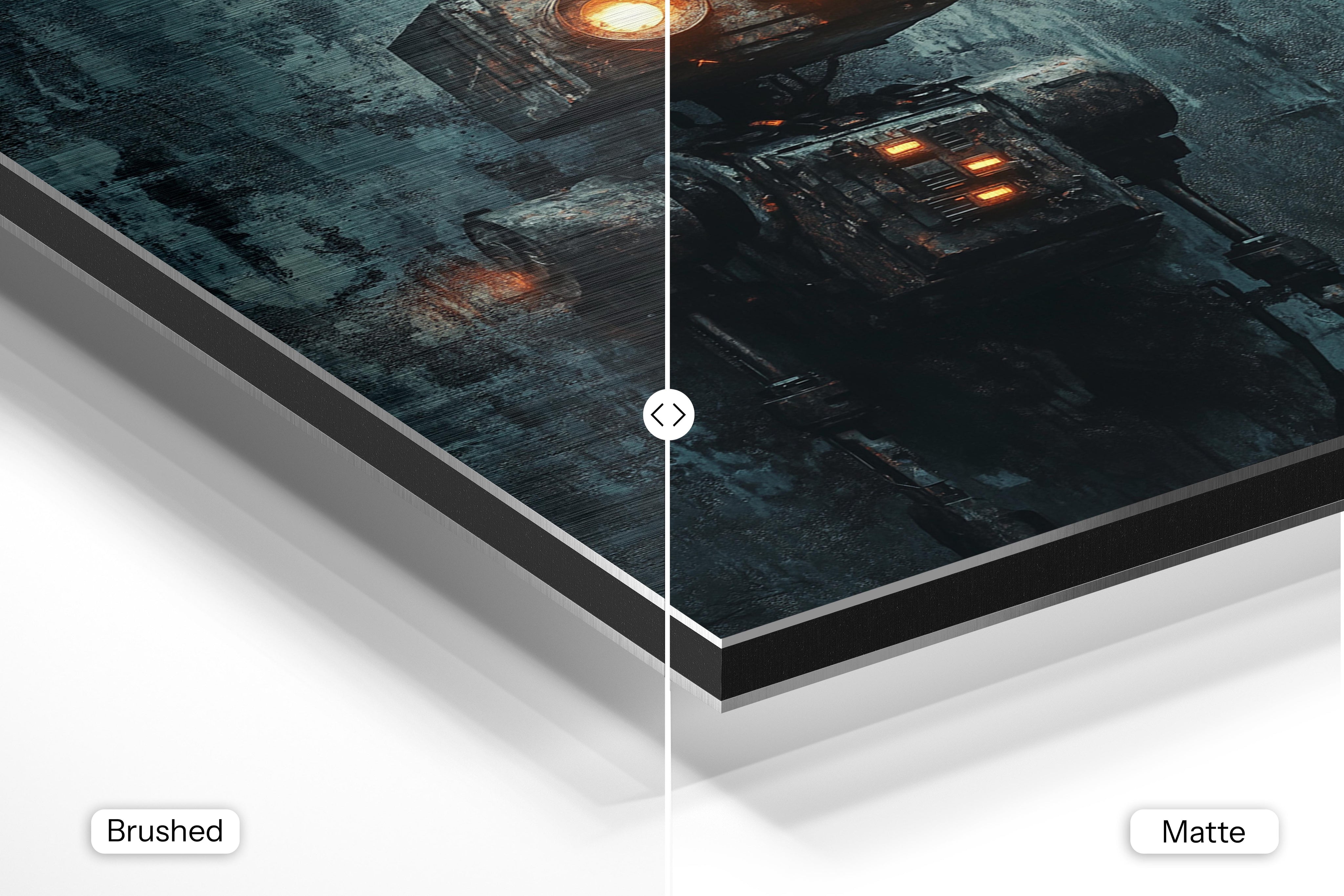 - Brushed Aluminum, on the other hand, features a raw metallic texture with visible brush strokes. Whites and highlights in your image let the silver surface show through, adding a dramatic, shimmering effect. Ideal for black-and-white images, minimalist designs, or abstract art, it creates a bold, industrial vibe with a modern edge.