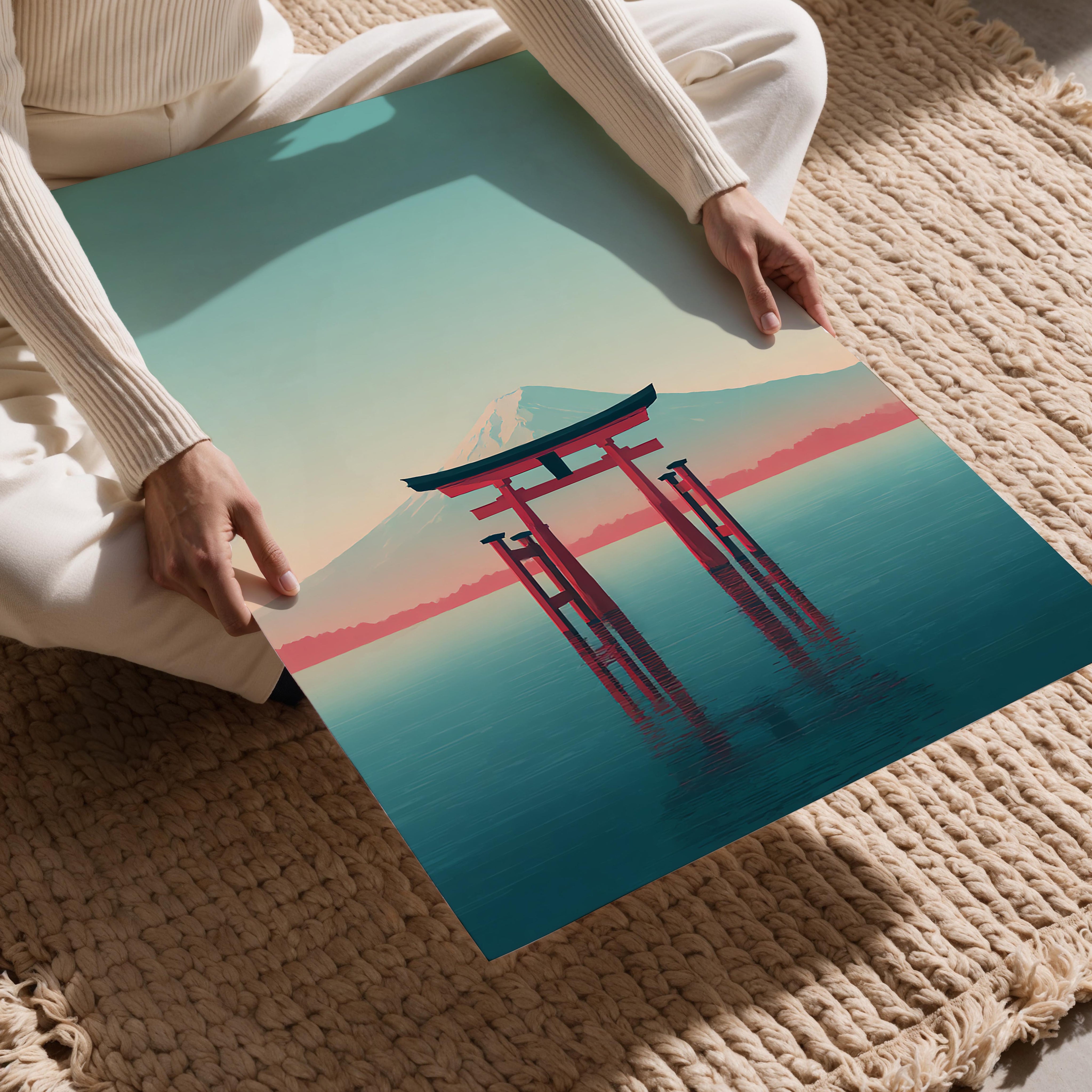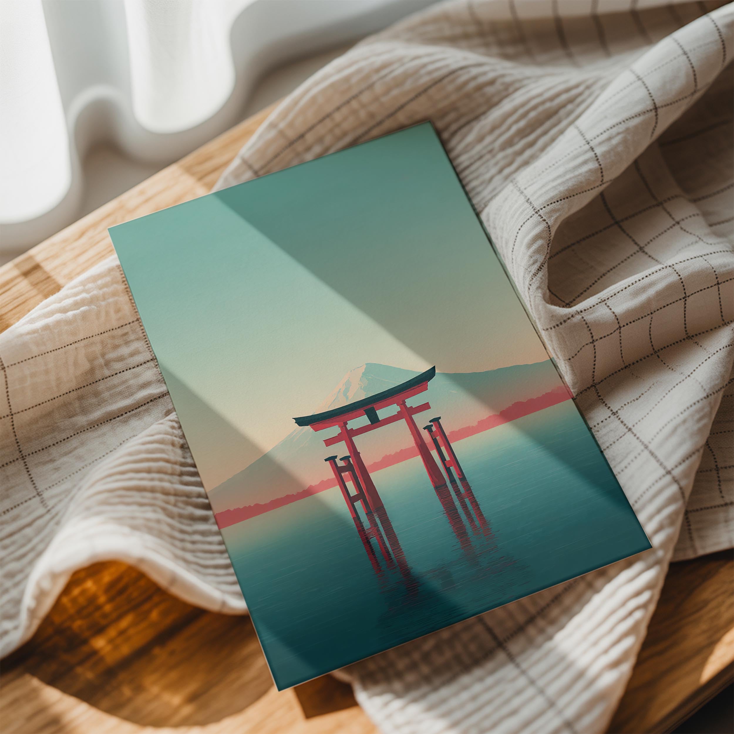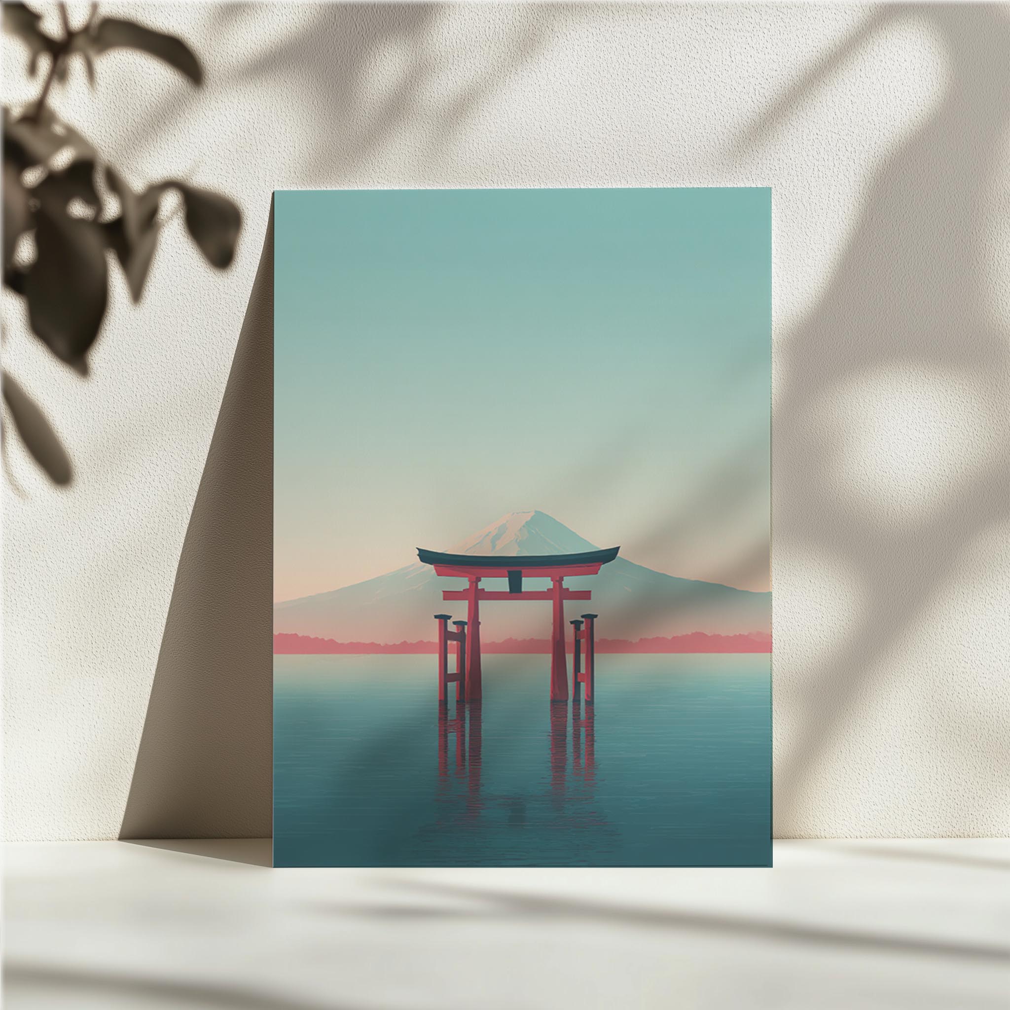 Set against the backdrop of a towering Mount Fuji under a soft pastel sky, this image centers on a single Torii gate rising from placid waters. The gate's symmetry and the way it is reflected in the water below add a sense of balance and peace. The soft hues suggest dawn or dusk, inviting reflection and calm. Ideal for meditation rooms, modern minimalist interiors, or offices that aim to convey calmness and clarity. This image offers a strong spiritual aesthetic that resonates with themes of transition, purity, and quiet power.