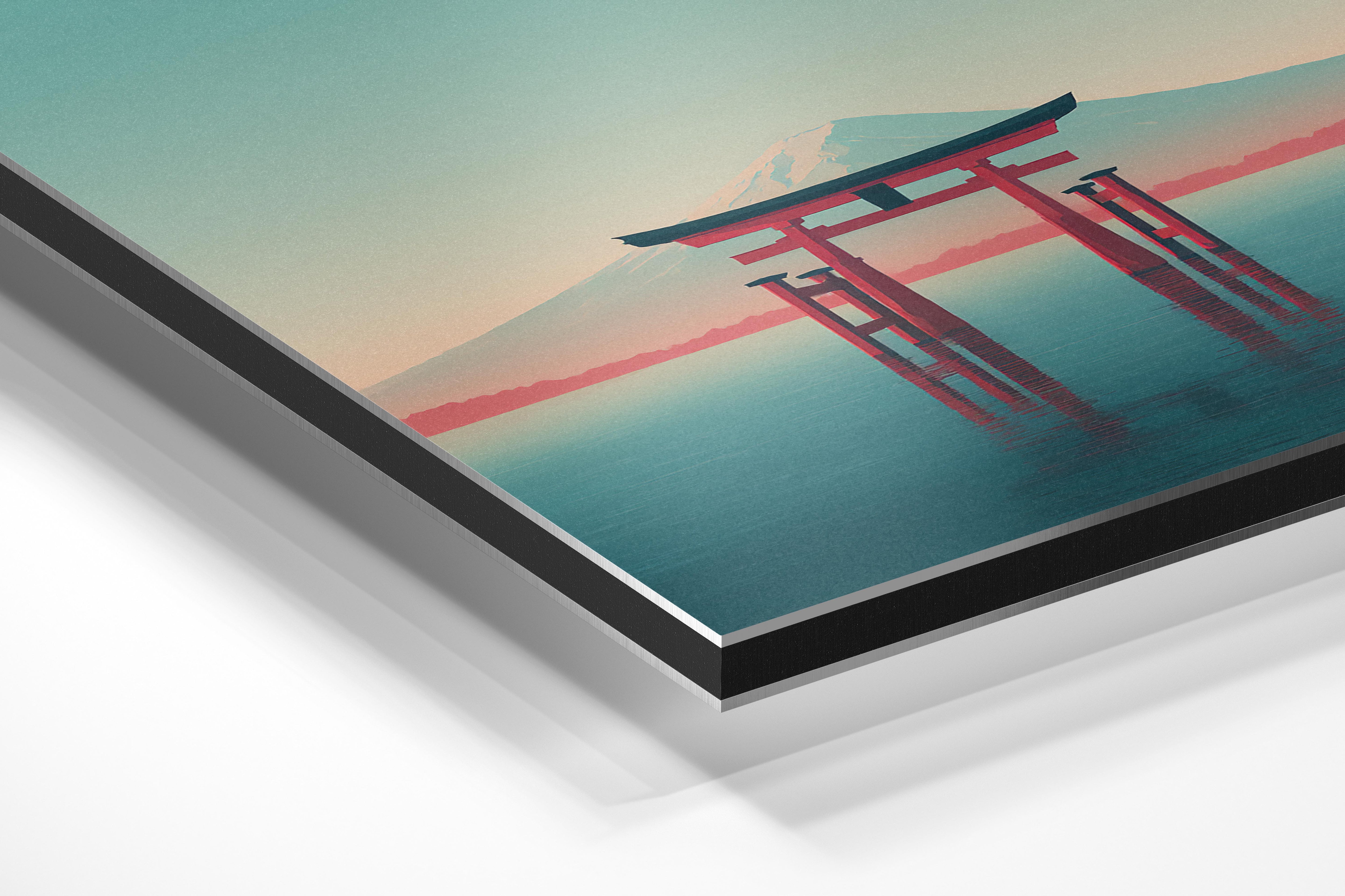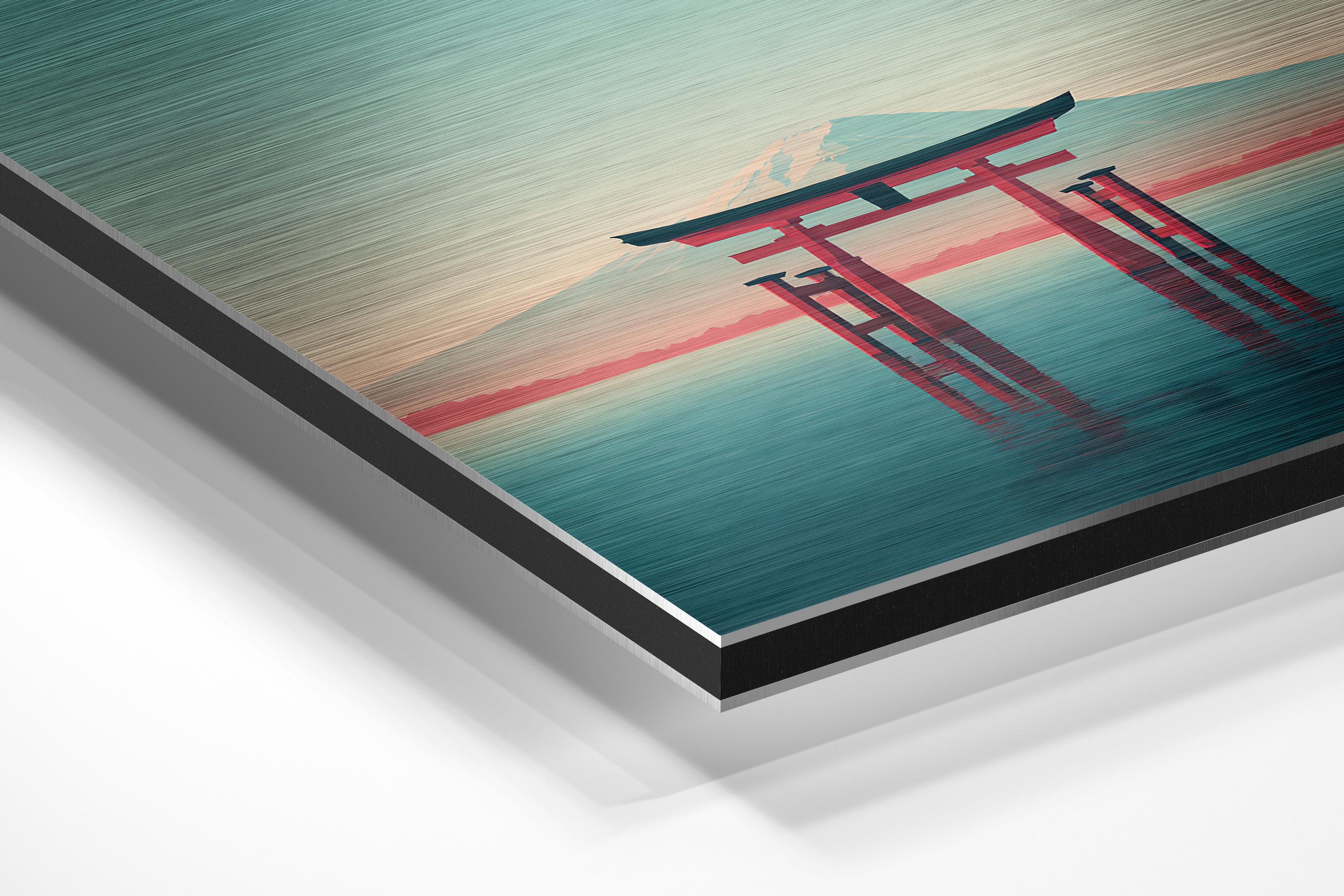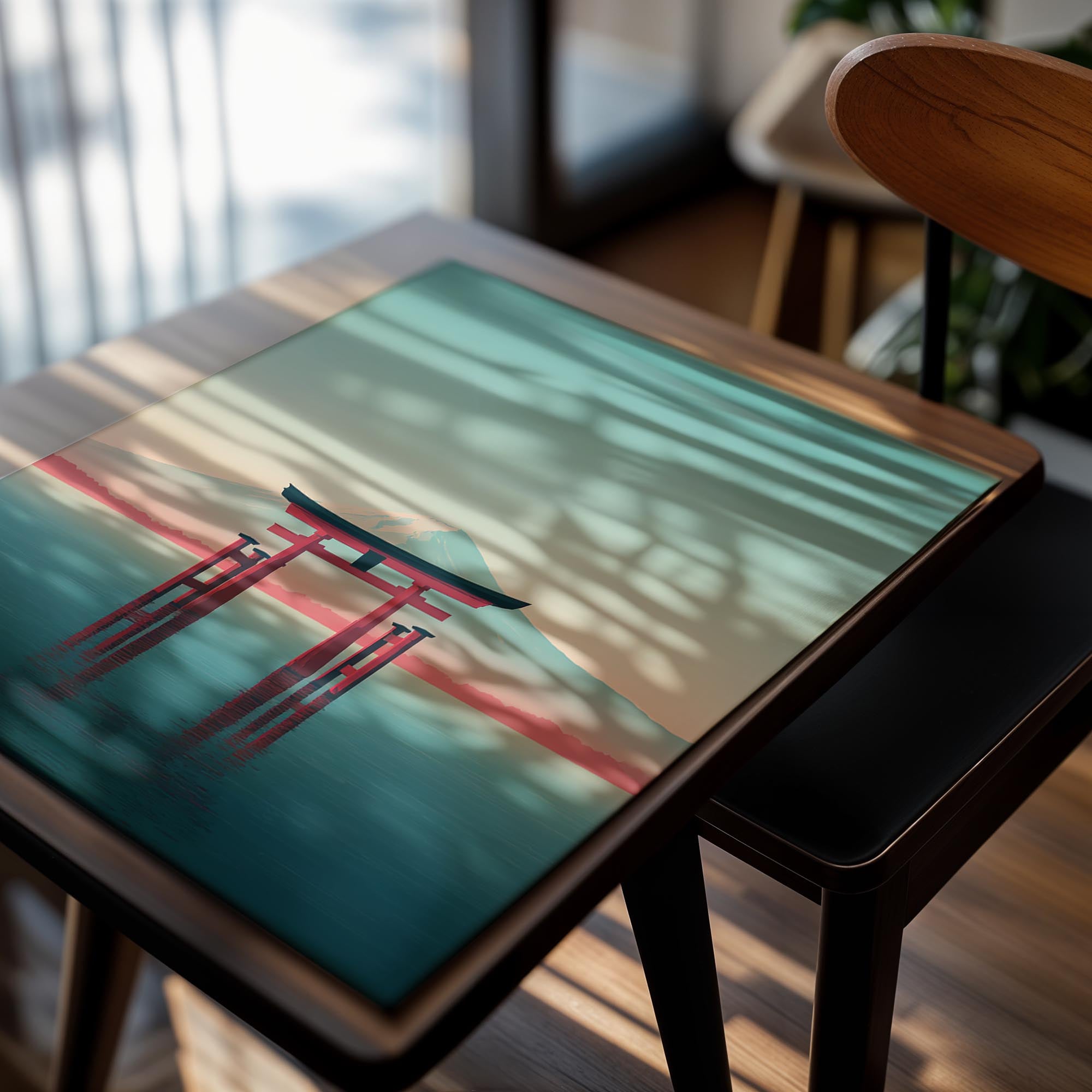 Set against the backdrop of a towering Mount Fuji under a soft pastel sky, this image centers on a single Torii gate rising from placid waters. The gate's symmetry and the way it is reflected in the water below add a sense of balance and peace. The soft hues suggest dawn or dusk, inviting reflection and calm. Ideal for meditation rooms, modern minimalist interiors, or offices that aim to convey calmness and clarity. This image offers a strong spiritual aesthetic that resonates with themes of transition, purity, and quiet power.