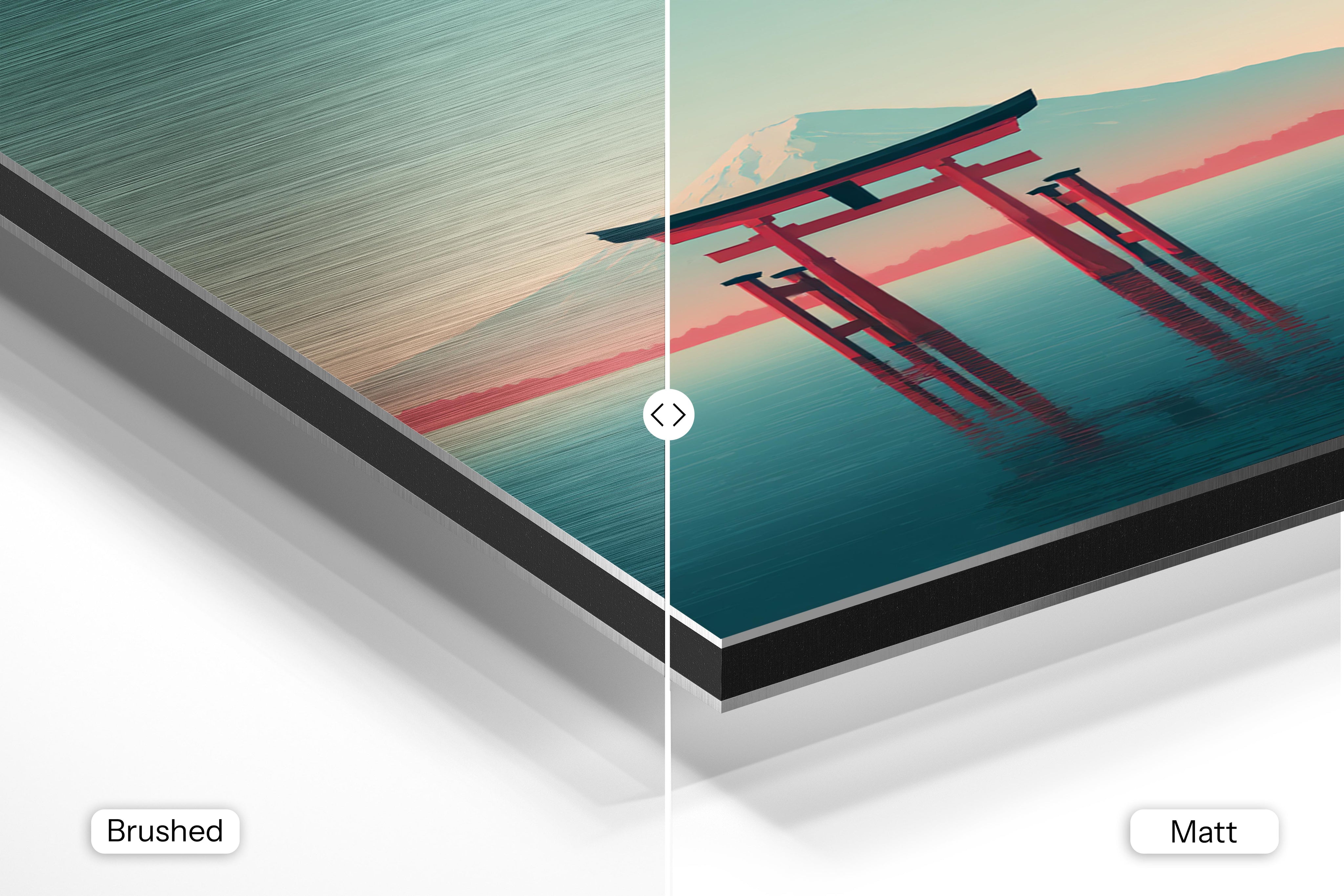 - Brushed Aluminum, on the other hand, features a raw metallic texture with visible brush strokes. Whites and highlights in your image let the silver surface show through, adding a dramatic, shimmering effect. Ideal for black-and-white images, minimalist designs, or abstract art, it creates a bold, industrial vibe with a modern edge.