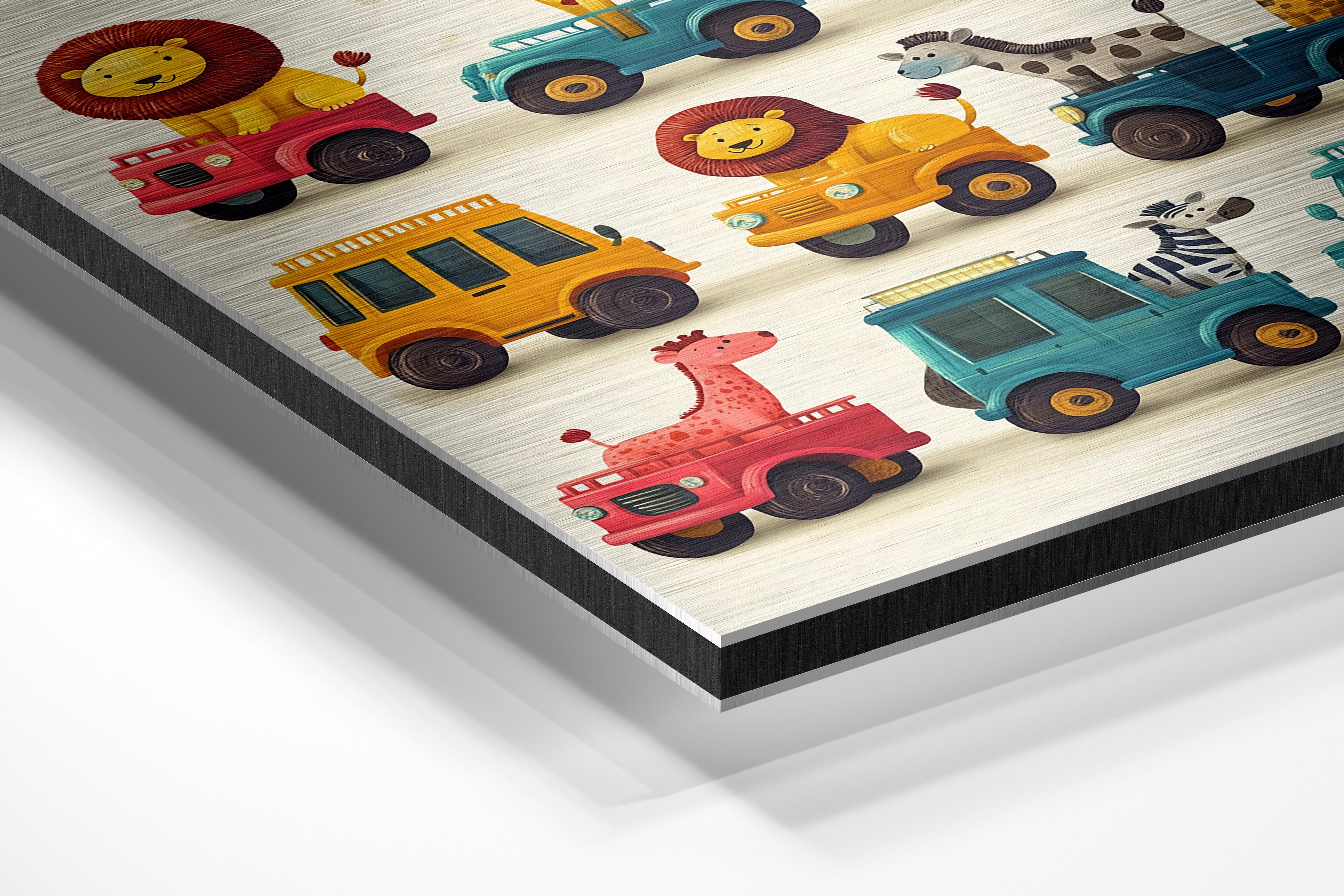 A playful illustration featuring safari animals such as lions, giraffes, and zebras riding colorful toy cars. The vibrant and cheerful design captures the excitement and fun of a children’s toy safari. This artwork is perfect for playrooms or spaces designed to inspire imagination and adventure. Its bold colors and whimsical theme make it a standout choice for young explorers.
