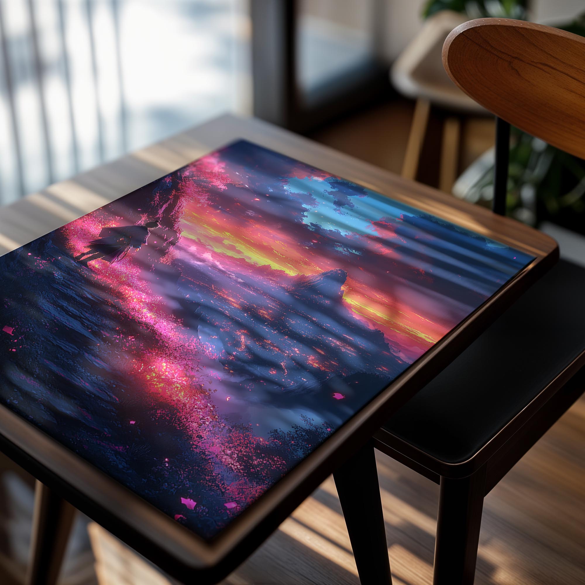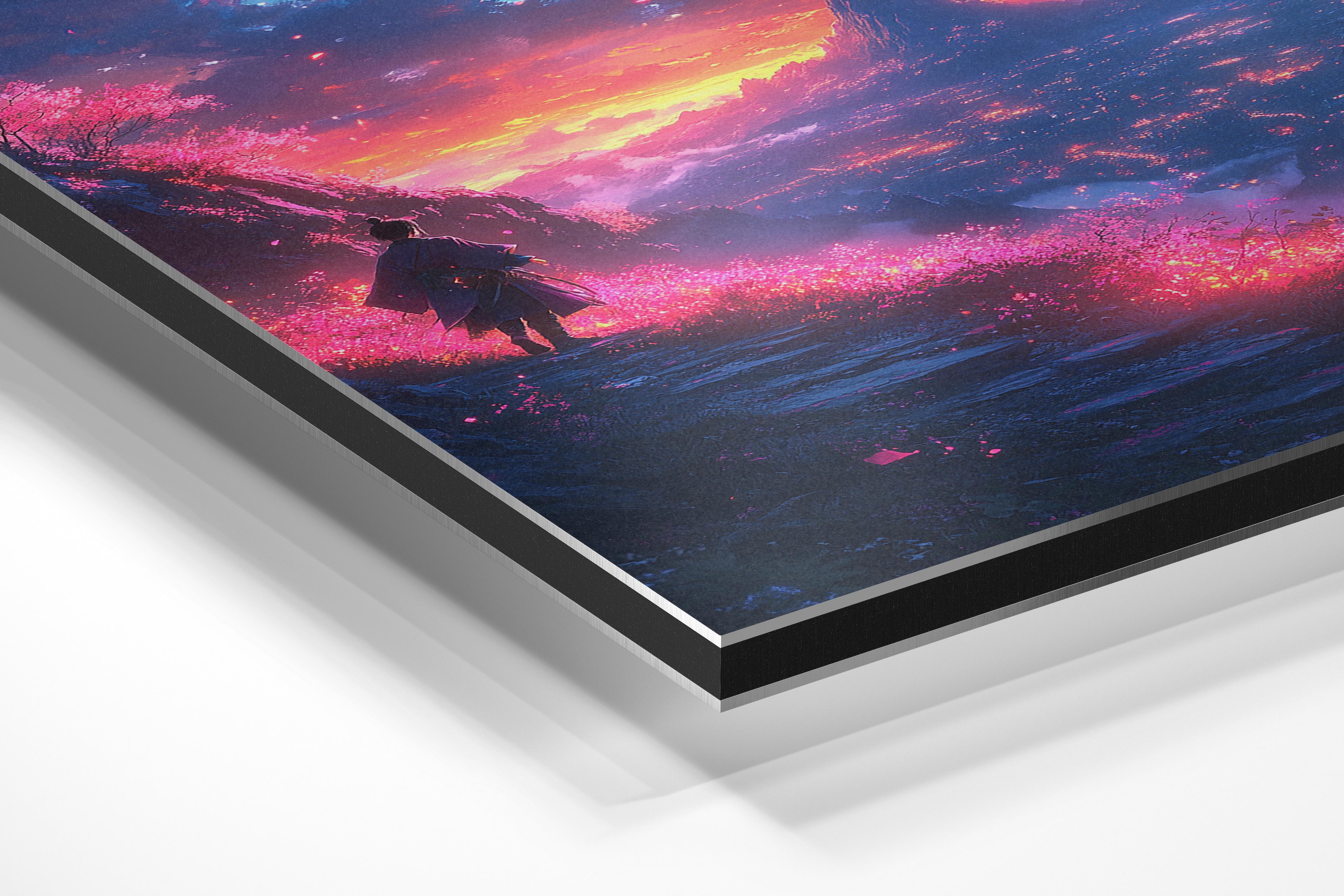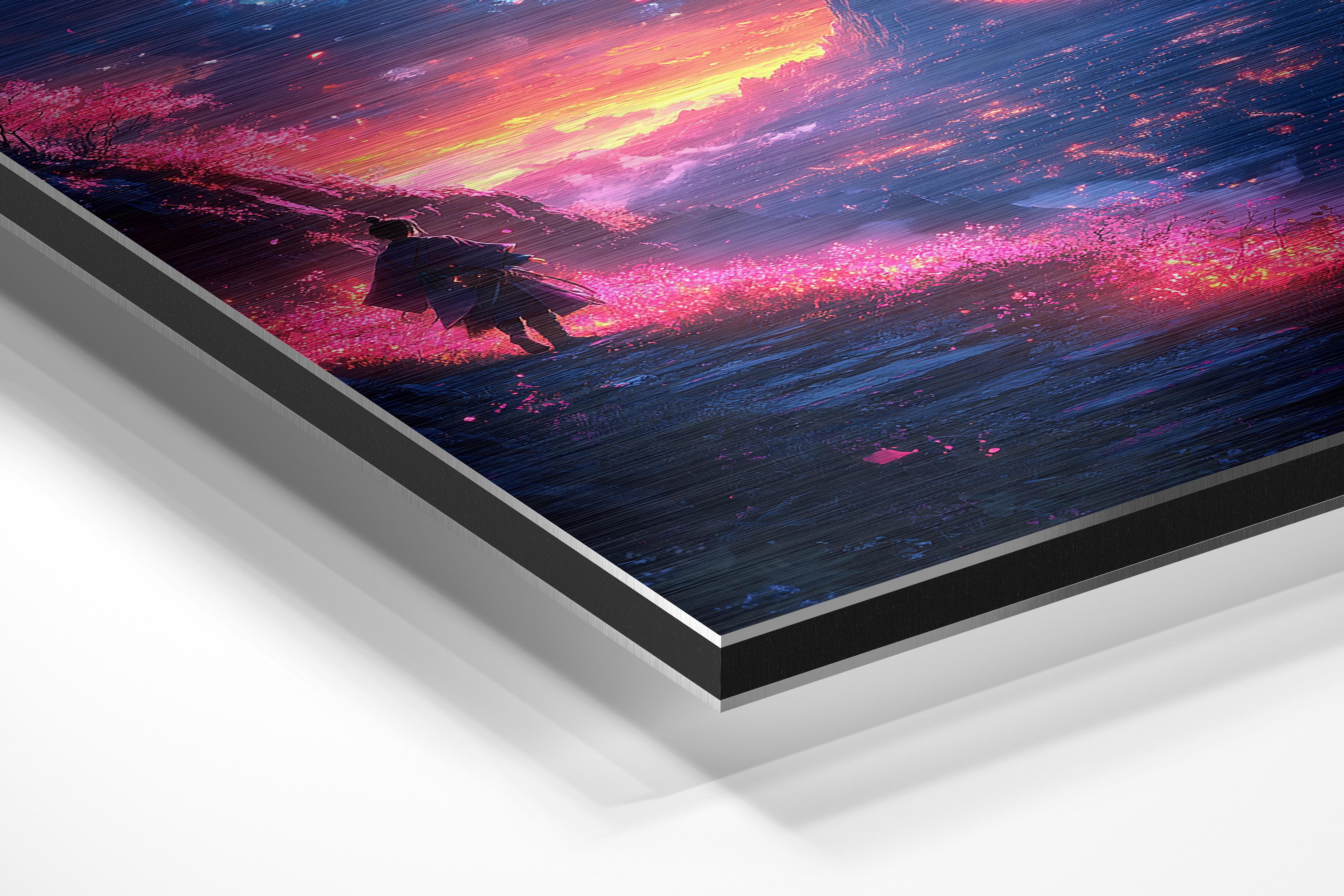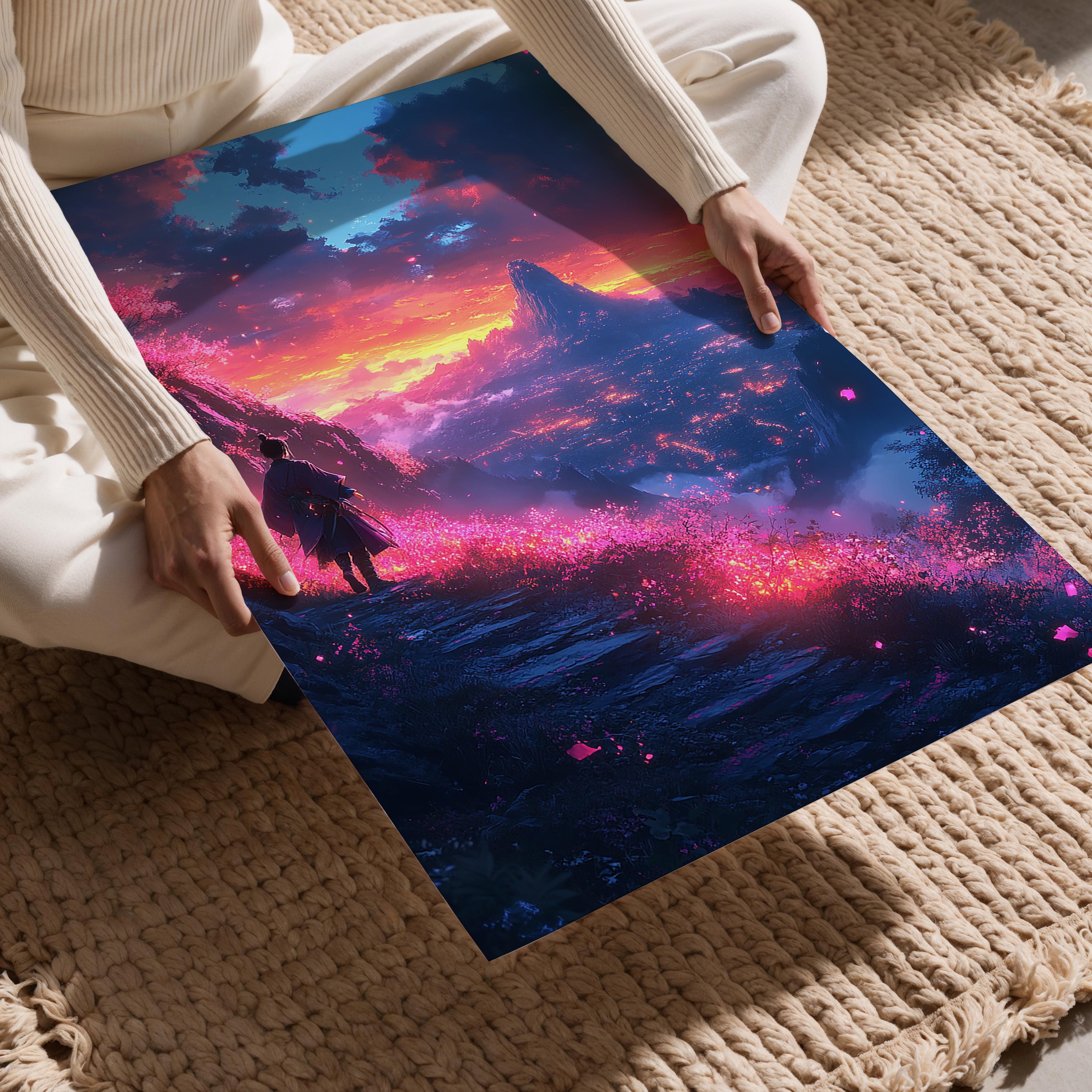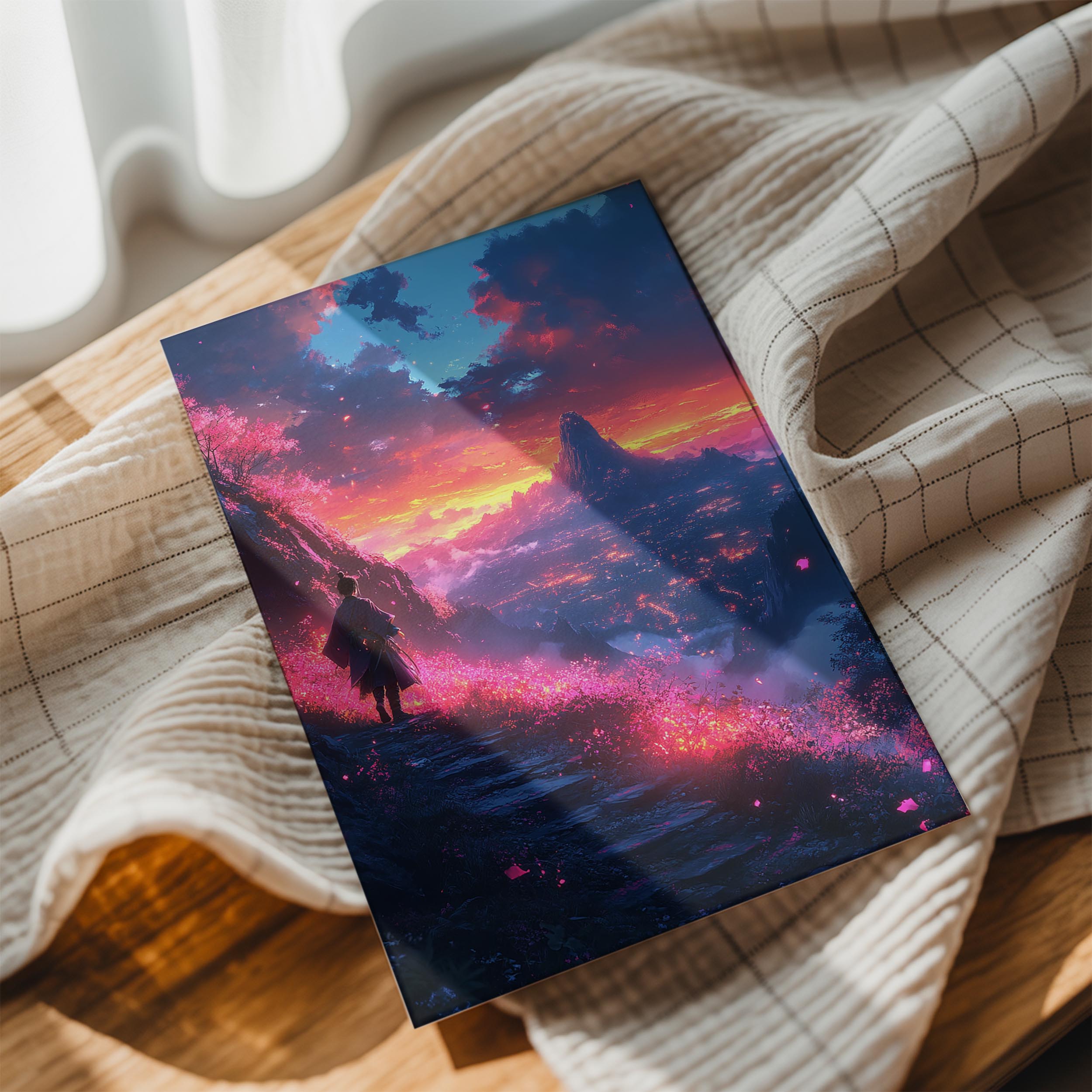A breathtaking landscape featuring a lone samurai overlooking a vast, illuminated cityscape at sunset. The glowing cherry blossoms and vivid colors evoke a sense of peace and wonder. This artwork is perfect for fantasy and nature lovers, adding an element of serenity and adventure to any space. Ideal for living rooms or art galleries that celebrate beauty and storytelling.