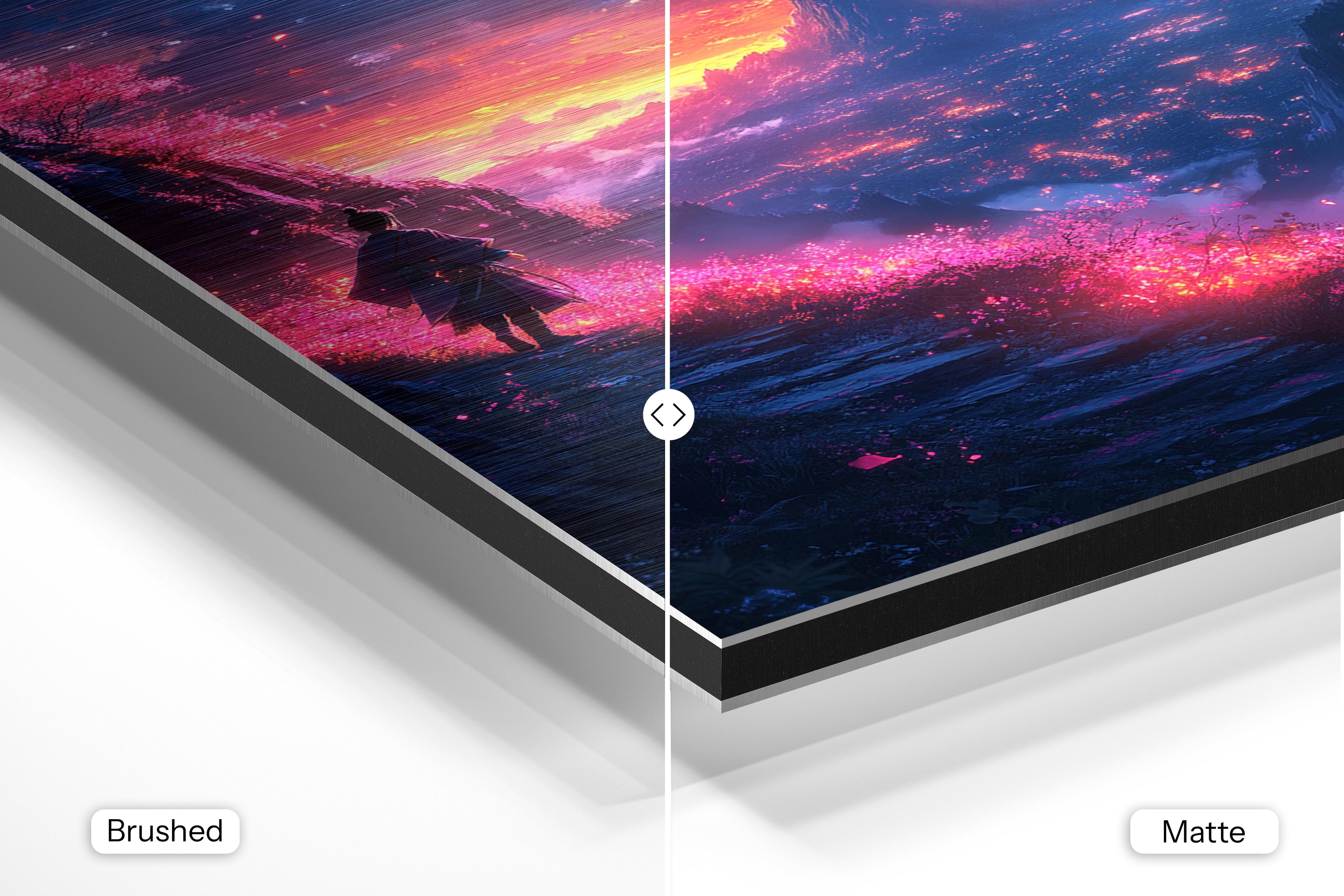 - Brushed Aluminum, on the other hand, features a raw metallic texture with visible brush strokes. Whites and highlights in your image let the silver surface show through, adding a dramatic, shimmering effect. Ideal for black-and-white images, minimalist designs, or abstract art, it creates a bold, industrial vibe with a modern edge.