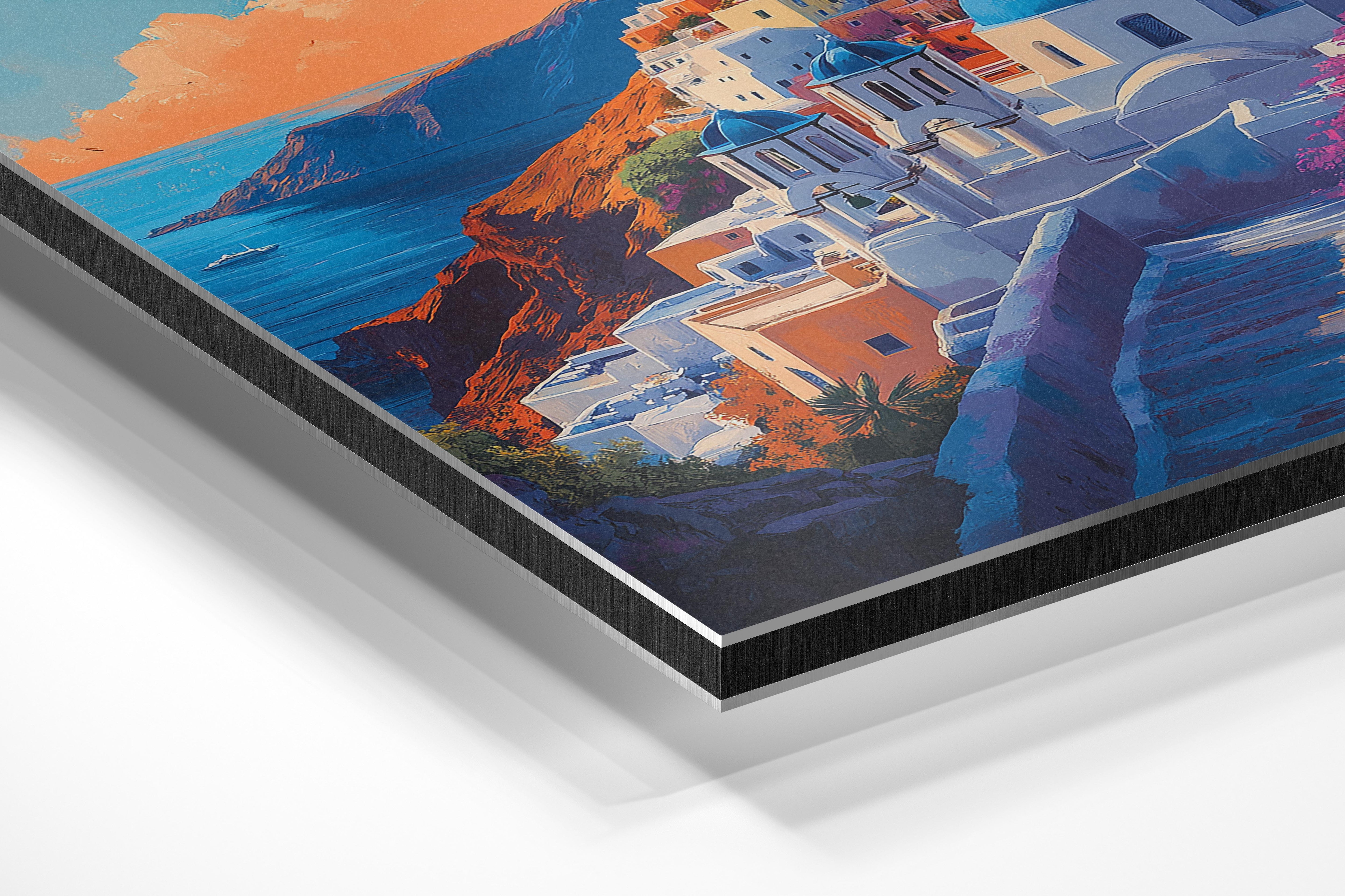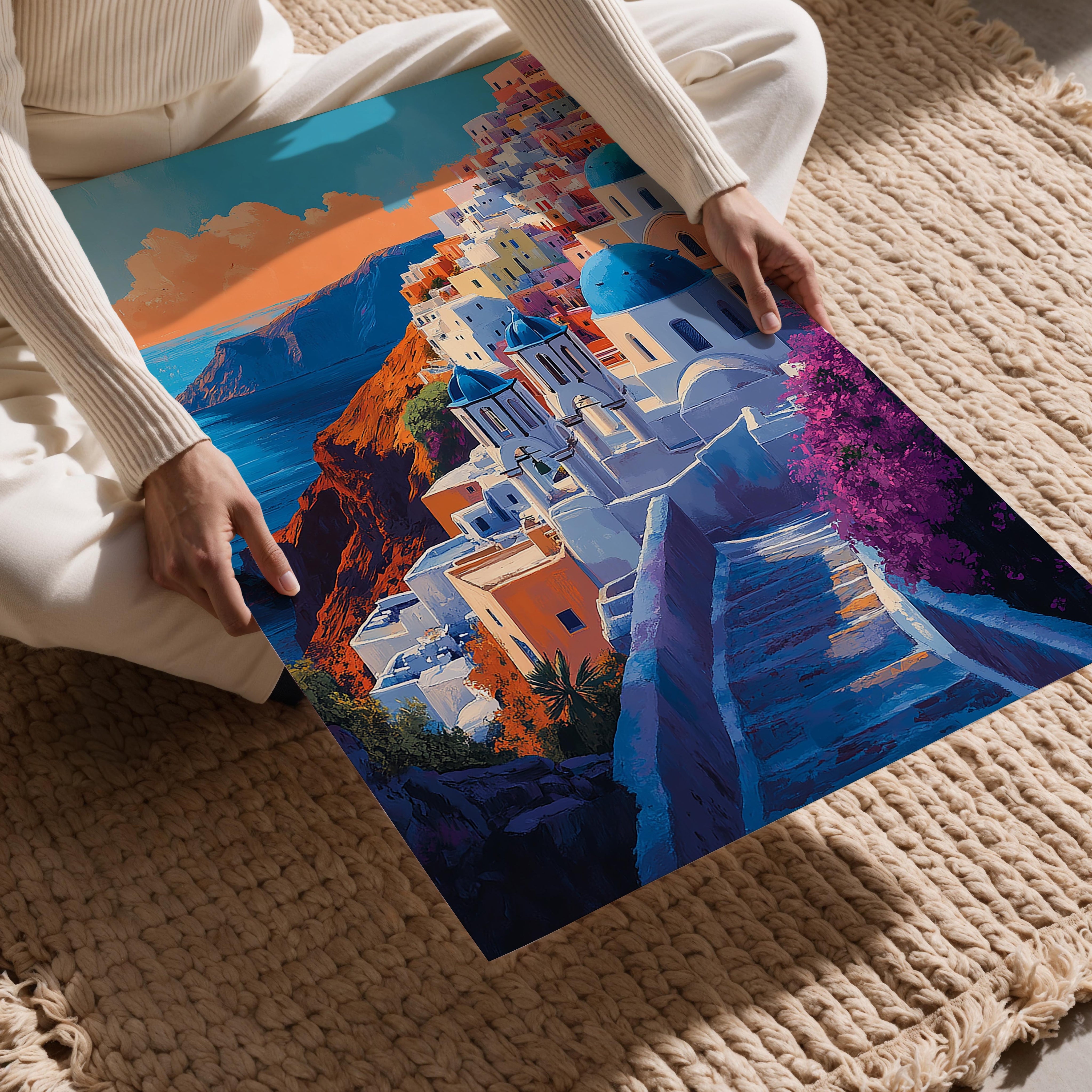 This picturesque image captures the iconic whitewashed buildings and blue-domed churches of Santorini, glowing warmly under a golden sunset. The vivid colors and stunning coastal views evoke a sense of romance and relaxation. This piece is ideal for anyone looking to add a touch of Mediterranean beauty to their space. Perfect for a bedroom, living room, or vacation home, it brings an air of wanderlust and serenity. The winding pathways and vibrant hues invite viewers to imagine themselves strolling through the charming streets of this idyllic Greek island.