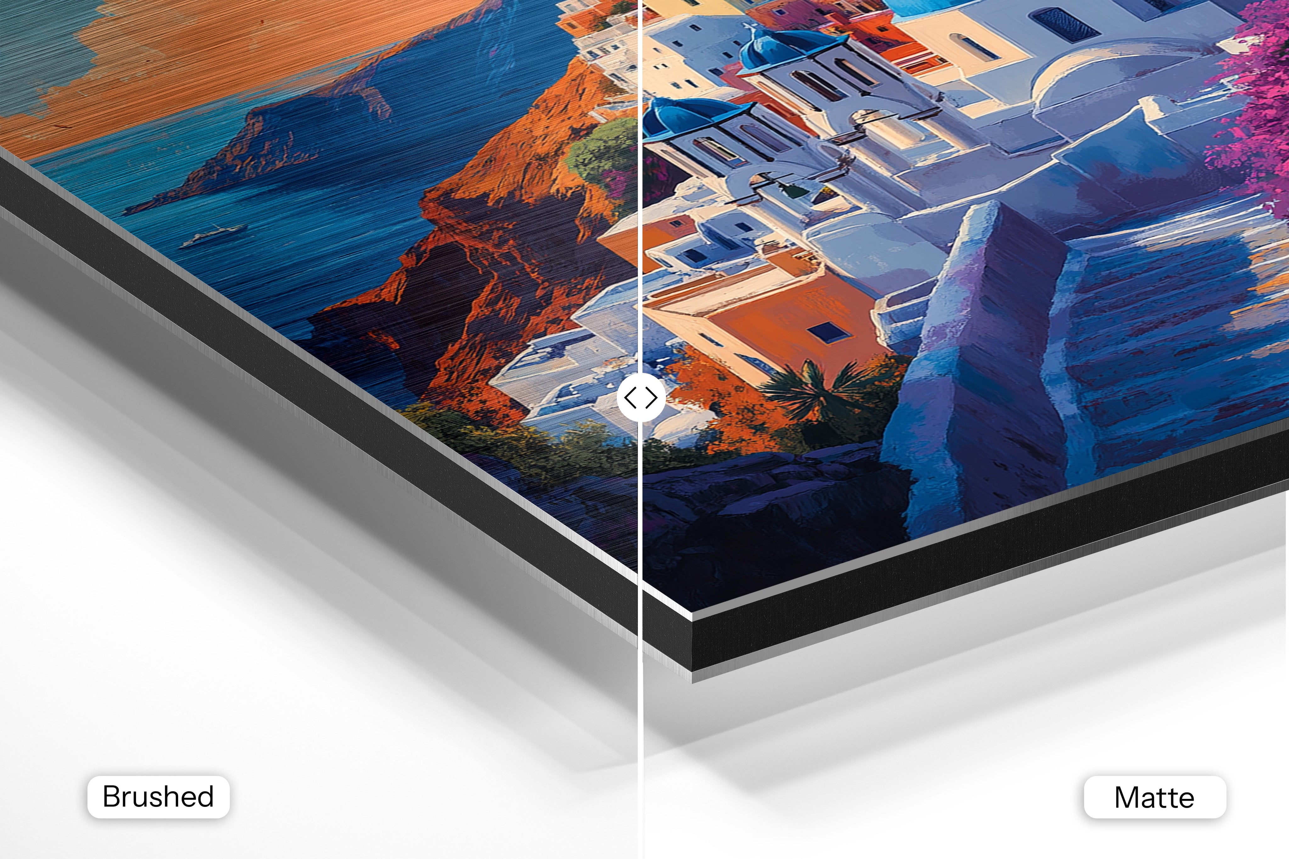 - Brushed Aluminum, on the other hand, features a raw metallic texture with visible brush strokes. Whites and highlights in your image let the silver surface show through, adding a dramatic, shimmering effect. Ideal for black-and-white images, minimalist designs, or abstract art, it creates a bold, industrial vibe with a modern edge.