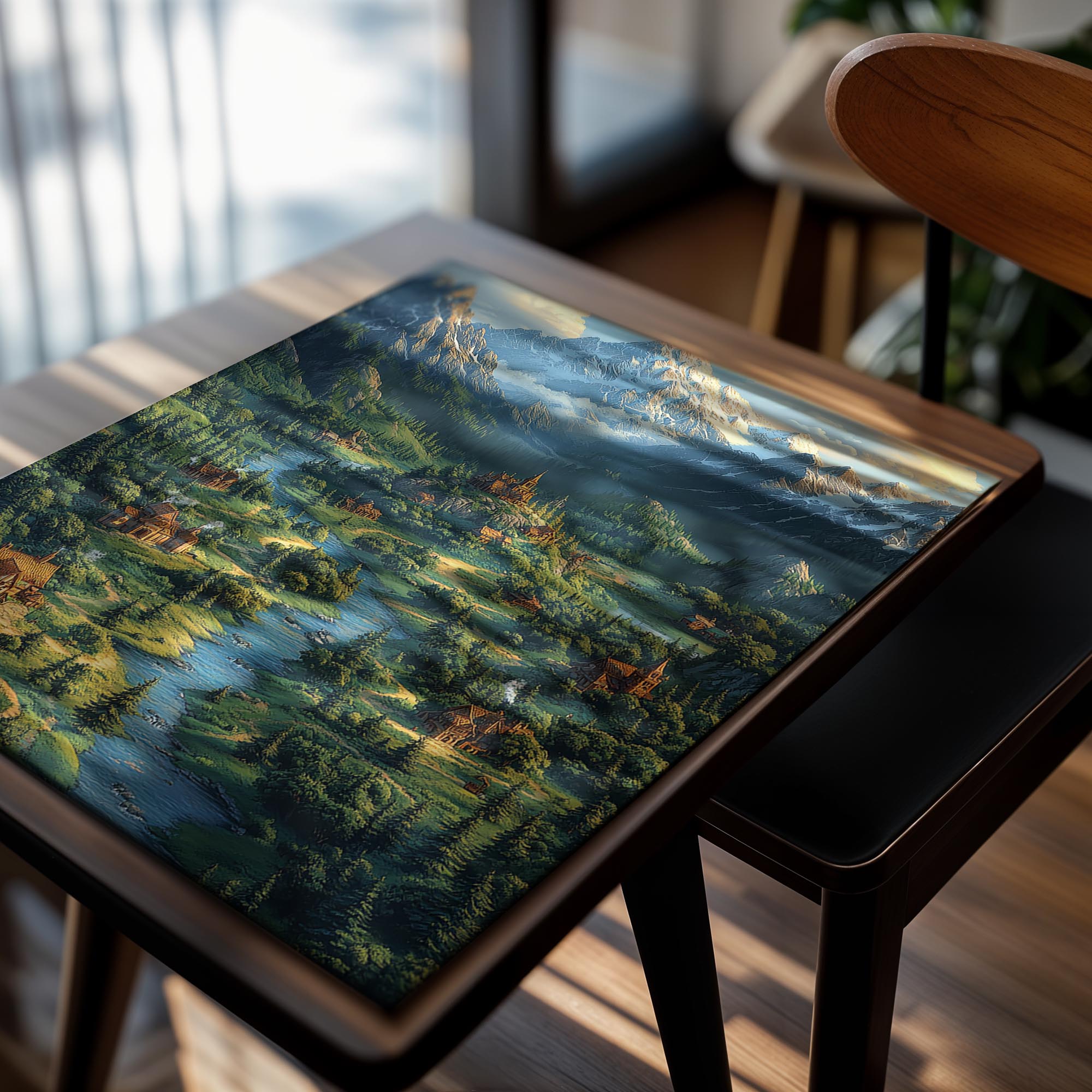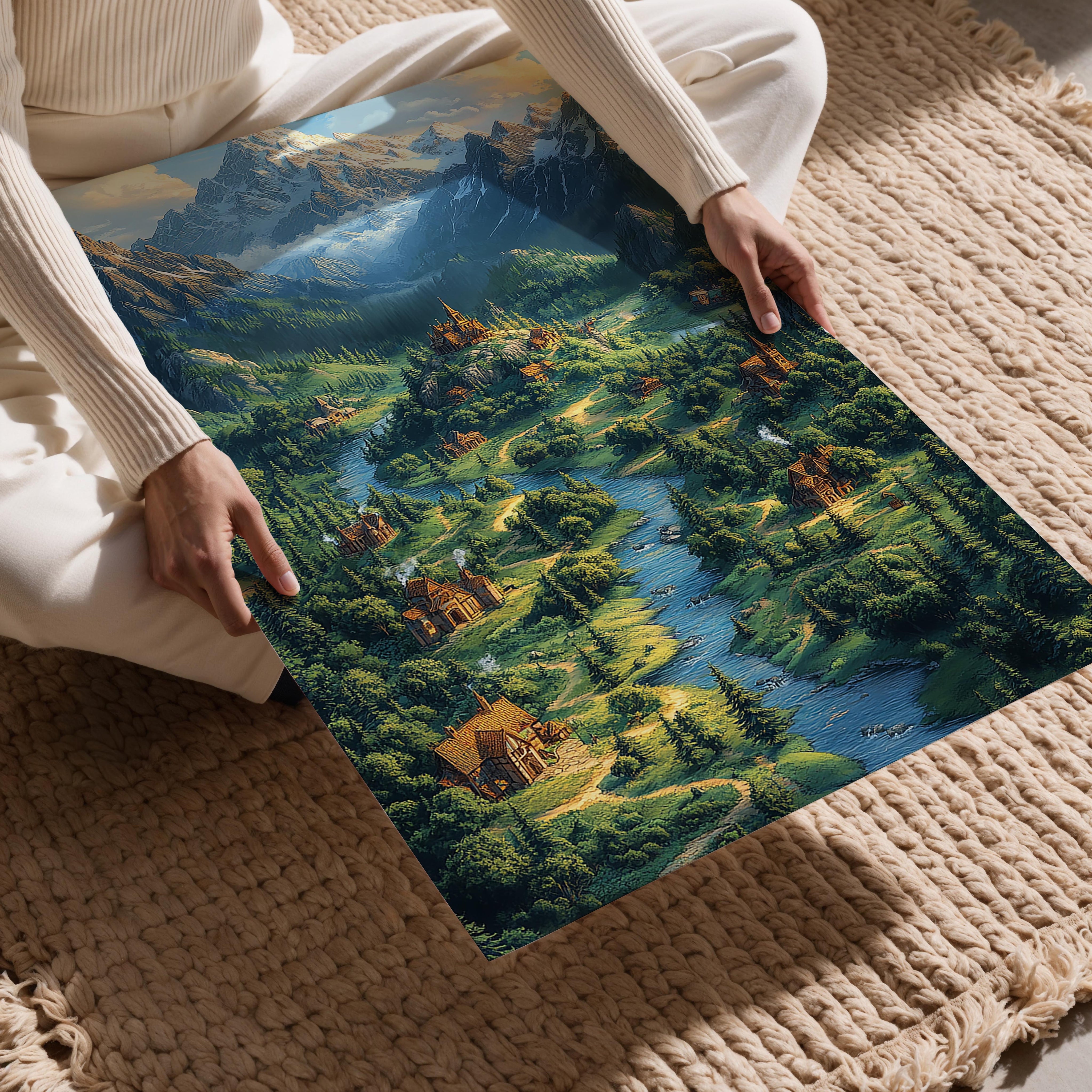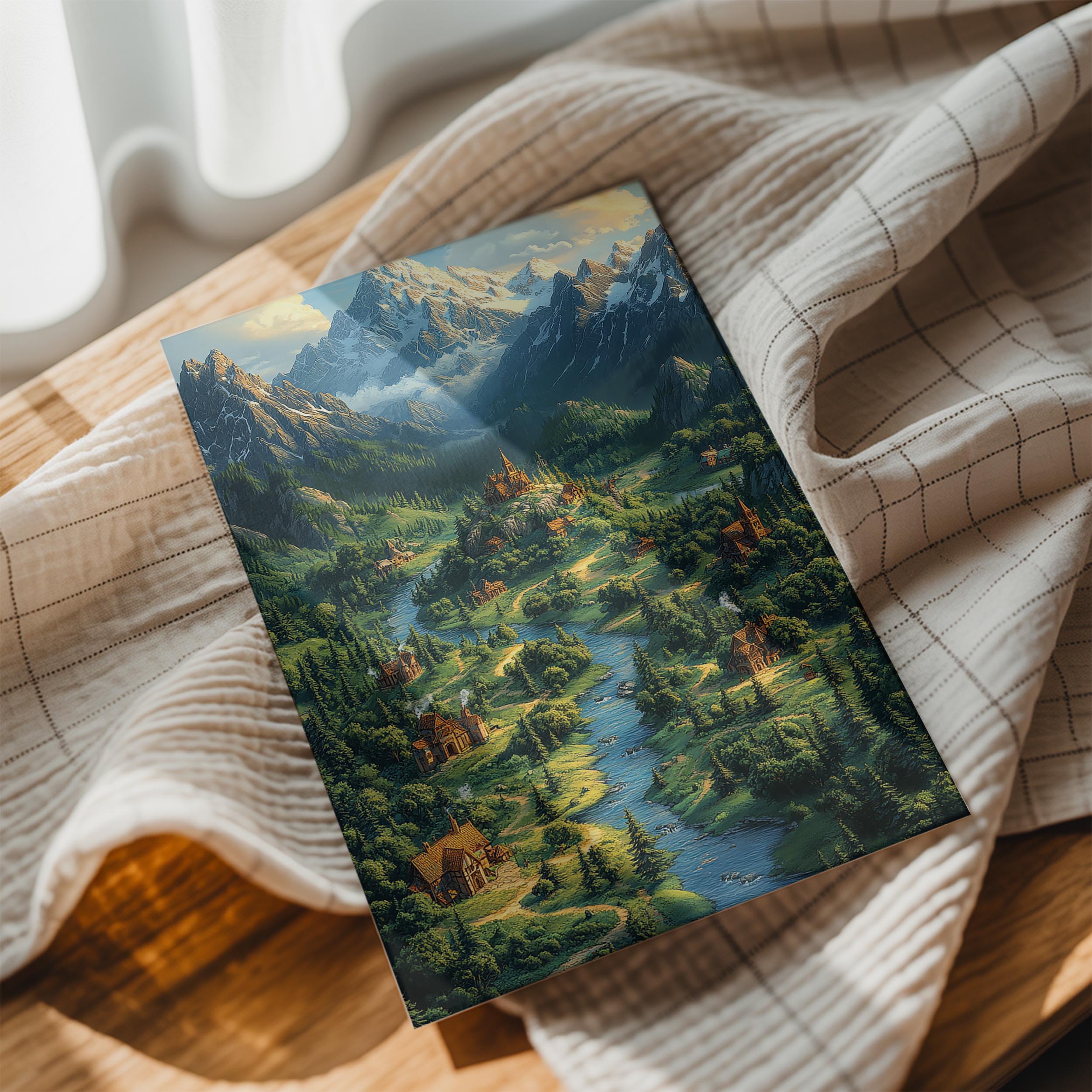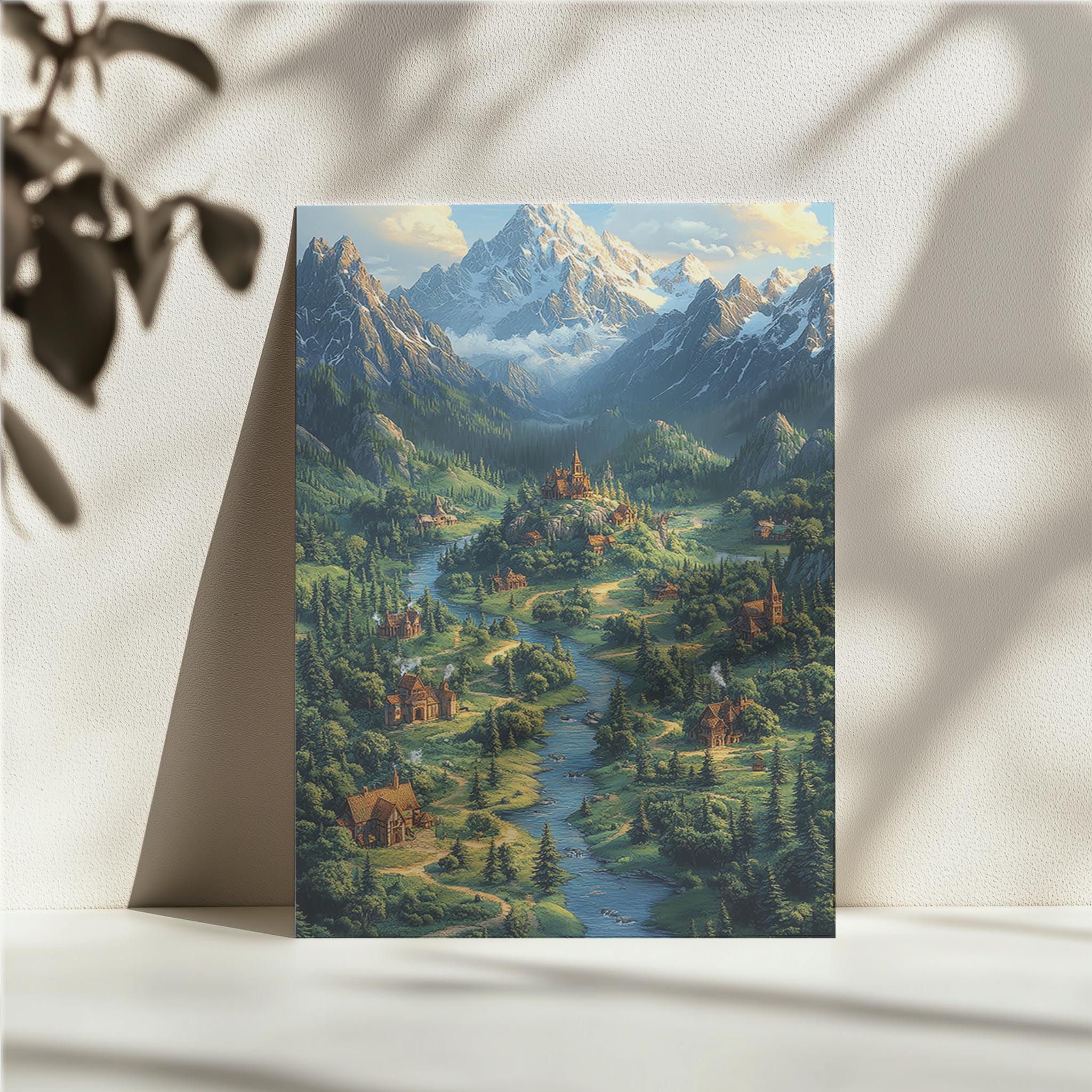 A picturesque landscape featuring a majestic castle nestled in a lush valley, with a flowing river and towering mountains in the background. The image’s vibrant greens and blues evoke serenity and grandeur, making it ideal for home decor or fantasy-themed spaces.