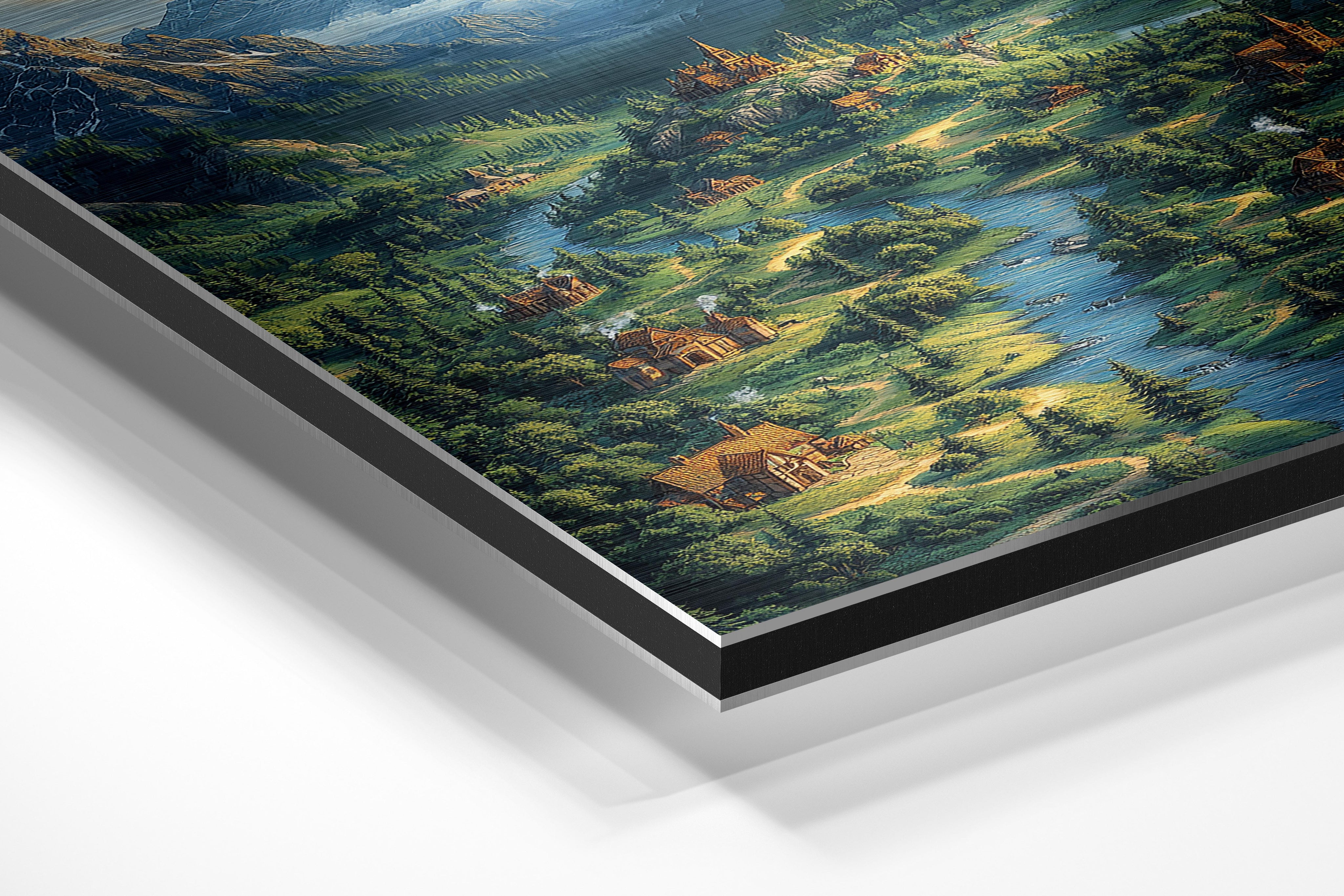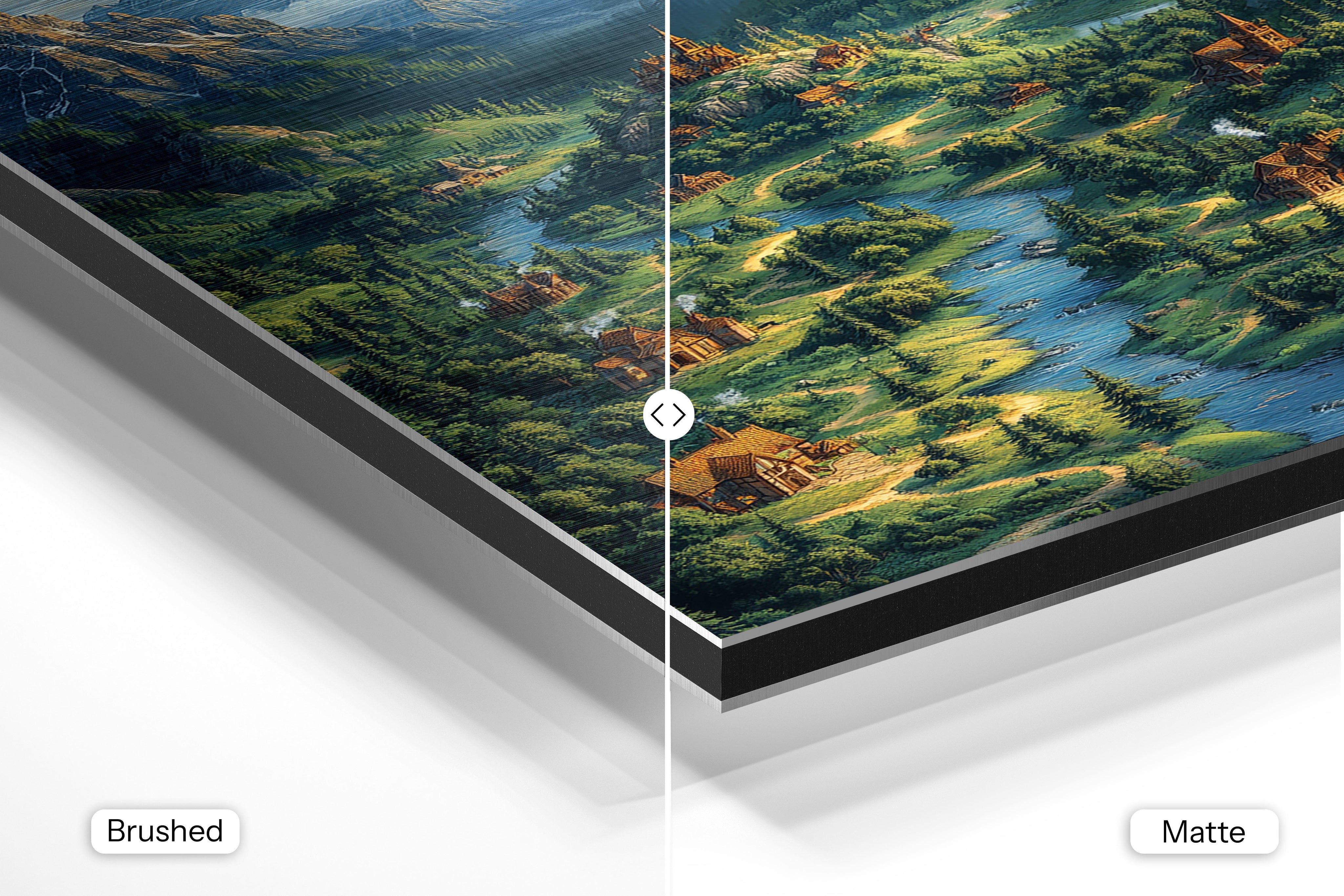- Brushed Aluminum, on the other hand, features a raw metallic texture with visible brush strokes. Whites and highlights in your image let the silver surface show through, adding a dramatic, shimmering effect. Ideal for black-and-white images, minimalist designs, or abstract art, it creates a bold, industrial vibe with a modern edge.