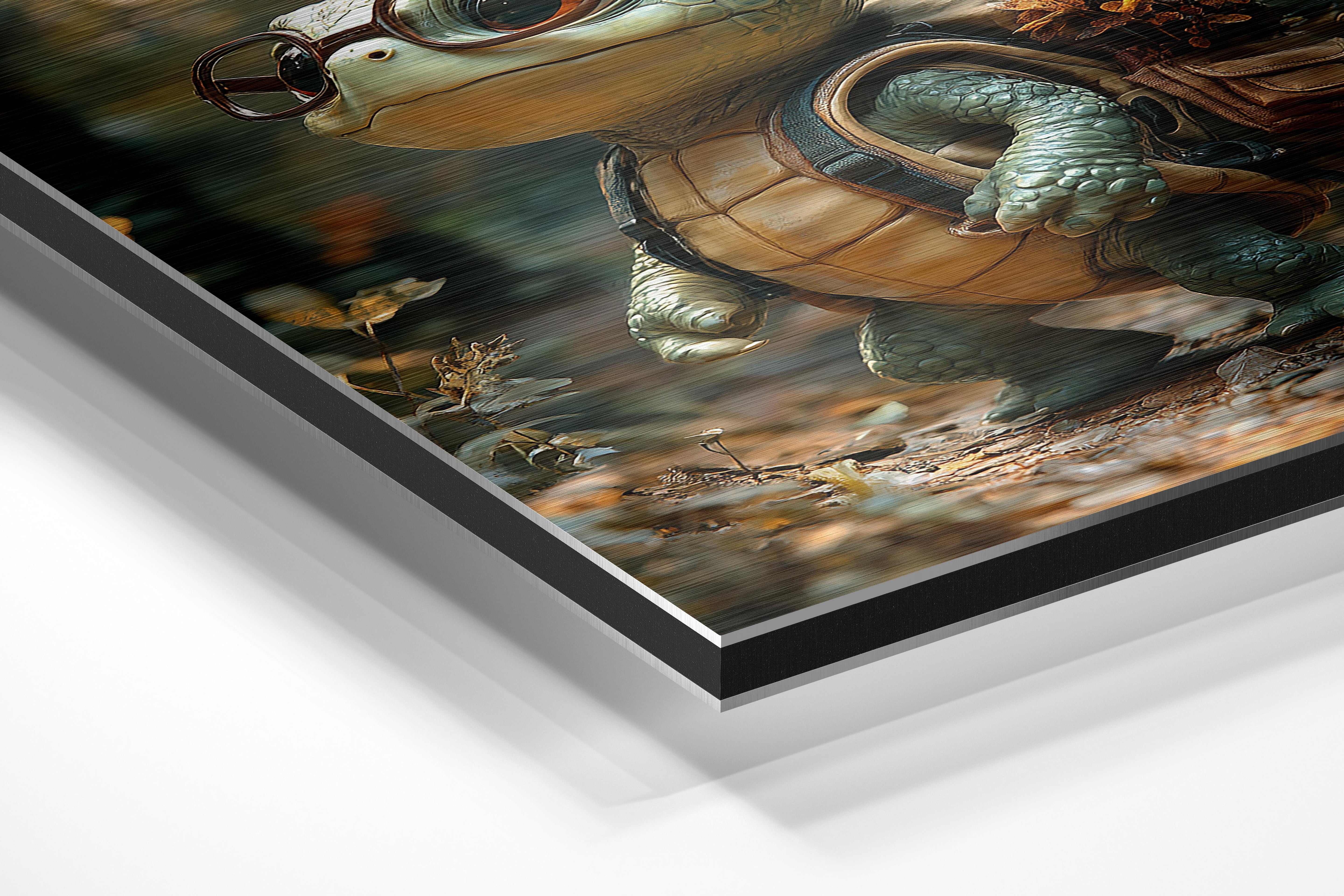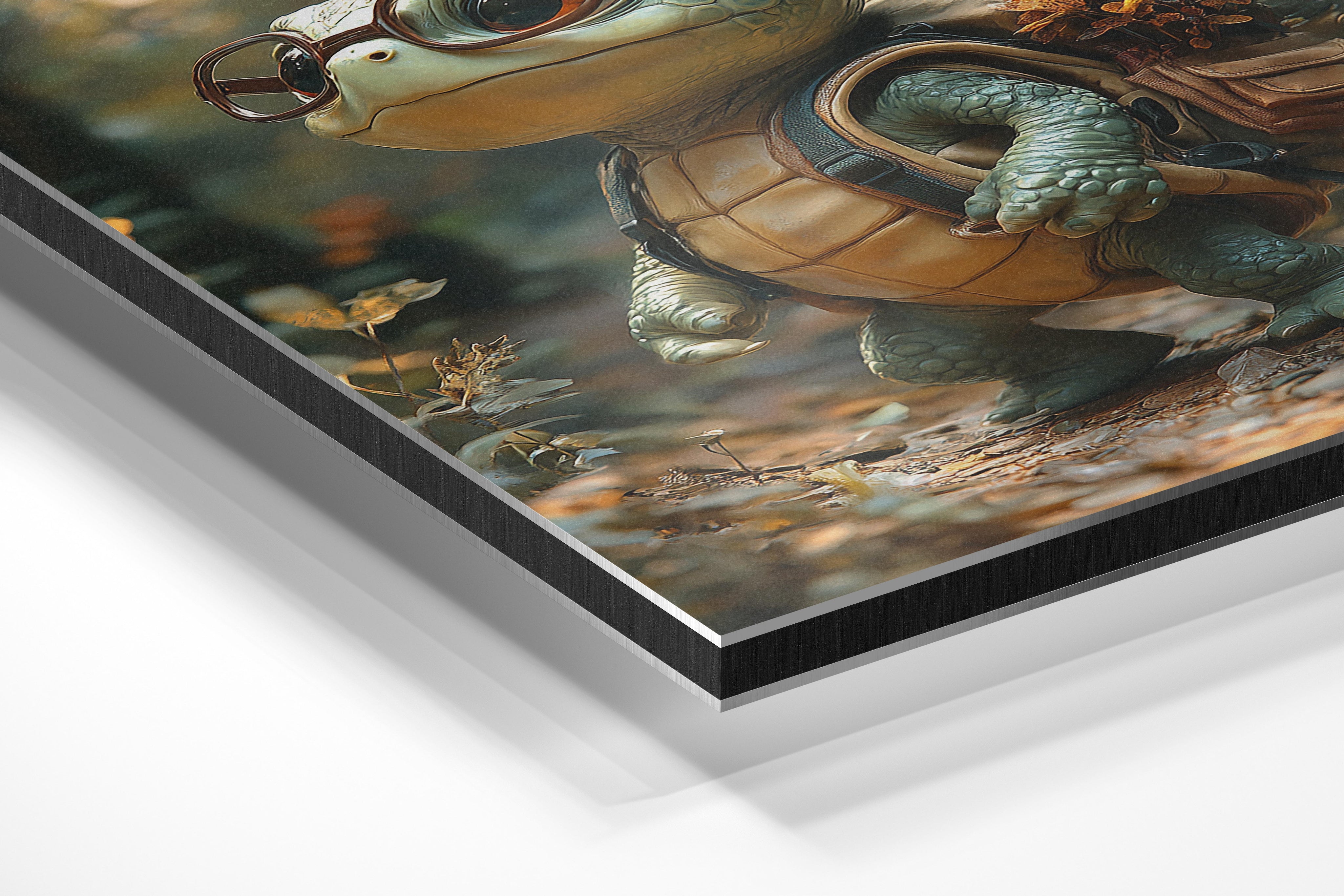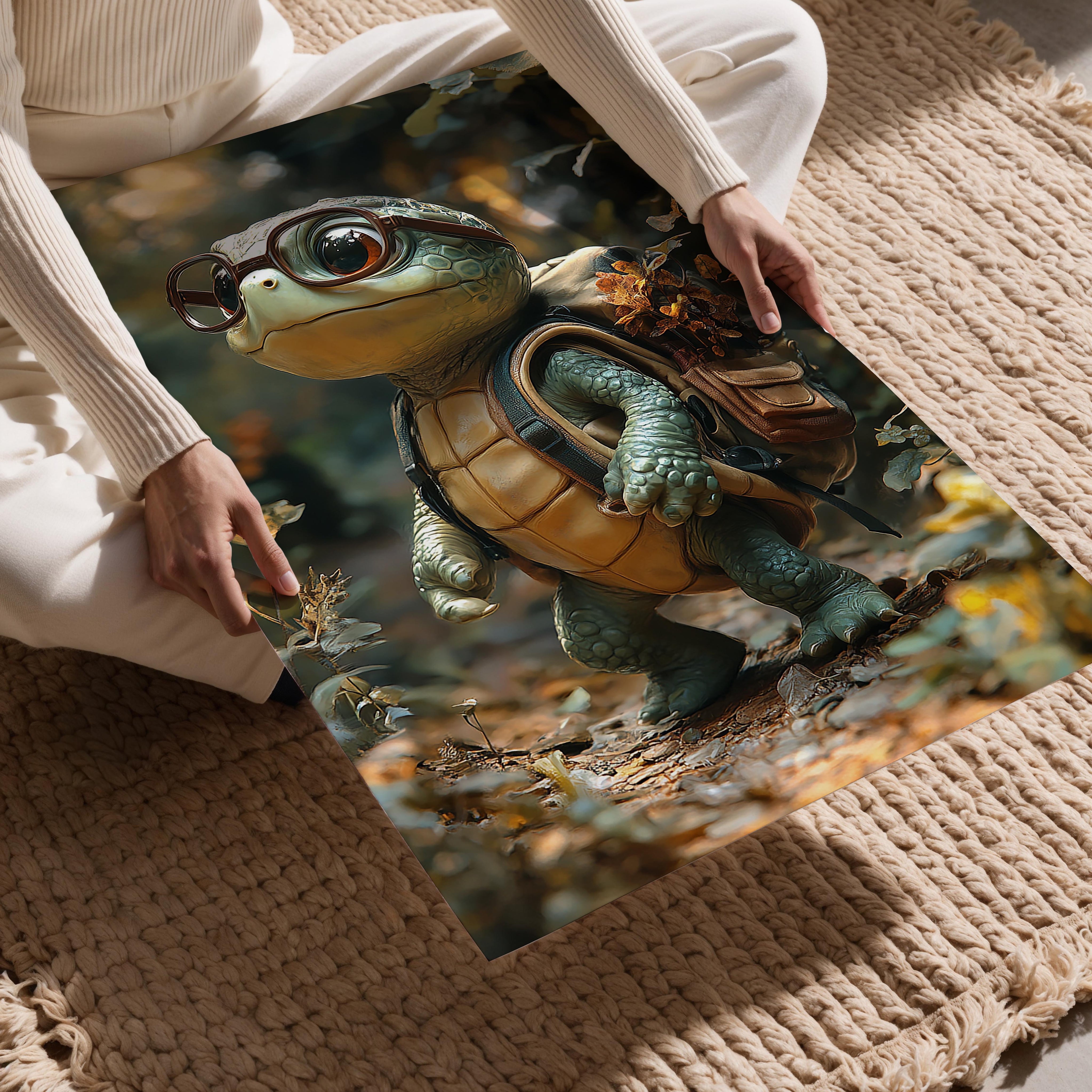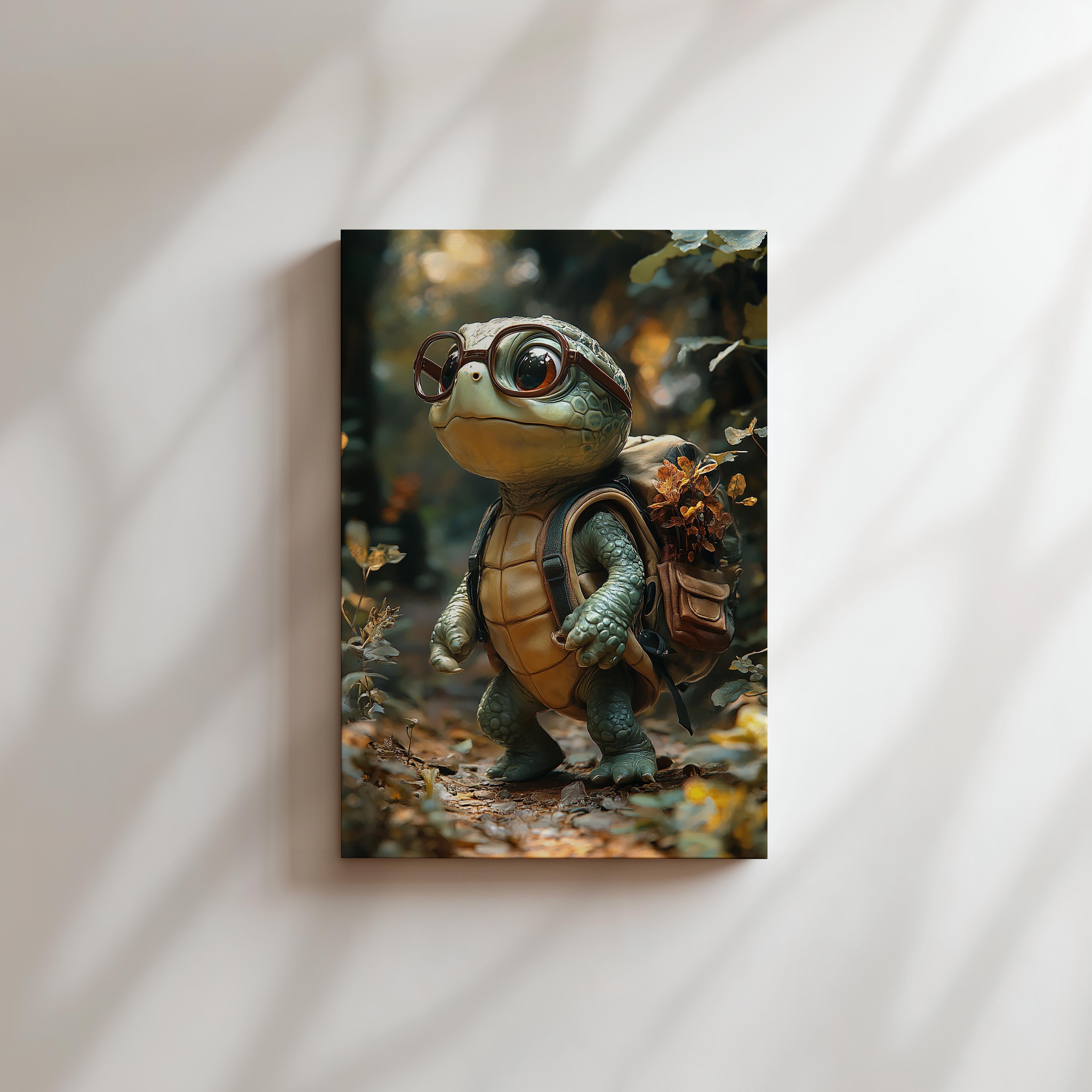An endearing turtle with glasses and a backpack takes center stage in this heartwarming scene. Set in an autumnal forest, this adventurous character embodies curiosity and scholarly pursuits. The earthy tones and detailed design make this piece both charming and visually engaging. It’s an ideal addition to spaces that celebrate learning, exploration, and the beauty of nature. This artwork inspires a sense of journey and discovery.