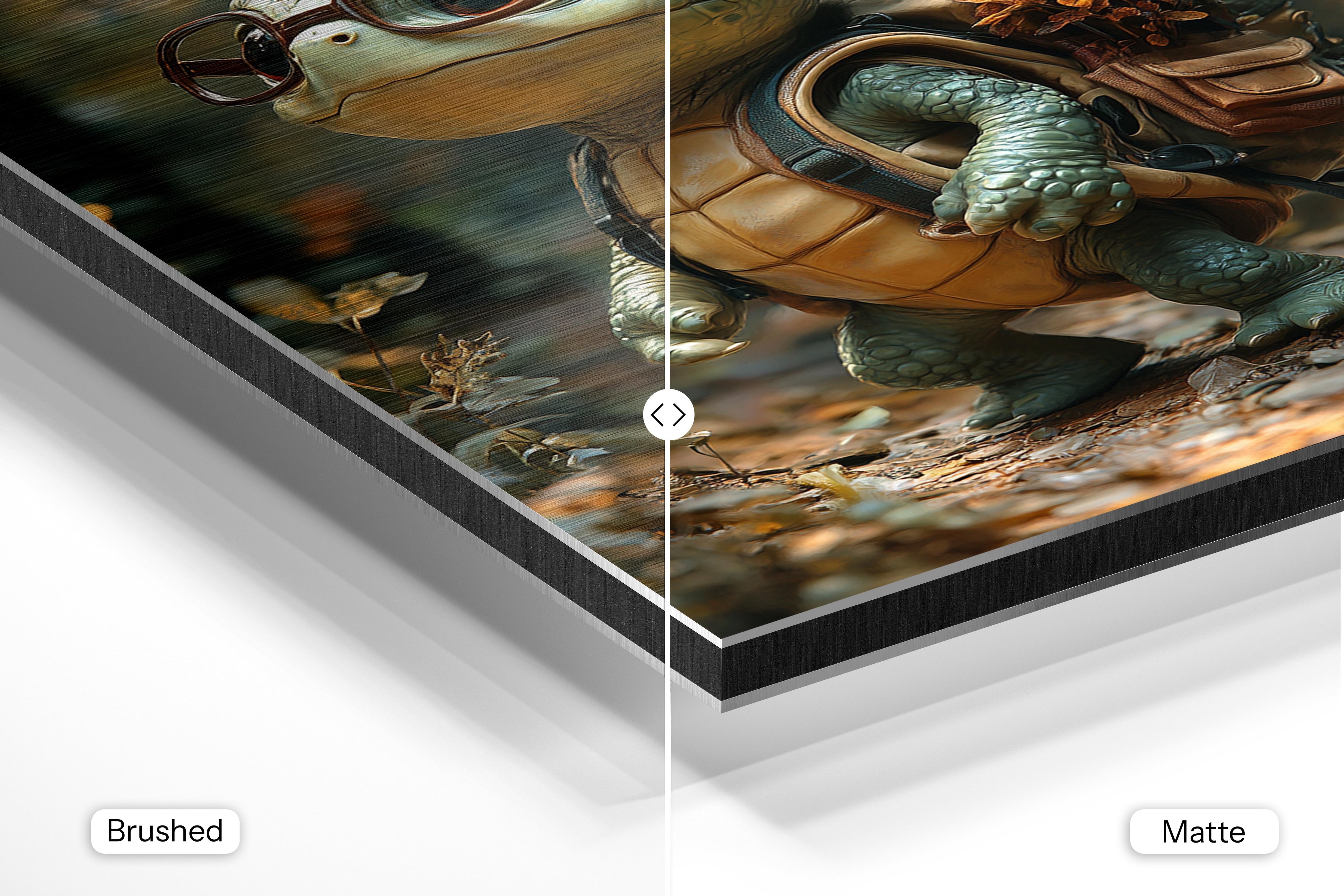 - Brushed Aluminum, on the other hand, features a raw metallic texture with visible brush strokes. Whites and highlights in your image let the silver surface show through, adding a dramatic, shimmering effect. Ideal for black-and-white images, minimalist designs, or abstract art, it creates a bold, industrial vibe with a modern edge.