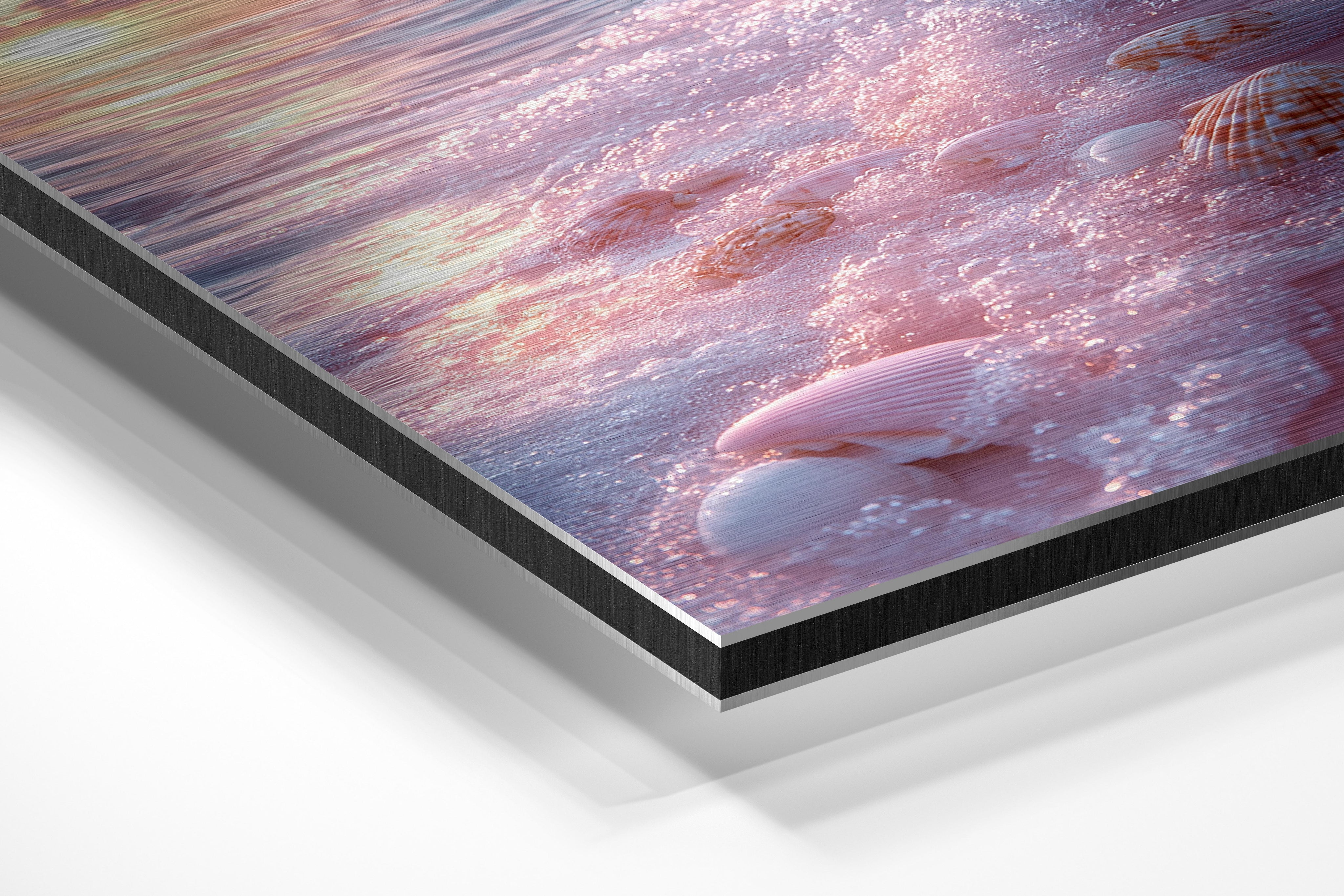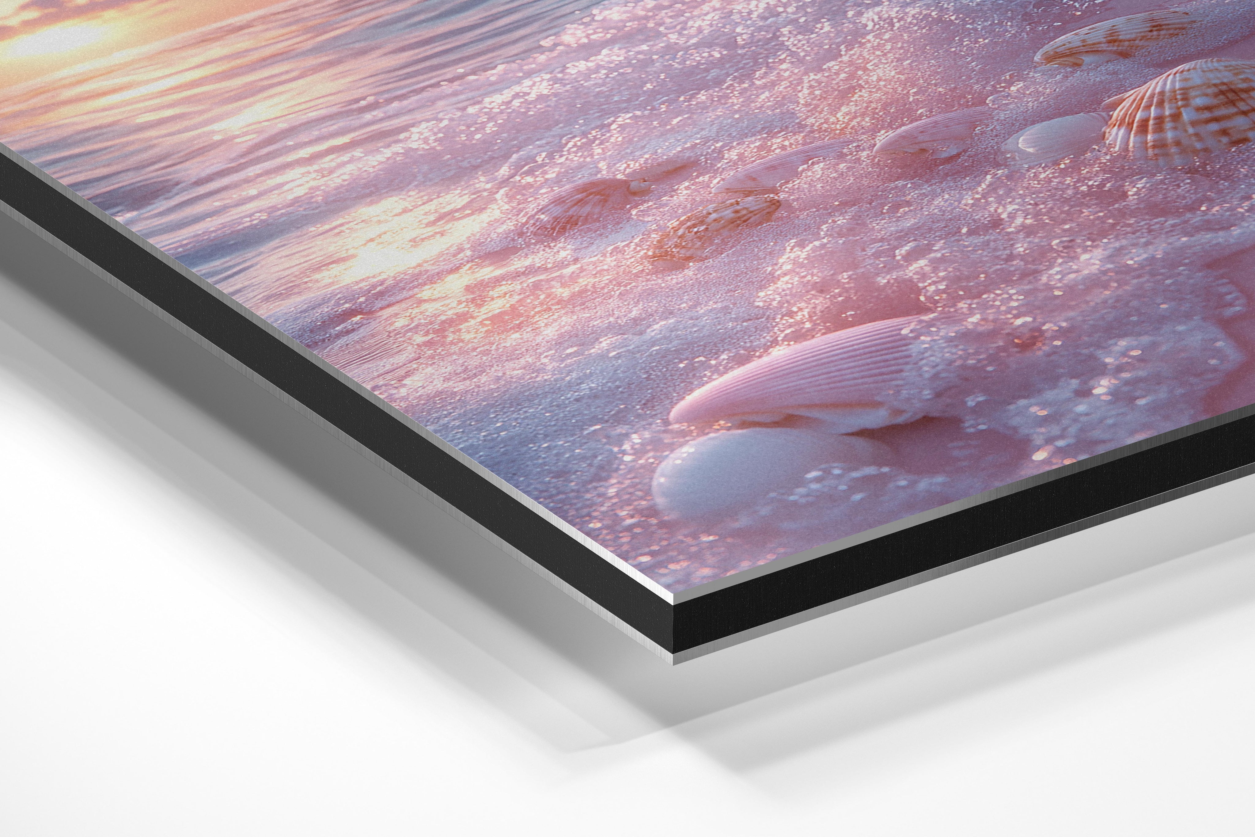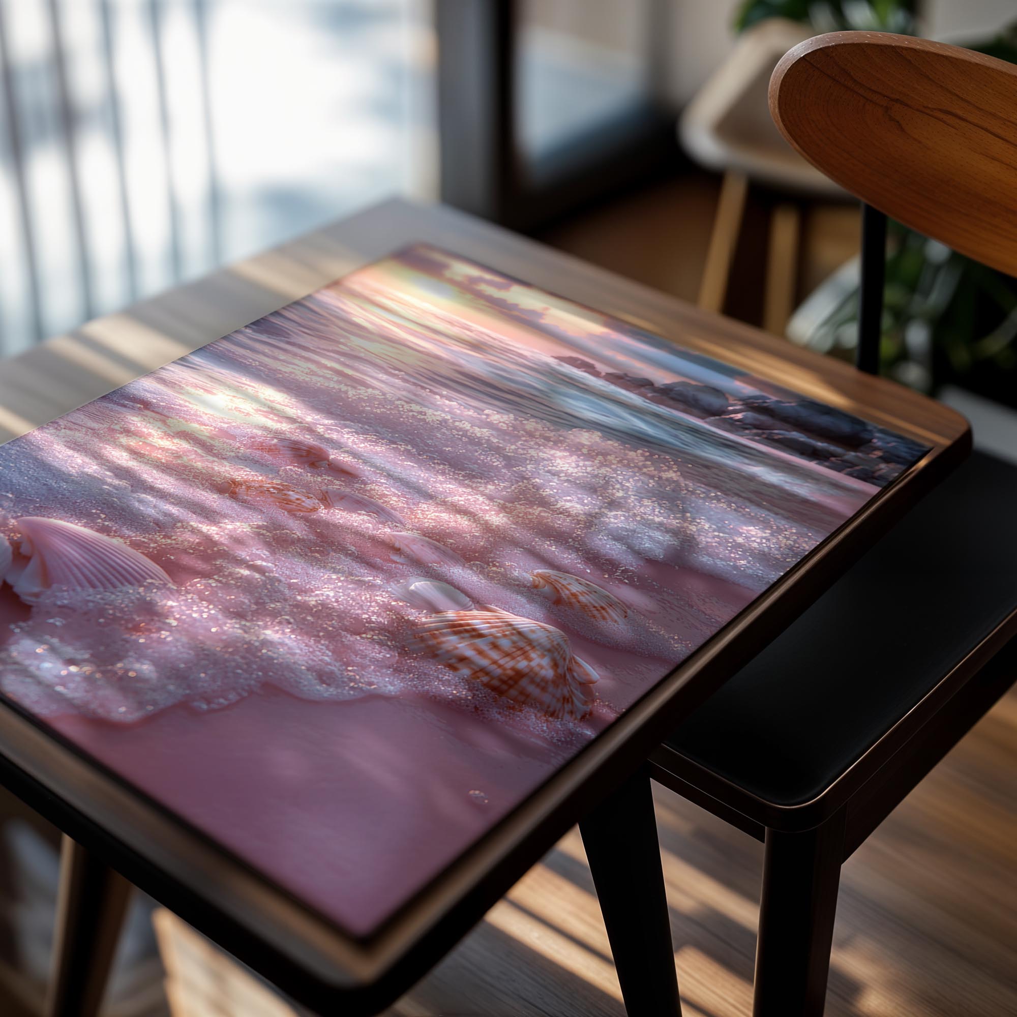 This serene image beautifully captures seashells scattered across a pink sandy beach as gentle waves caress the shore during a dreamy sunset. The soft hues of the sky seamlessly blend with the shimmering ocean, creating a tranquil ambiance. The delicate details of the seashells and the frothy waves enhance the natural beauty of the scene, evoking feelings of peace and relaxation. This artwork is perfect for those looking to bring the calming essence of the coast into their home. It’s an excellent choice for beach-inspired decor or spaces meant for unwinding and reflection.