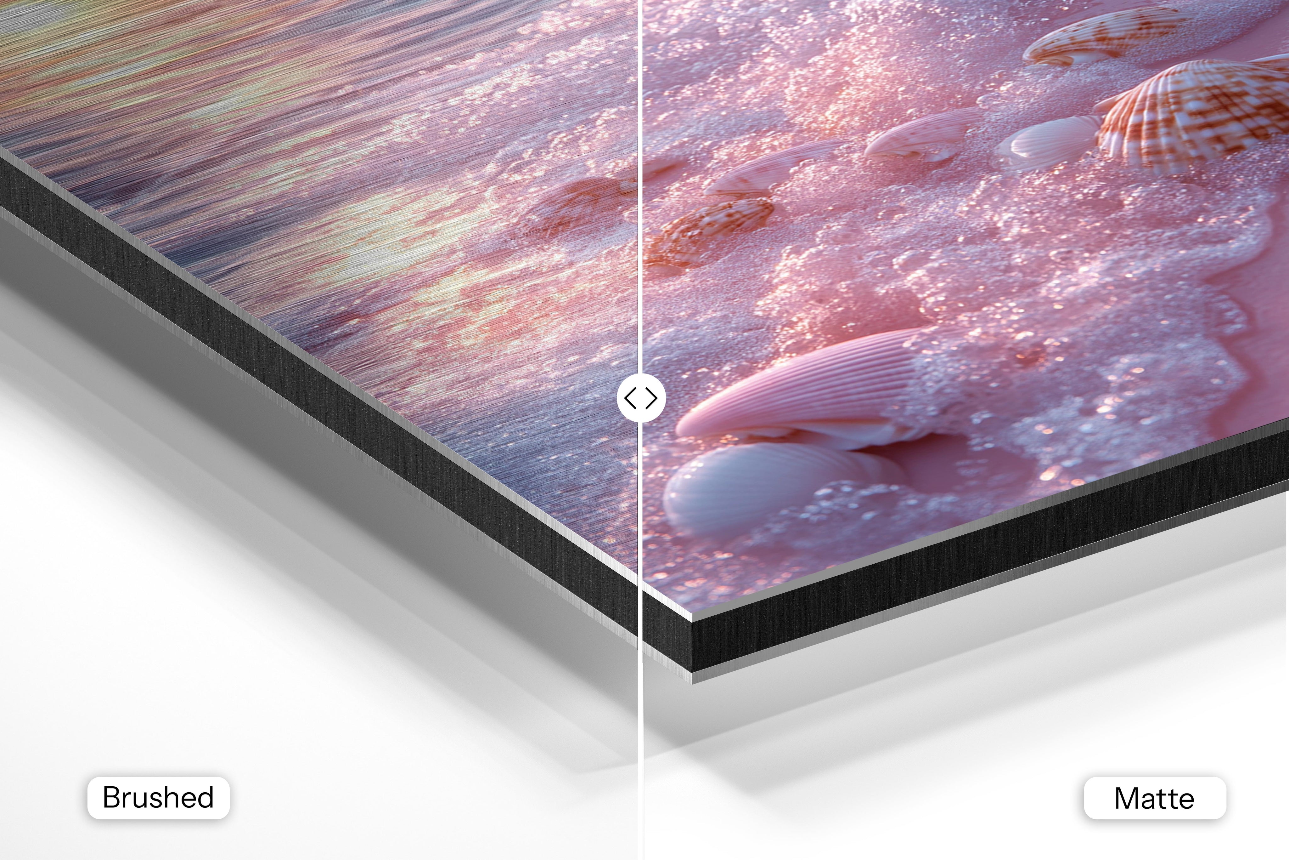 - Matte Aluminum offers a smooth, bright white surface that delivers crisp details and vibrant, true-to-life colors. With its non-reflective finish and subtle silky sheen, it’s perfect for photography, portraits, and colorful artwork—bringing a clean, polished look to any interior.