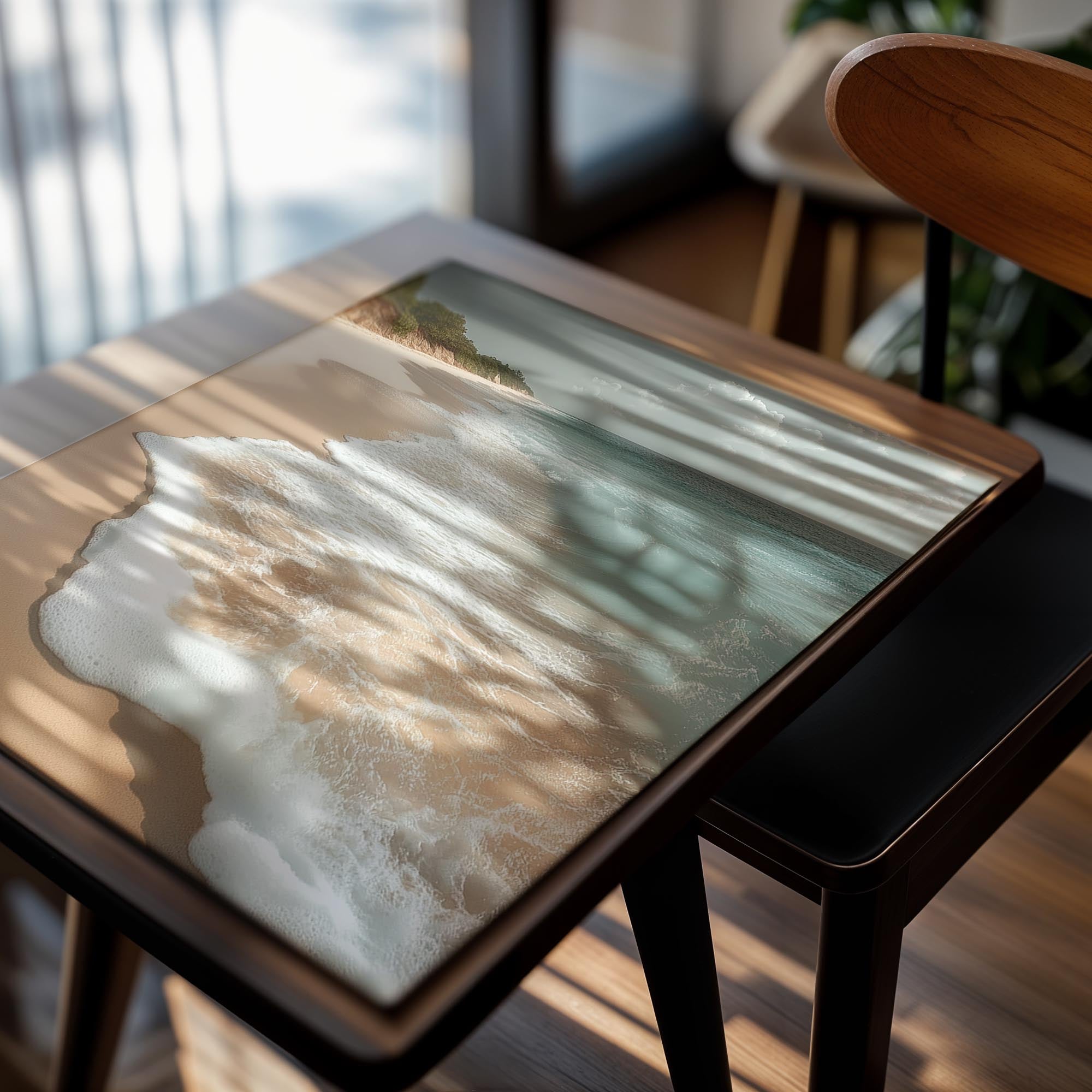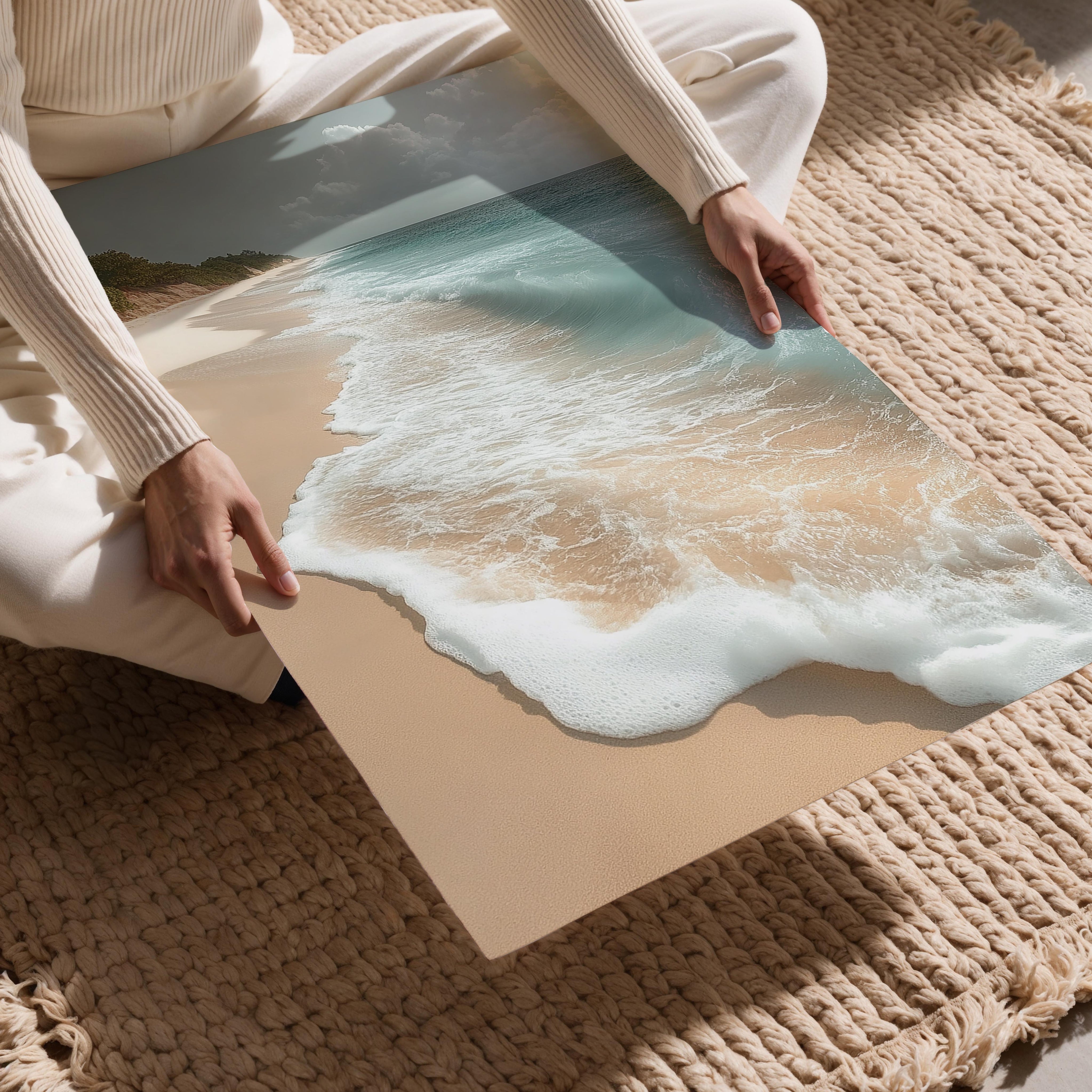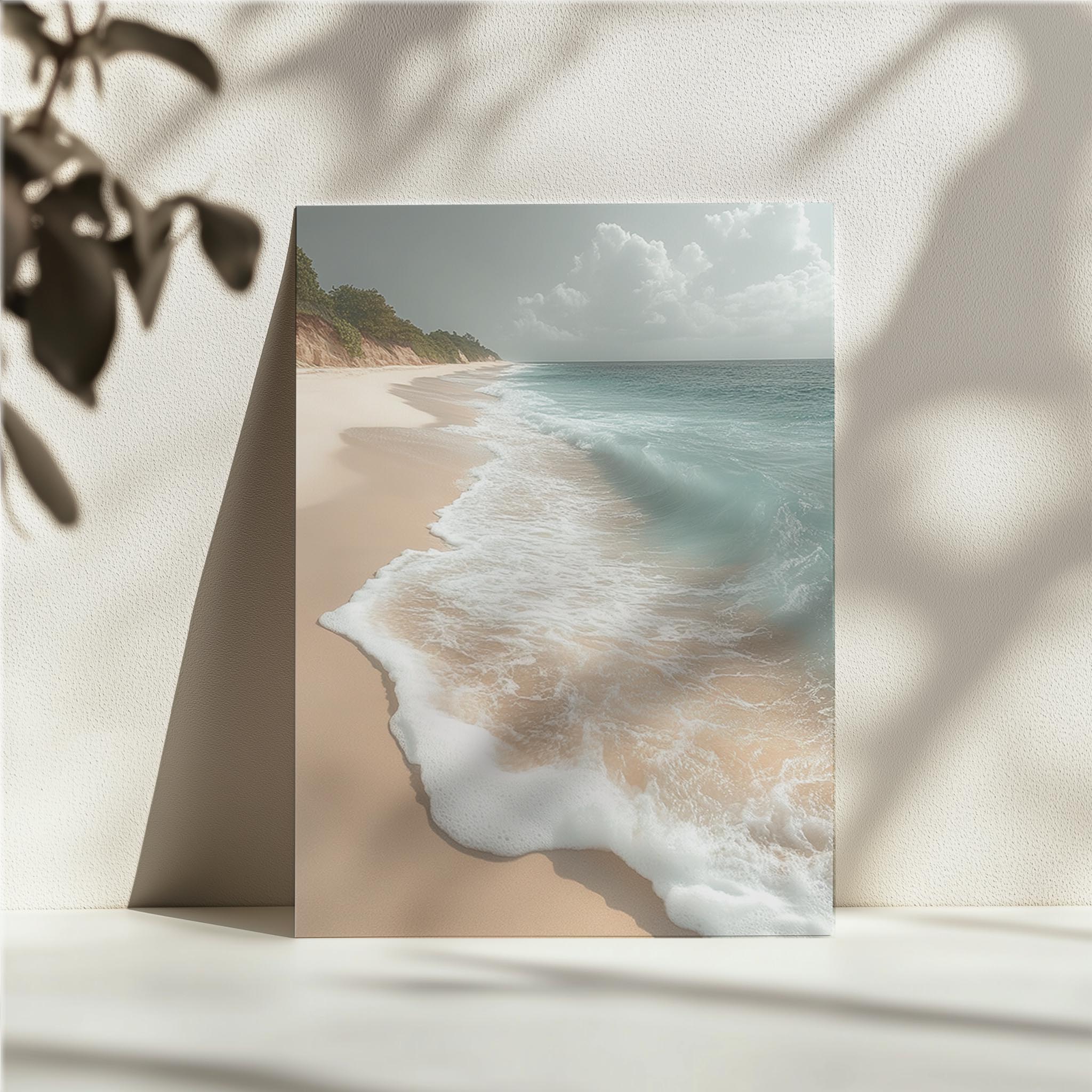 A serene and picturesque beach scene with gentle waves washing onto the shore. The soft hues of the sky and the sandy expanse create a tranquil ambiance, perfect for evoking relaxation and coastal calmness. A wonderful choice for promoting peaceful getaways.
