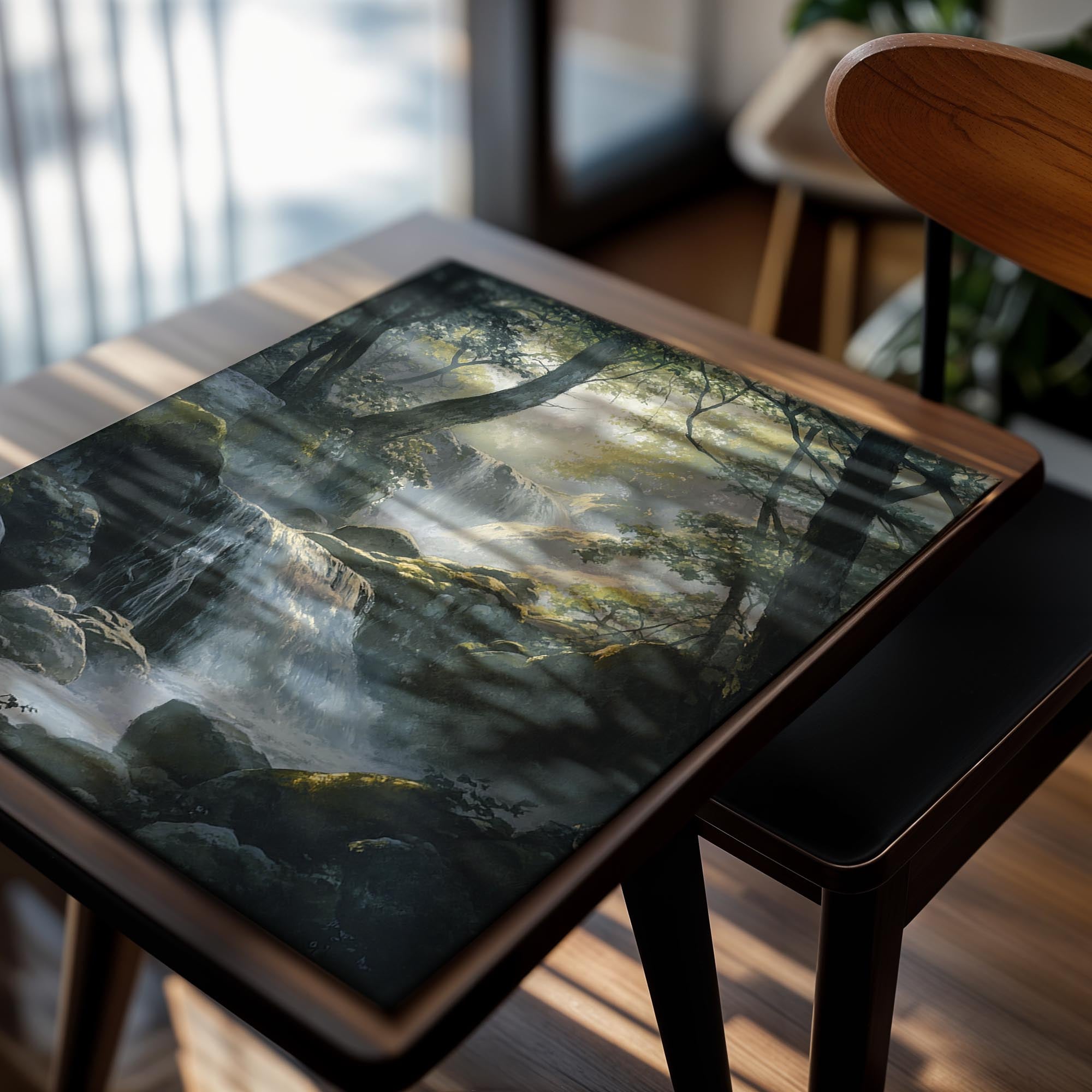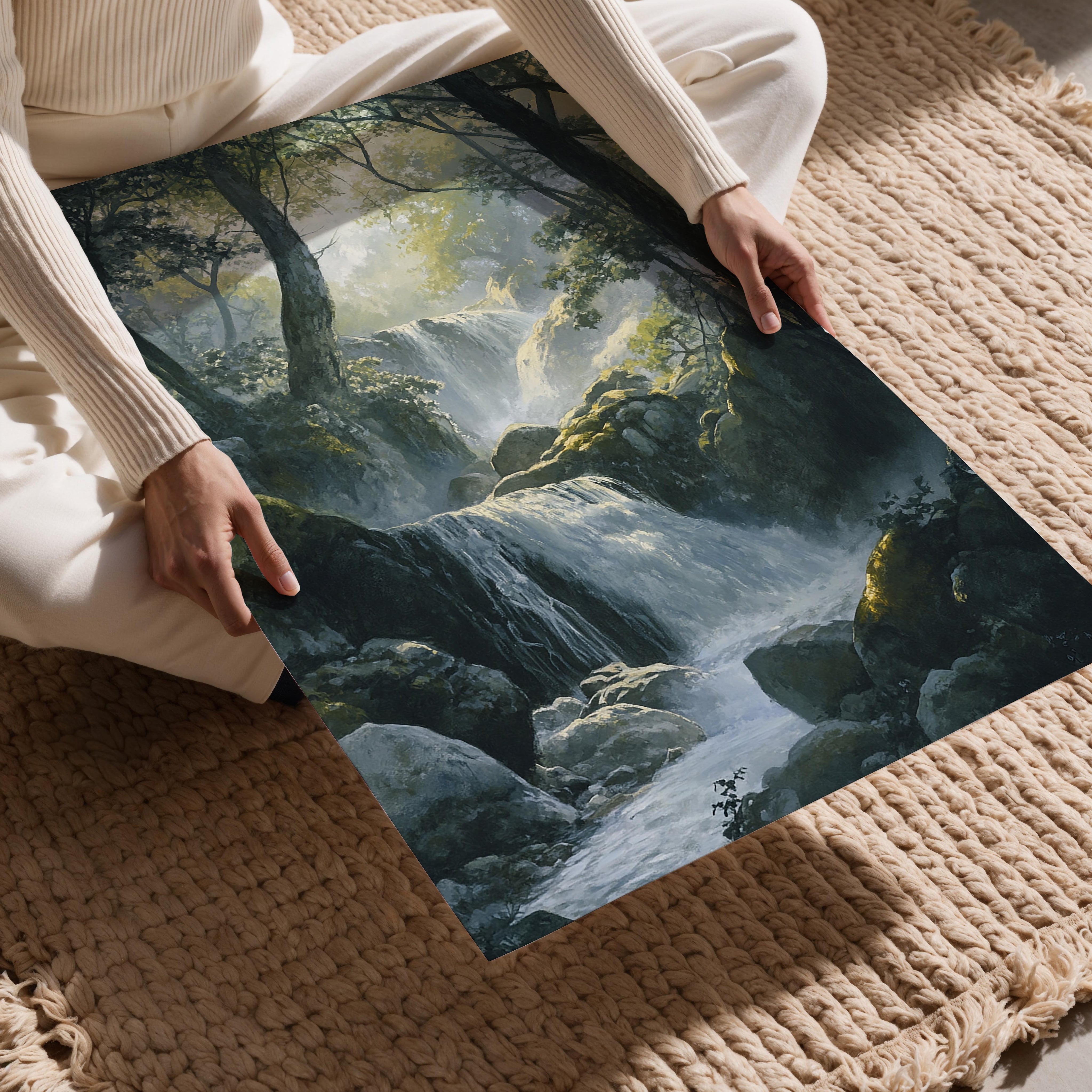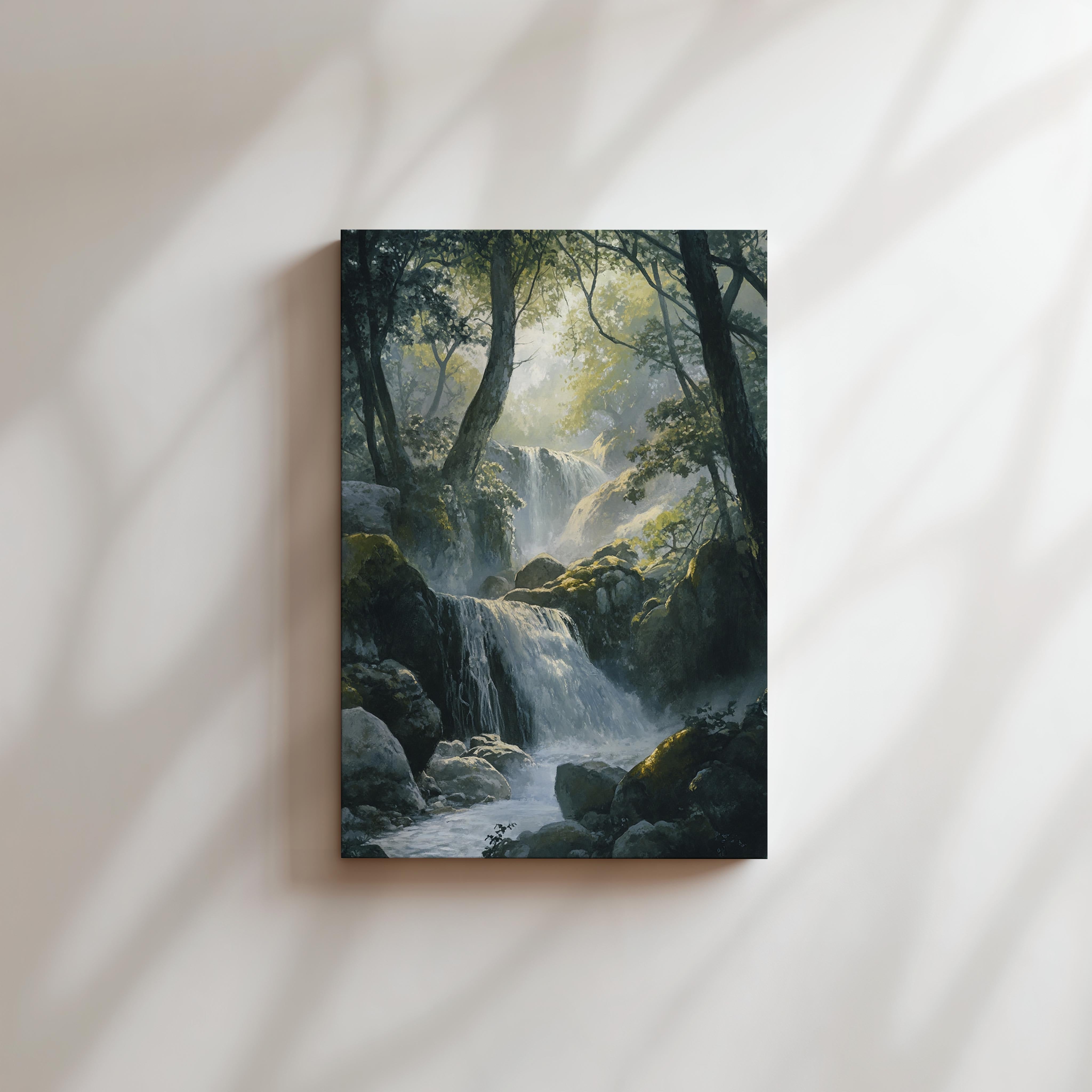 A tranquil waterfall surrounded by lush forest, offering an enchanting escape into nature. The cascading water flows gracefully over smooth rocks, creating a serene ambiance that soothes the senses. Soft sunlight filters through the dense canopy, casting dappled patterns of light and shadow on the moss-covered terrain. This scene is a perfect representation of harmony in nature, where water, light, and greenery come together to create an ethereal beauty. Ideal for nature lovers, this image captures the essence of peace and connection with the natural world. It inspires a sense of calm and a deep appreciation for the unspoiled wilderness.