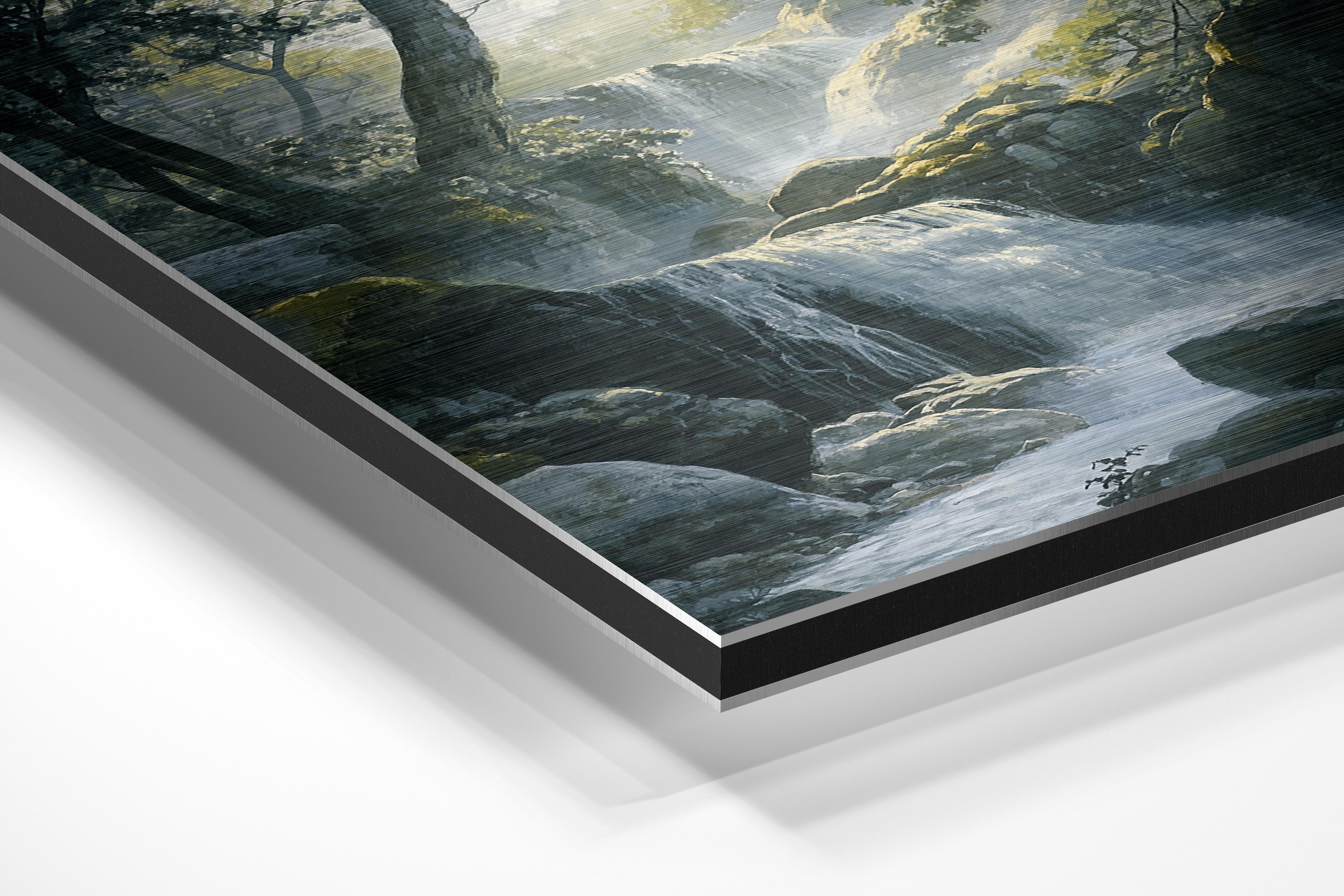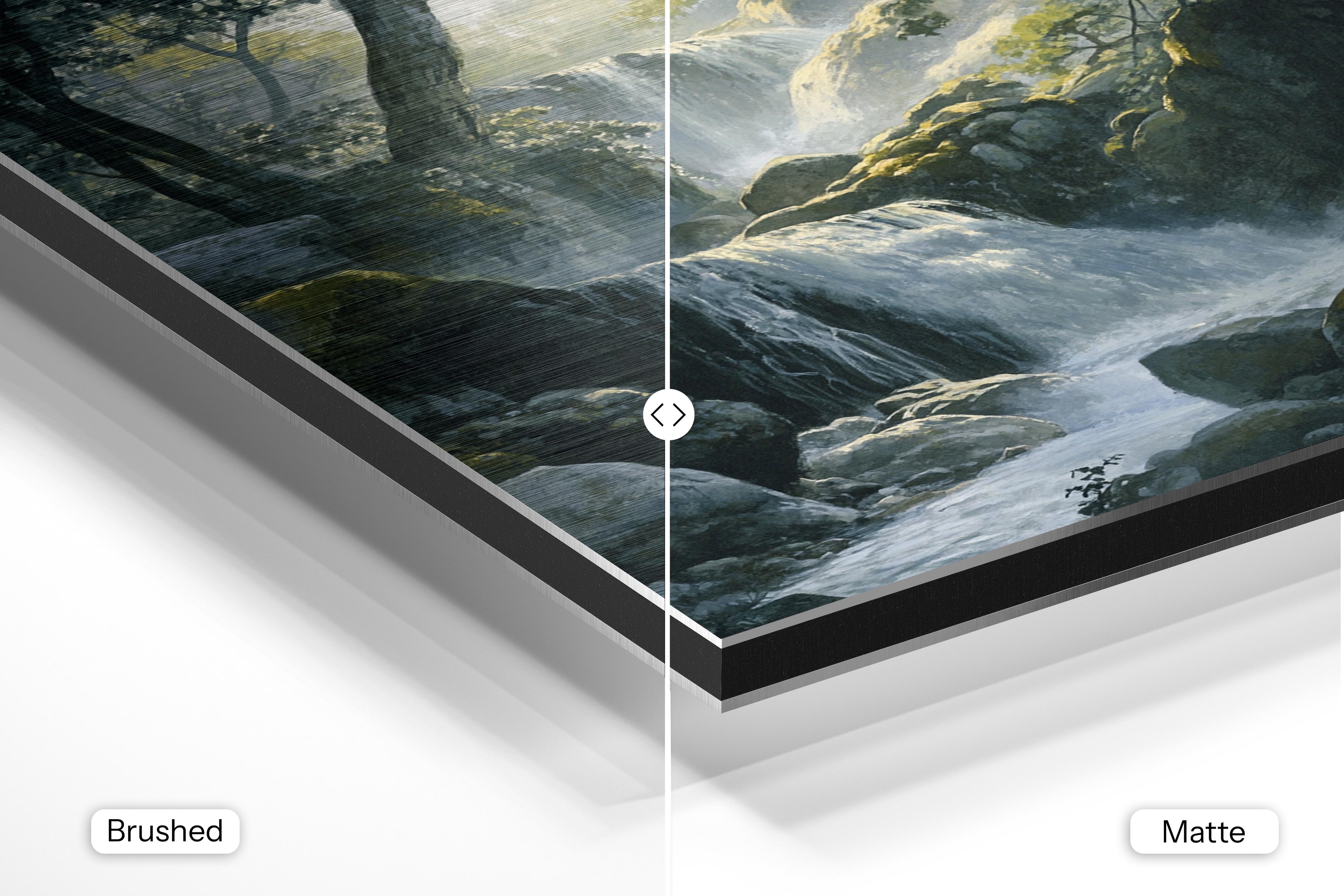 - Brushed Aluminum, on the other hand, features a raw metallic texture with visible brush strokes. Whites and highlights in your image let the silver surface show through, adding a dramatic, shimmering effect. Ideal for black-and-white images, minimalist designs, or abstract art, it creates a bold, industrial vibe with a modern edge.