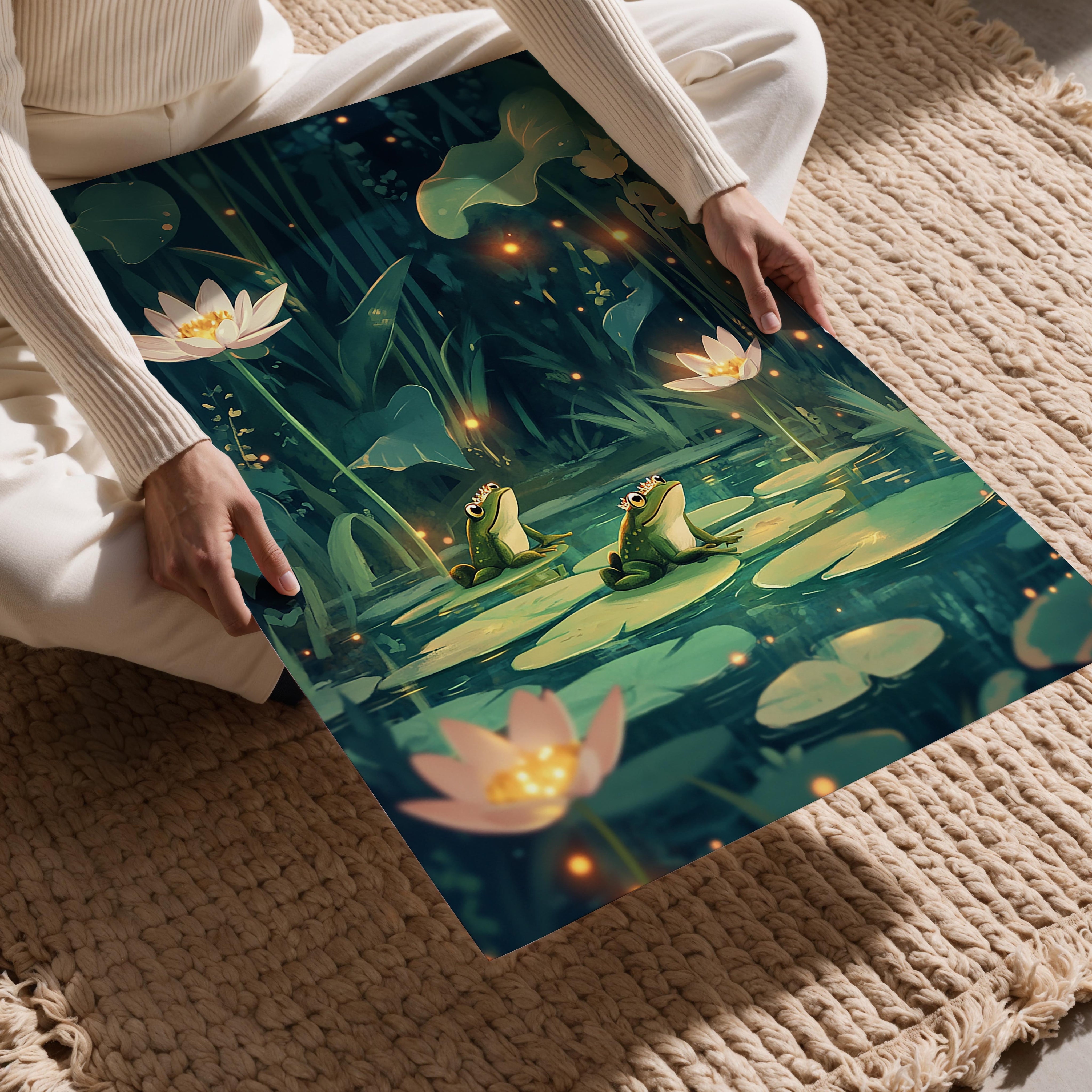 A tranquil and magical scene of frogs resting on lily pads under a canopy of glowing fireflies and blooming lotuses. The deep greens and gentle lighting evoke a sense of peace, perfect for spaces that encourage relaxation or meditation. The subtle sparkle of the fireflies adds an ethereal quality to the artwork, while the serene expressions of the frogs create a calming effect. This piece is excellent for bedrooms, living spaces, or even spas, as it fosters a connection with nature and serenity.