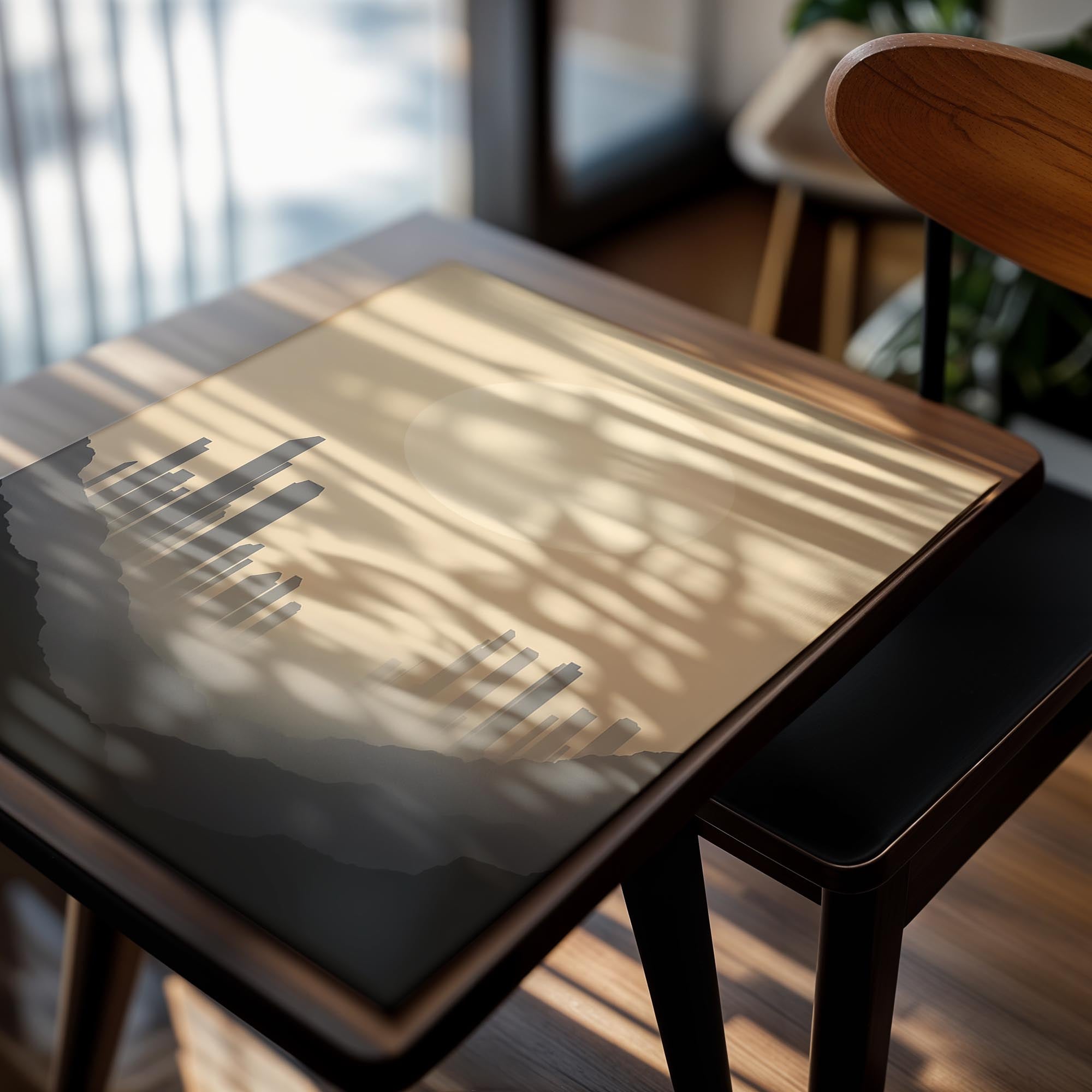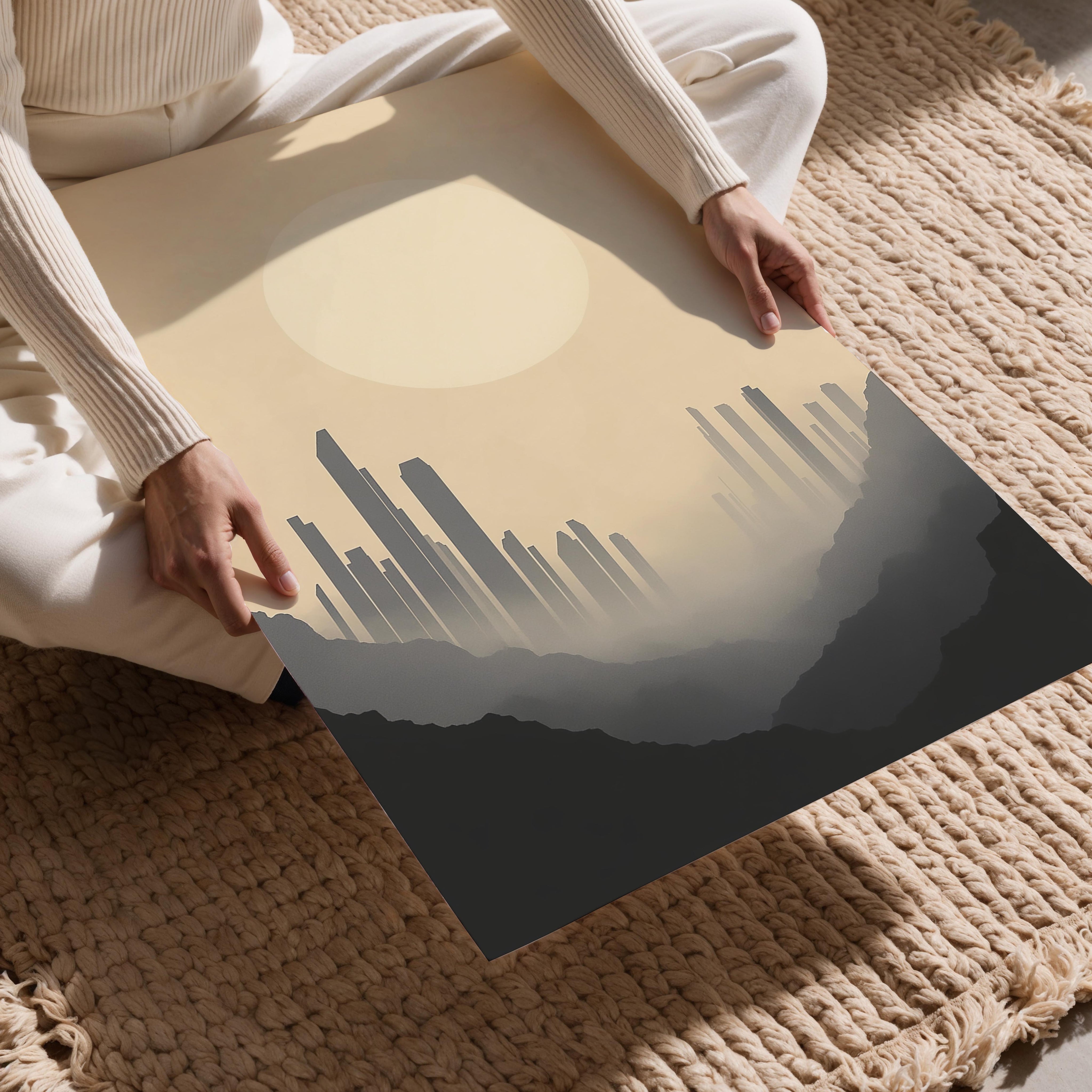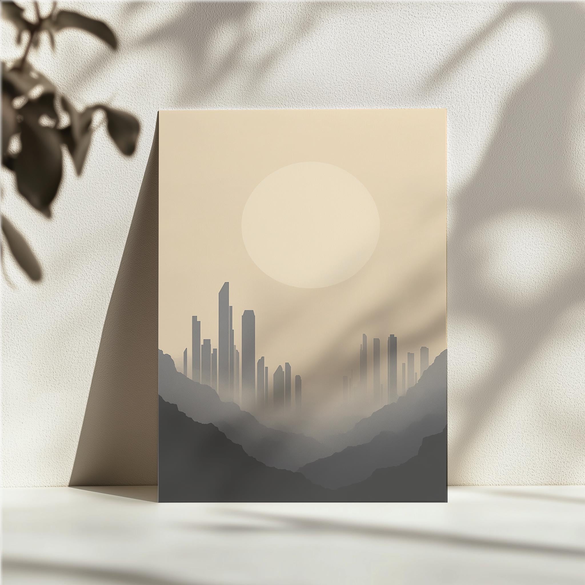 A tranquil landscape featuring a modern skyline bathed in the soft glow of a setting sun. The composition blends natural serenity with urban sophistication, making it an ideal piece for living rooms, bedrooms, or minimalist interiors. Its calming tones evoke a sense of peace, while the detailed silhouettes of buildings create a balanced contrast. This artwork is perfect for spaces seeking to merge relaxation with modern elegance.