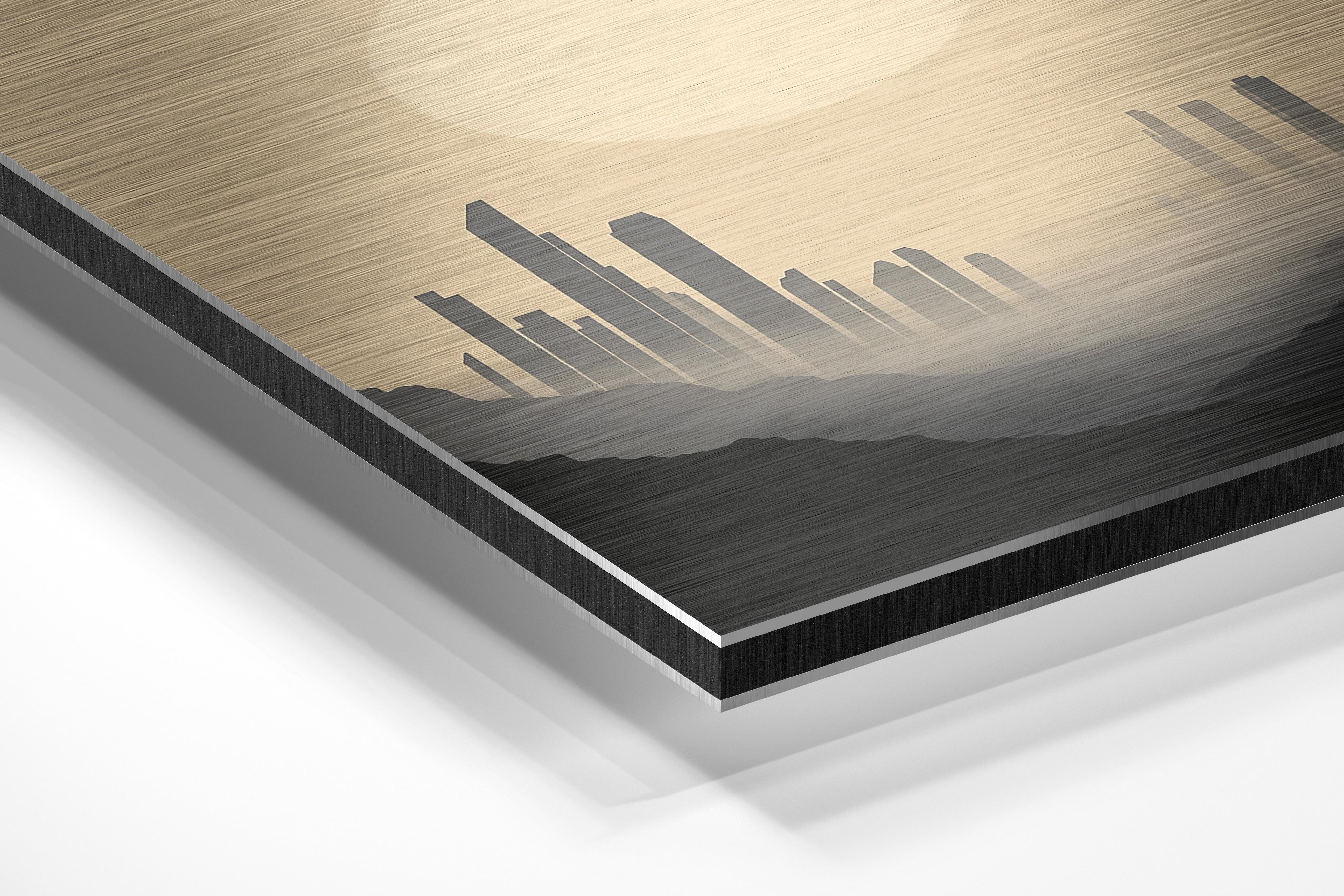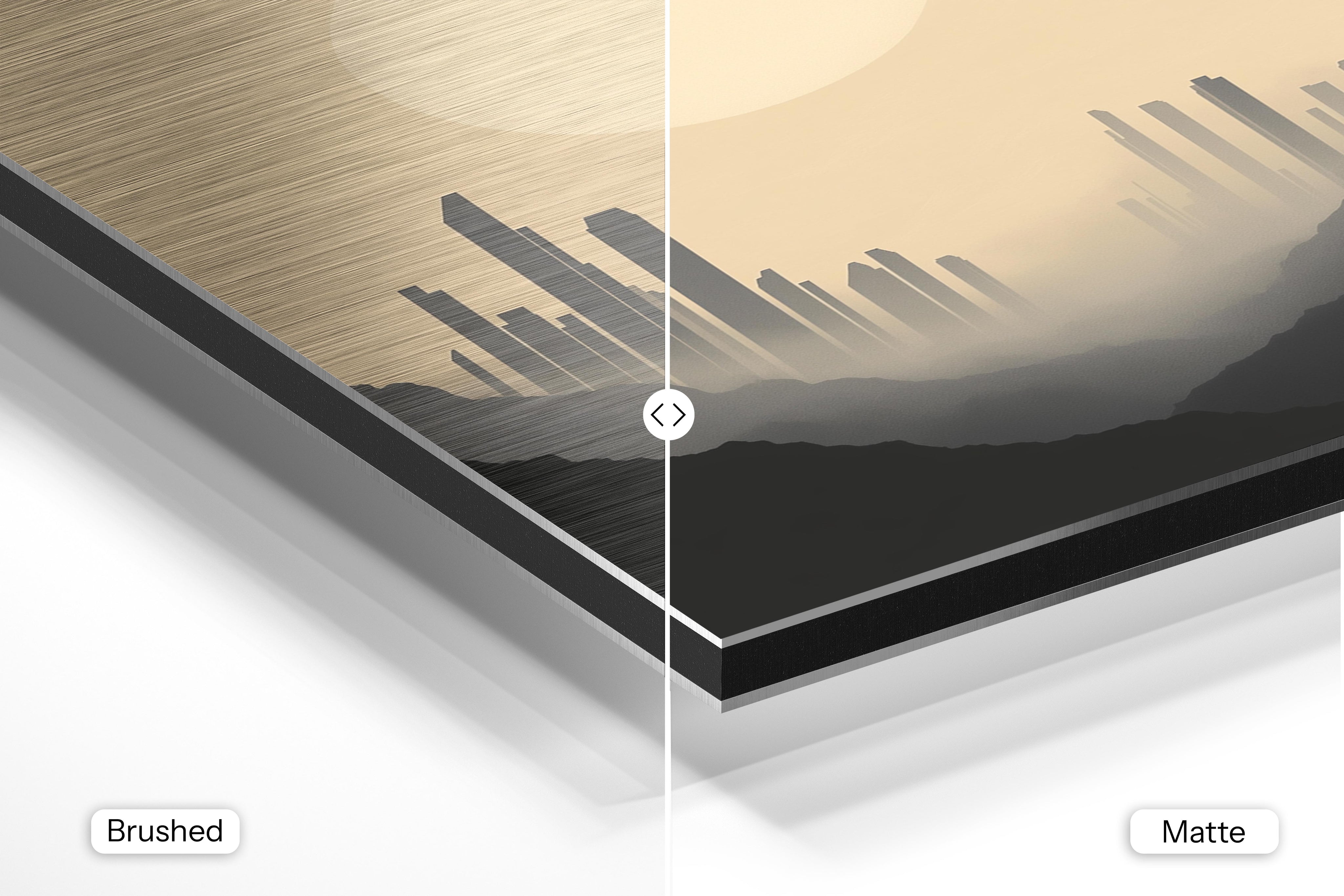 - Brushed Aluminum, on the other hand, features a raw metallic texture with visible brush strokes. Whites and highlights in your image let the silver surface show through, adding a dramatic, shimmering effect. Ideal for black-and-white images, minimalist designs, or abstract art, it creates a bold, industrial vibe with a modern edge.