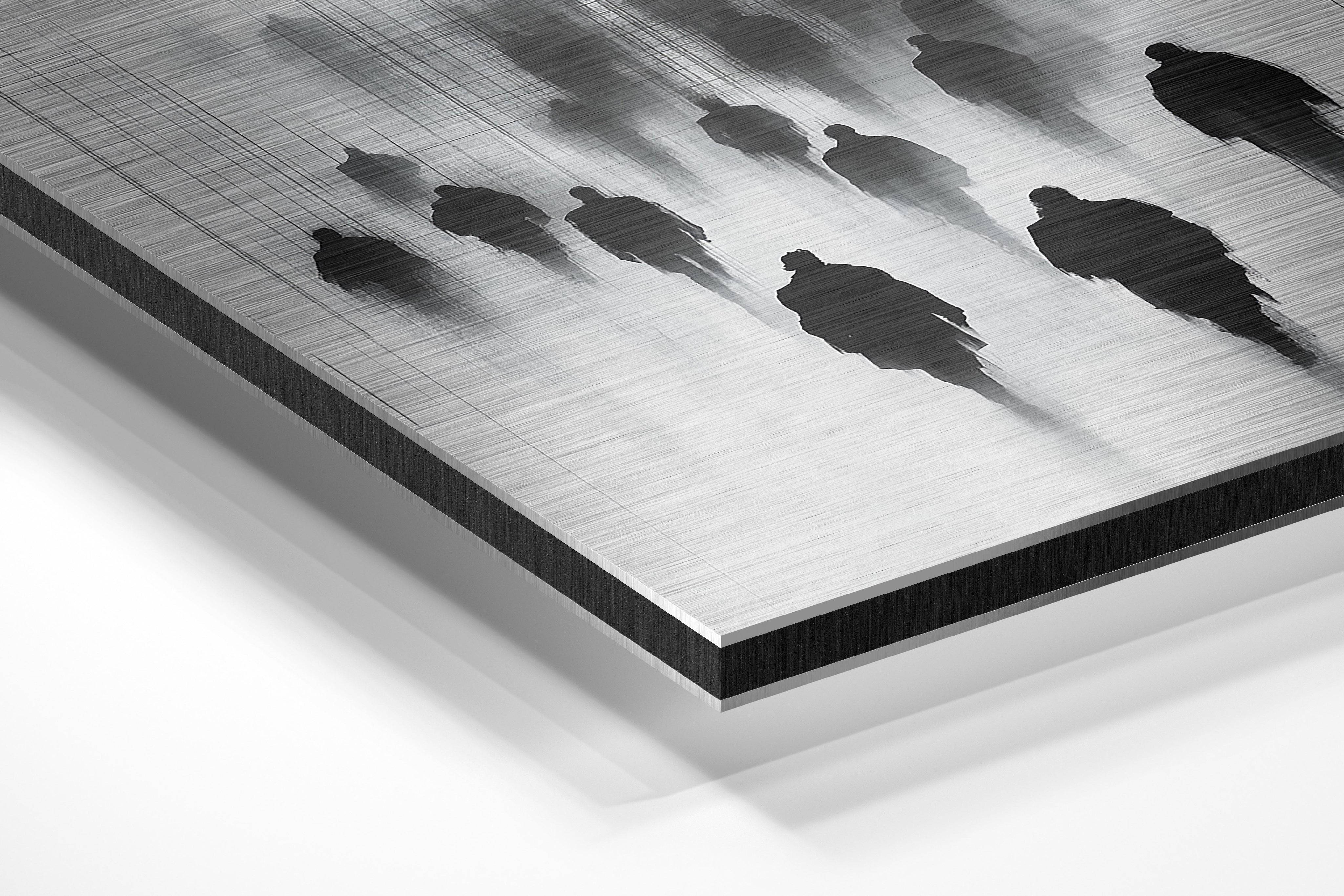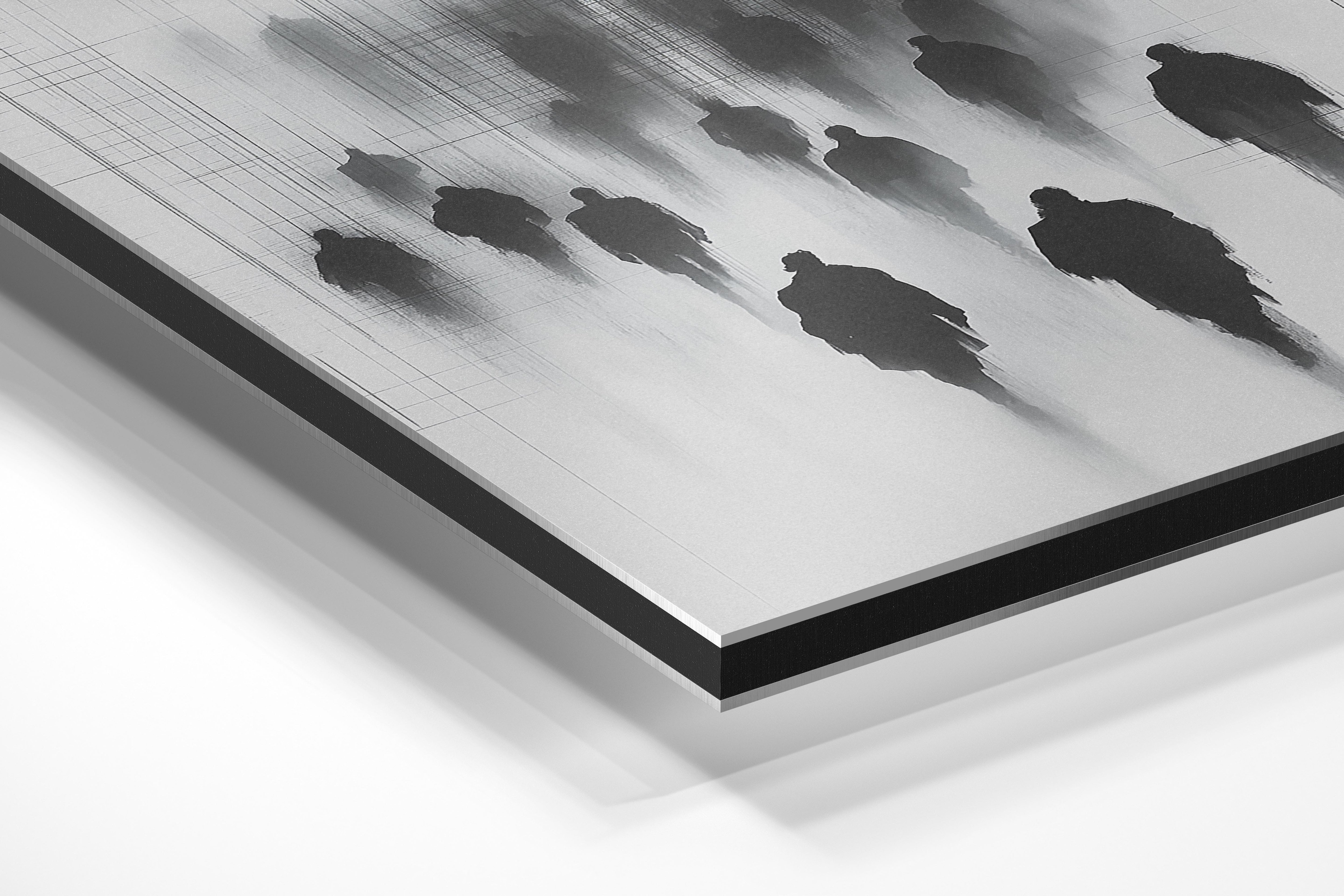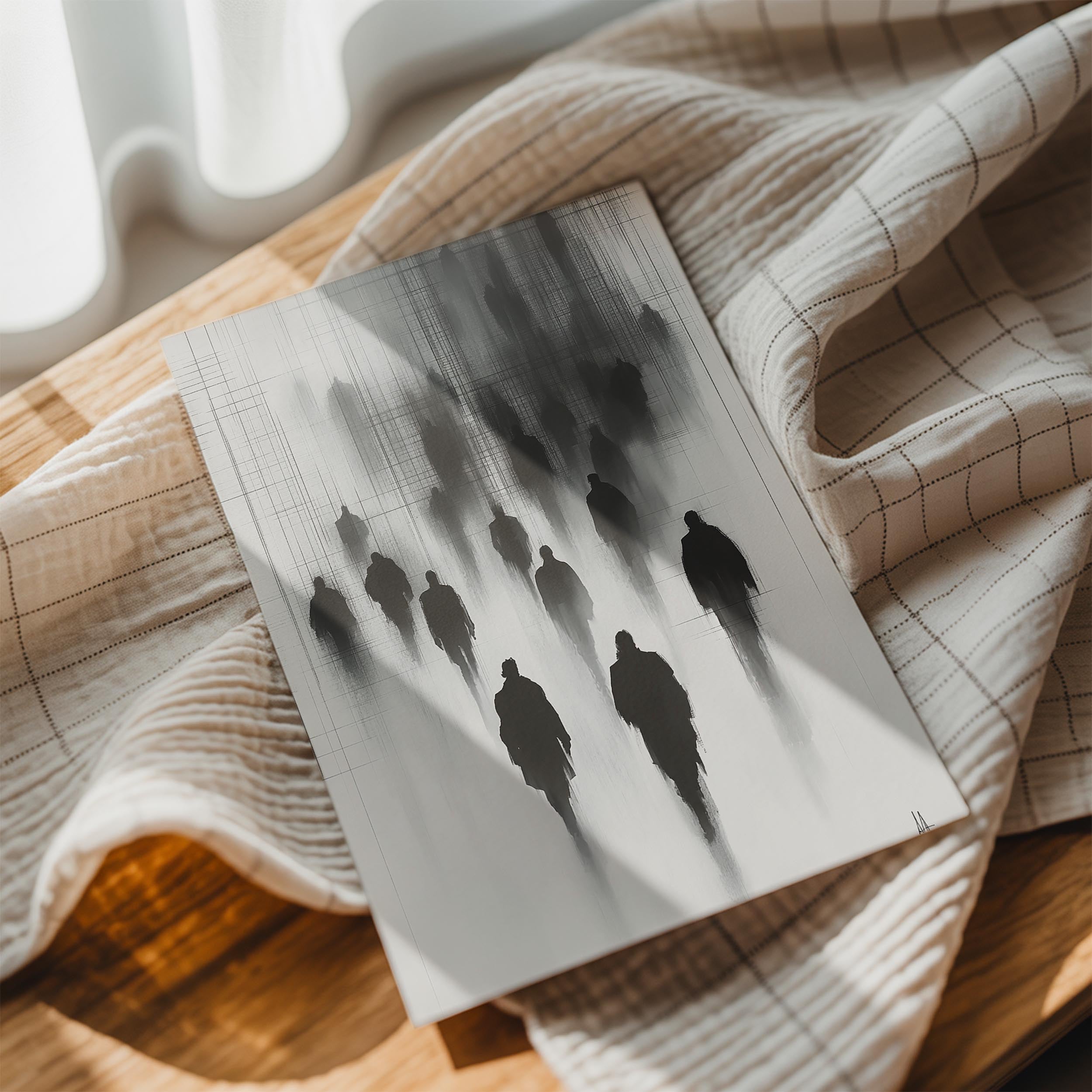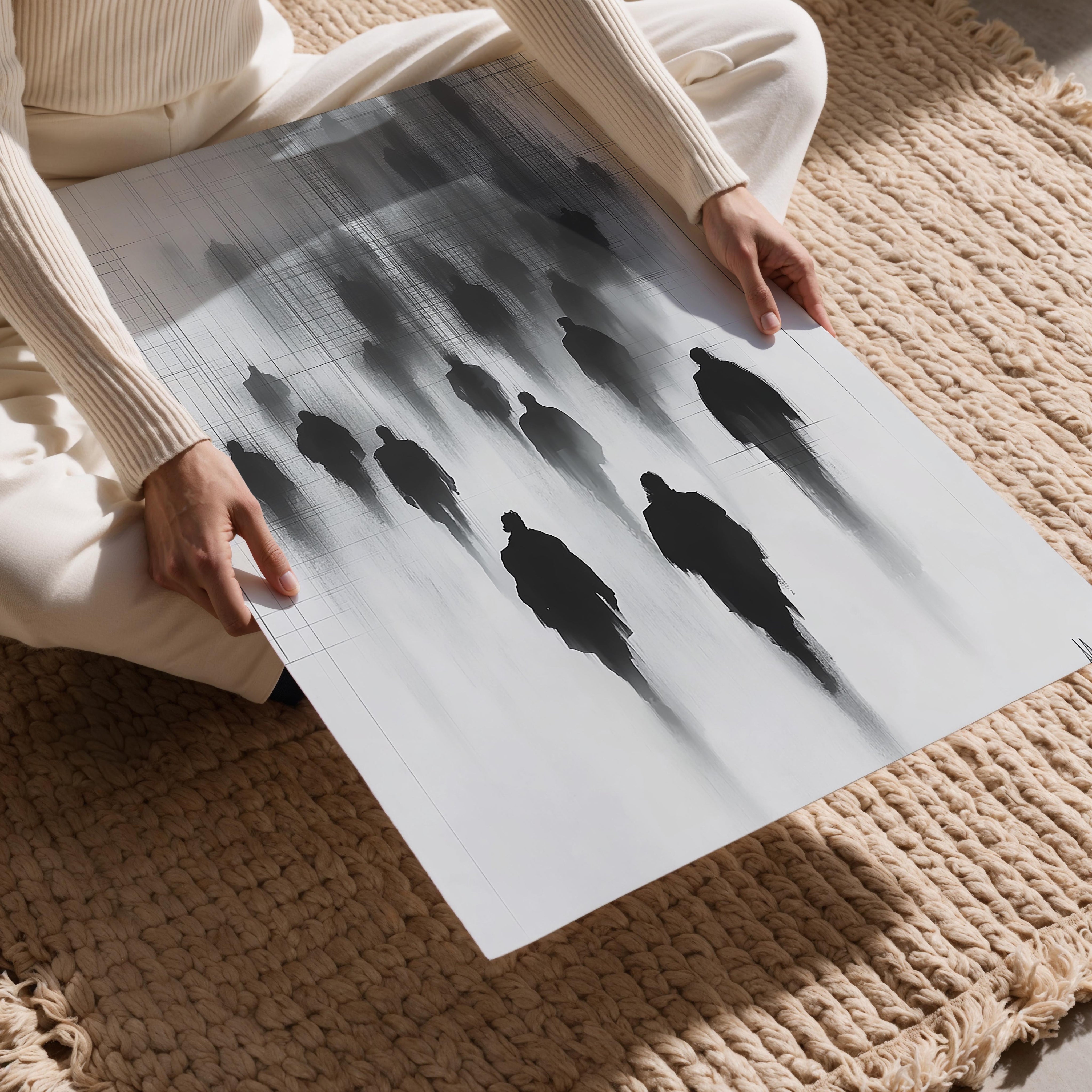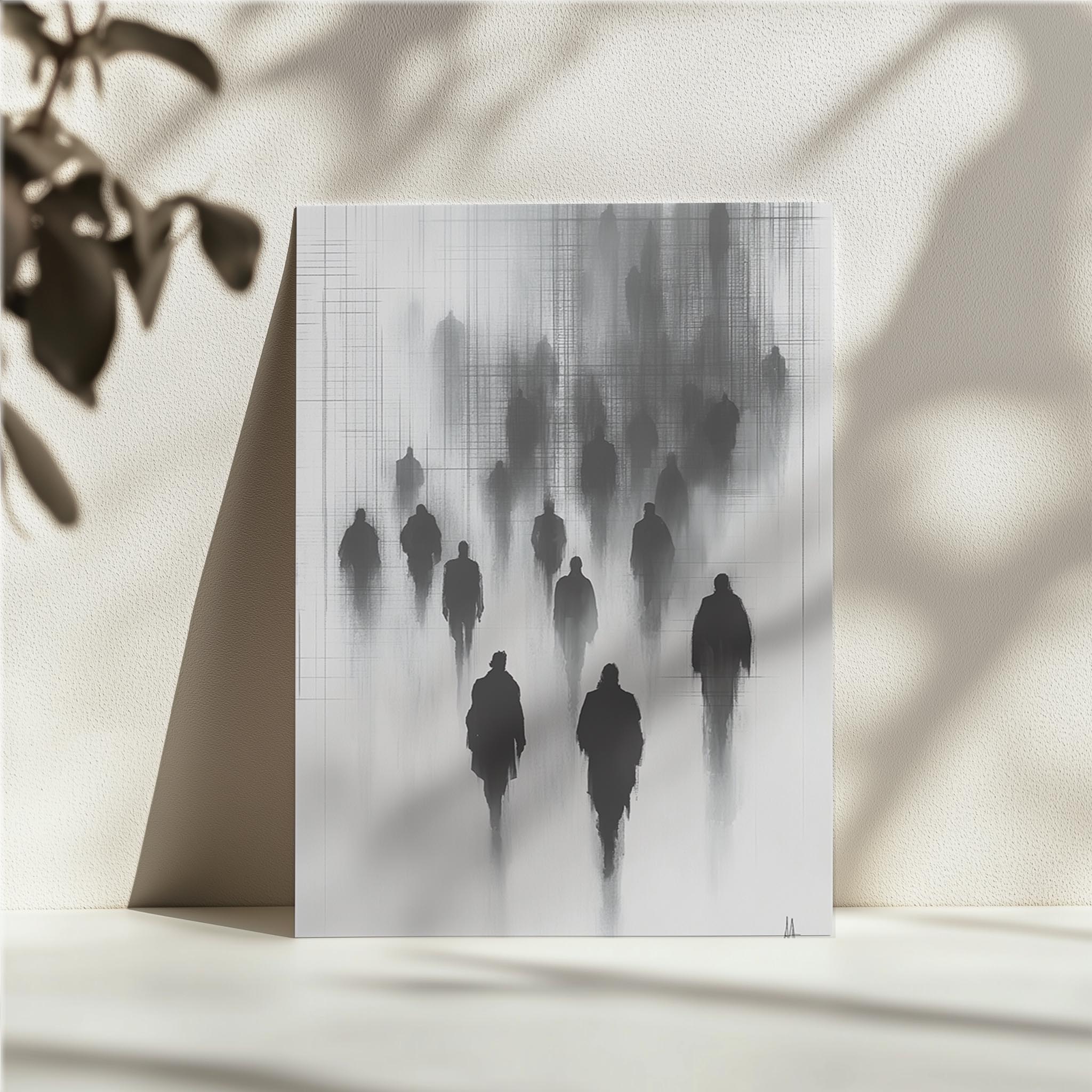 This piece portrays shadowy silhouettes of people walking amidst a surreal, misty atmosphere. The blend of abstraction and realism captures the essence of movement and anonymity, evoking feelings of introspection or urban isolation. This image is a thought-provoking choice for modern interiors, office spaces, or galleries focused on contemporary themes. Its monochrome aesthetic adds sophistication while encouraging deeper interpretation of its meaning. Perfect for those drawn to minimalist and striking artistic statements.