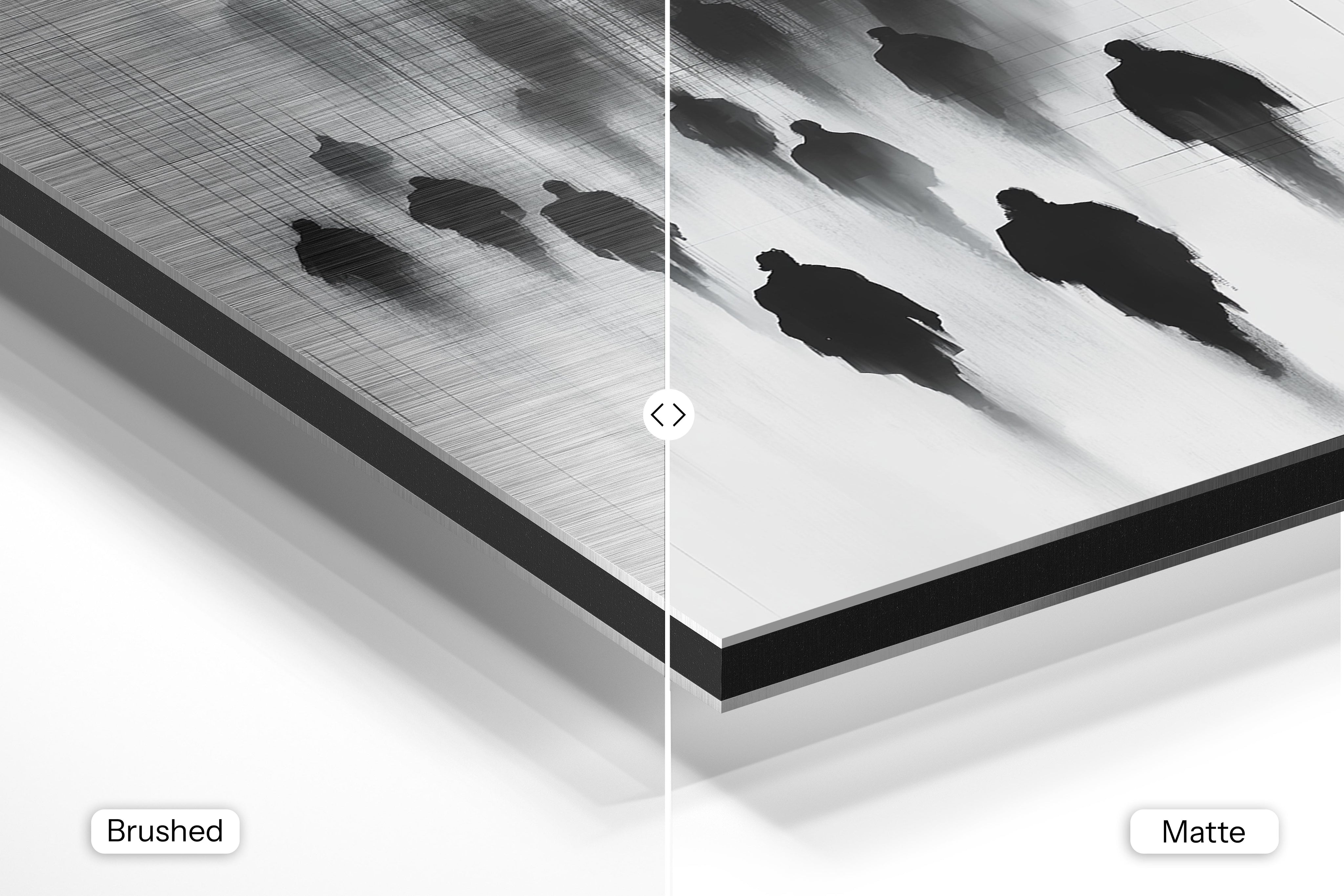 - Brushed Aluminum, on the other hand, features a raw metallic texture with visible brush strokes. Whites and highlights in your image let the silver surface show through, adding a dramatic, shimmering effect. Ideal for black-and-white images, minimalist designs, or abstract art, it creates a bold, industrial vibe with a modern edge.