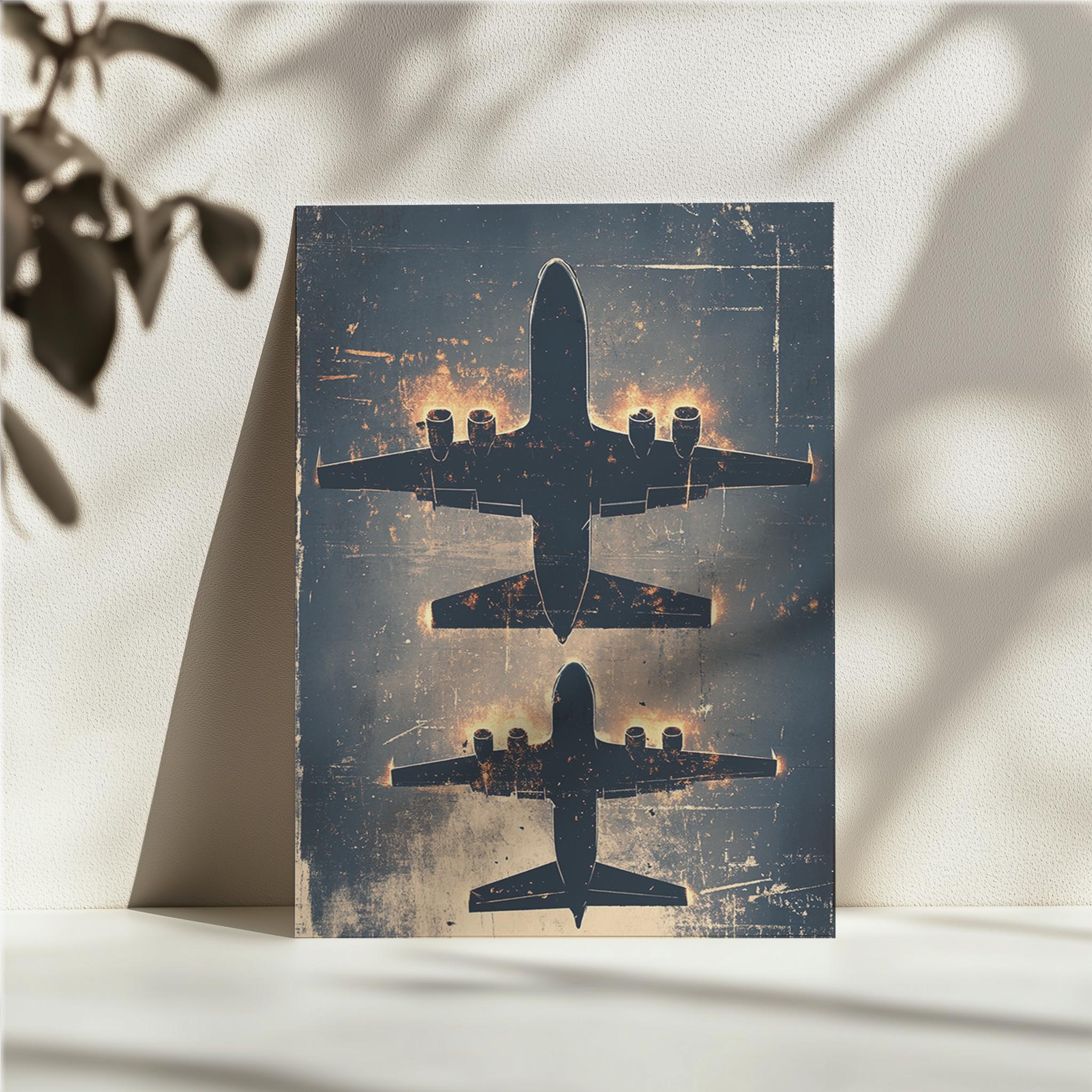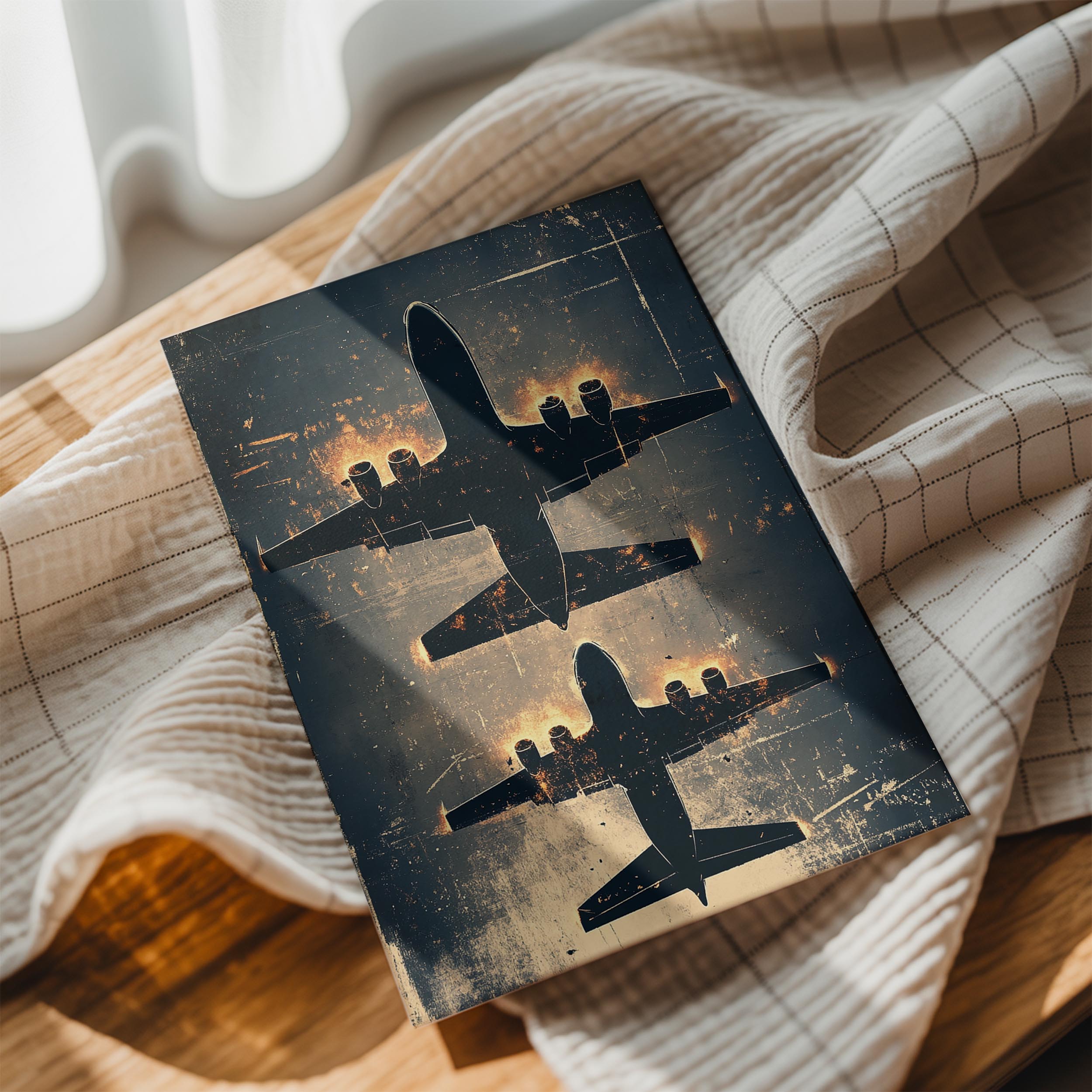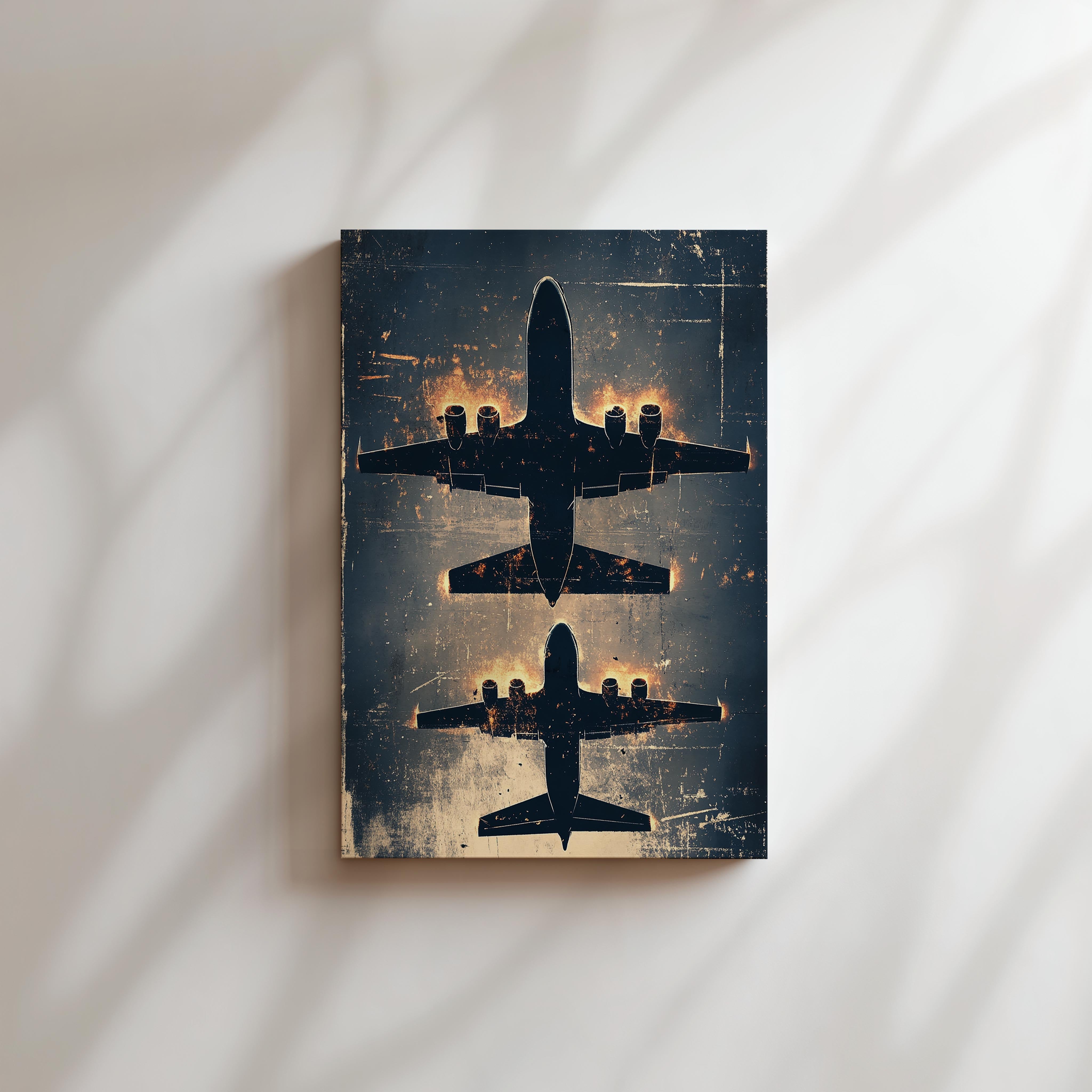 This minimalist yet bold portrayal of two aircraft silhouettes highlights their symmetry and design against a textured, aged background. The golden accents evoke a sense of nostalgia and elegance, making it perfect for enthusiasts of aviation history or vintage aesthetics. The artwork’s subdued tones offer versatility, blending seamlessly into office spaces, libraries, or personal study areas. With its striking simplicity, it communicates strength and timelessness, drawing the viewer into its quiet power and geometric beauty.