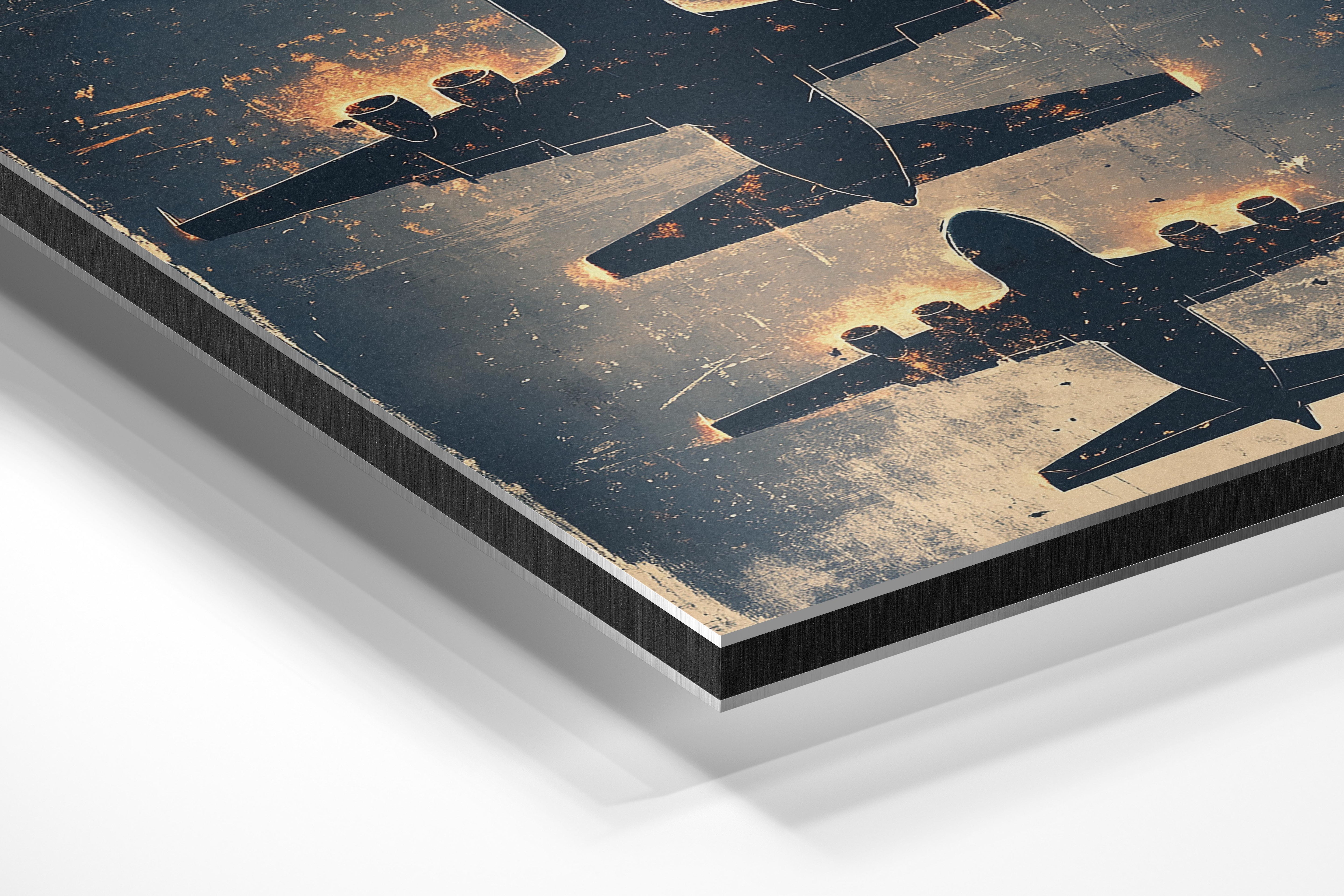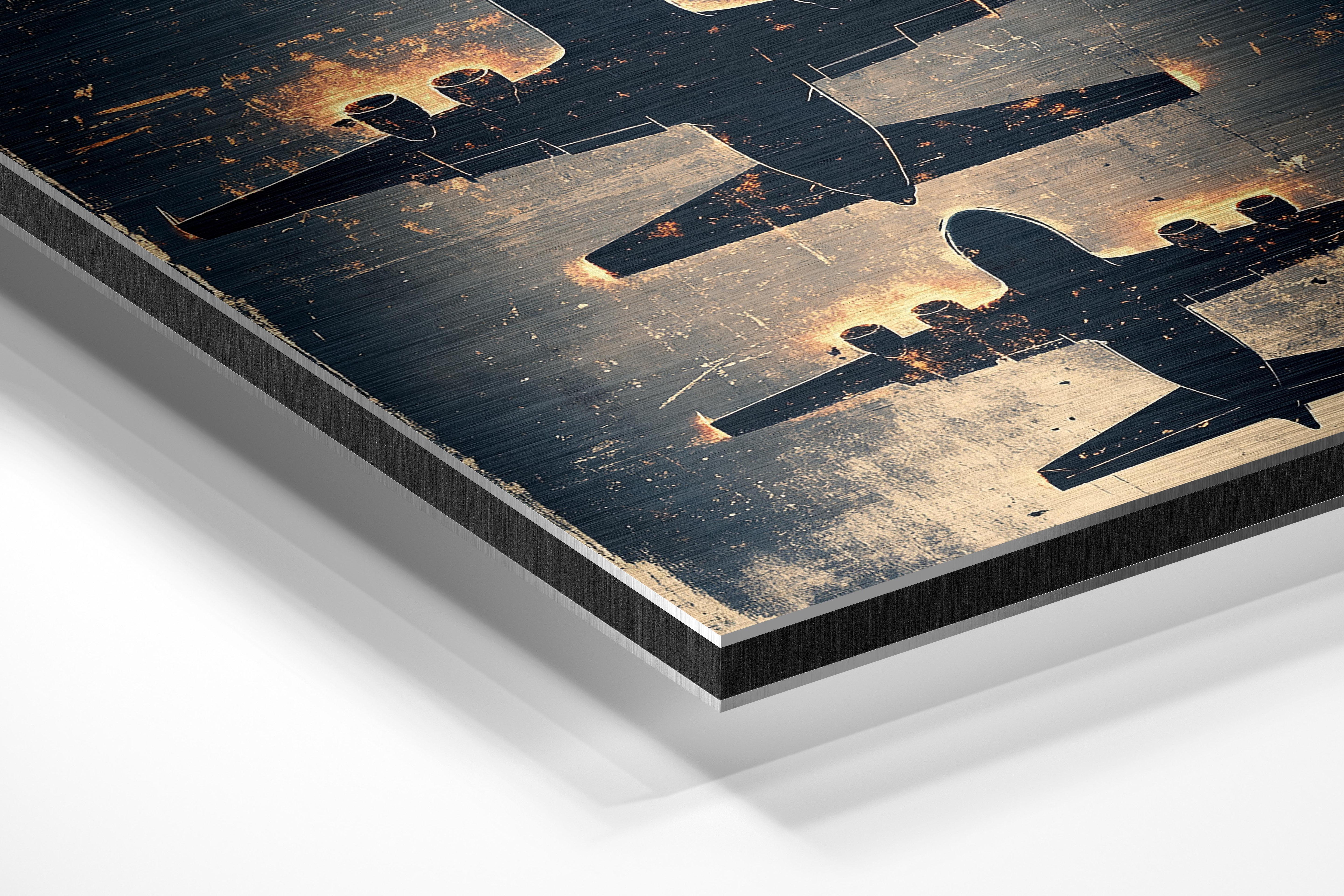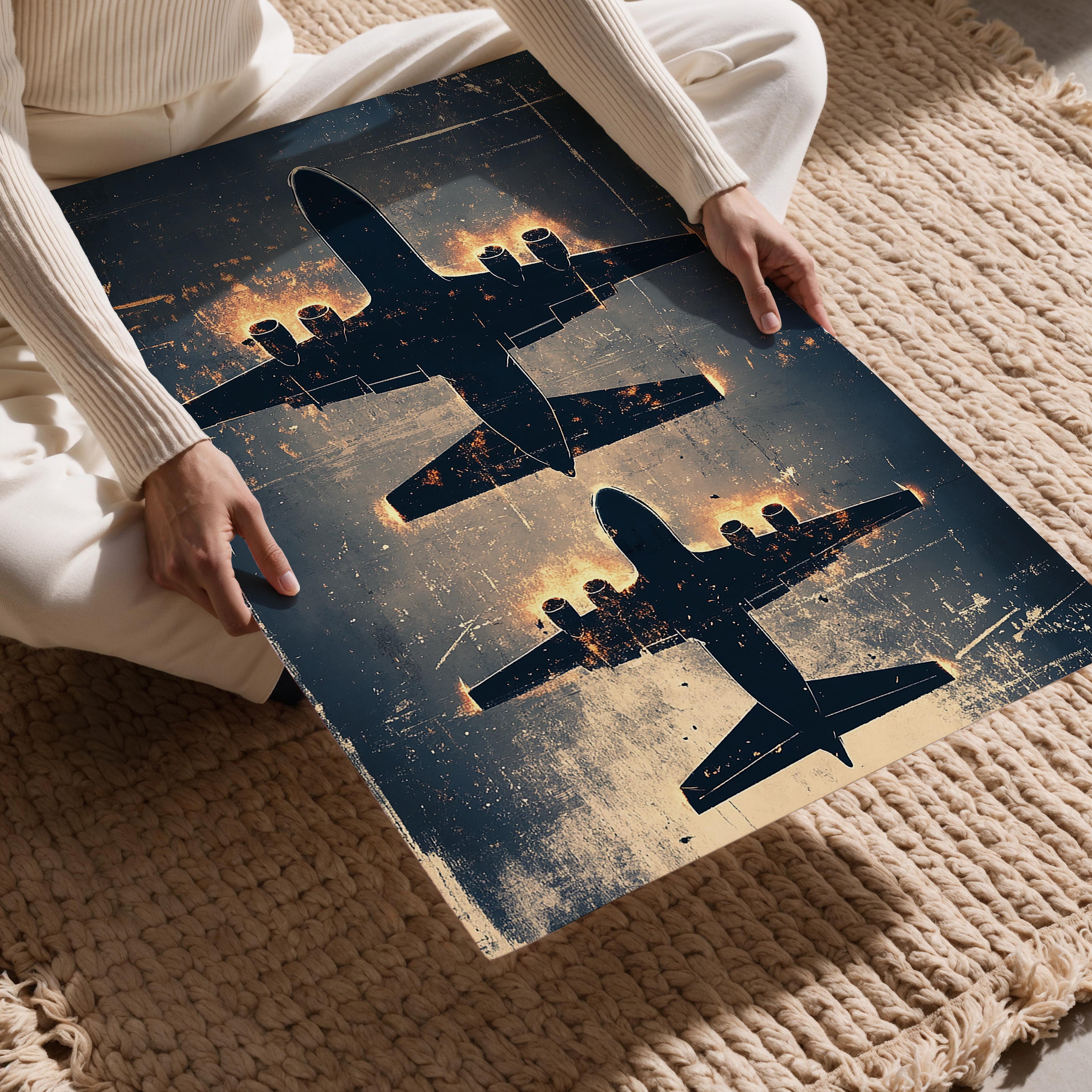 This minimalist yet bold portrayal of two aircraft silhouettes highlights their symmetry and design against a textured, aged background. The golden accents evoke a sense of nostalgia and elegance, making it perfect for enthusiasts of aviation history or vintage aesthetics. The artwork’s subdued tones offer versatility, blending seamlessly into office spaces, libraries, or personal study areas. With its striking simplicity, it communicates strength and timelessness, drawing the viewer into its quiet power and geometric beauty.