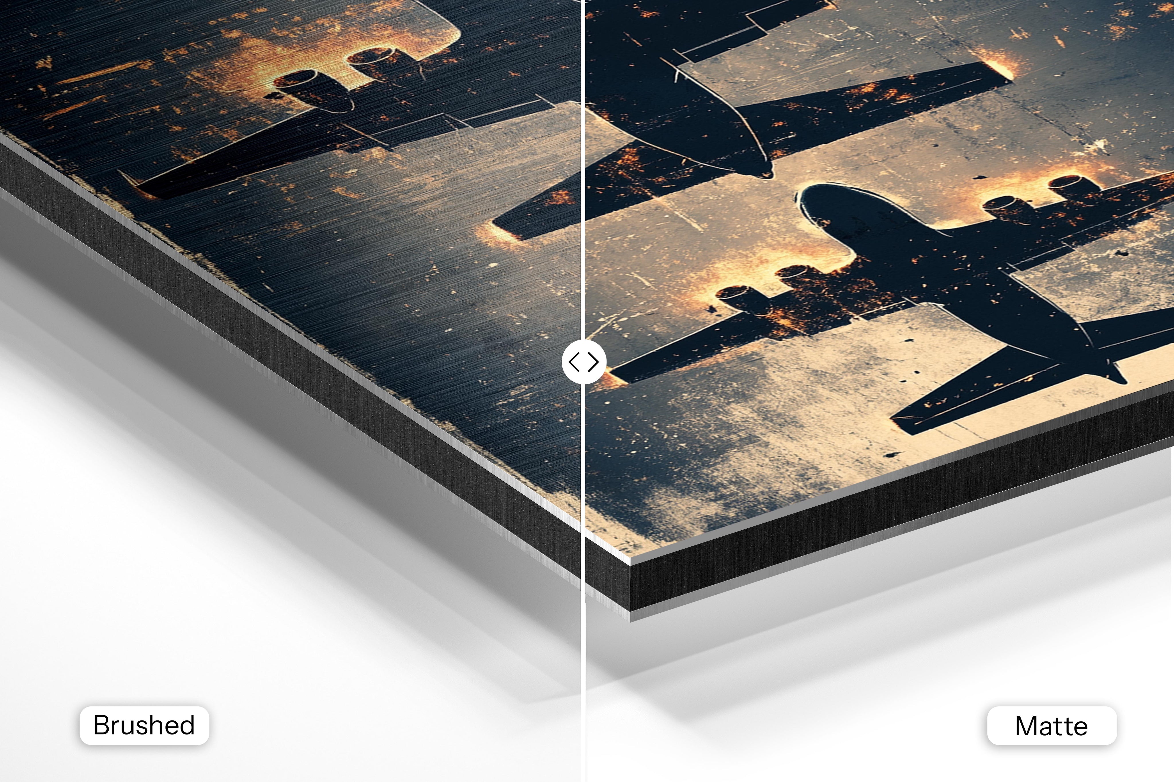 - Brushed Aluminum, on the other hand, features a raw metallic texture with visible brush strokes. Whites and highlights in your image let the silver surface show through, adding a dramatic, shimmering effect. Ideal for black-and-white images, minimalist designs, or abstract art, it creates a bold, industrial vibe with a modern edge.