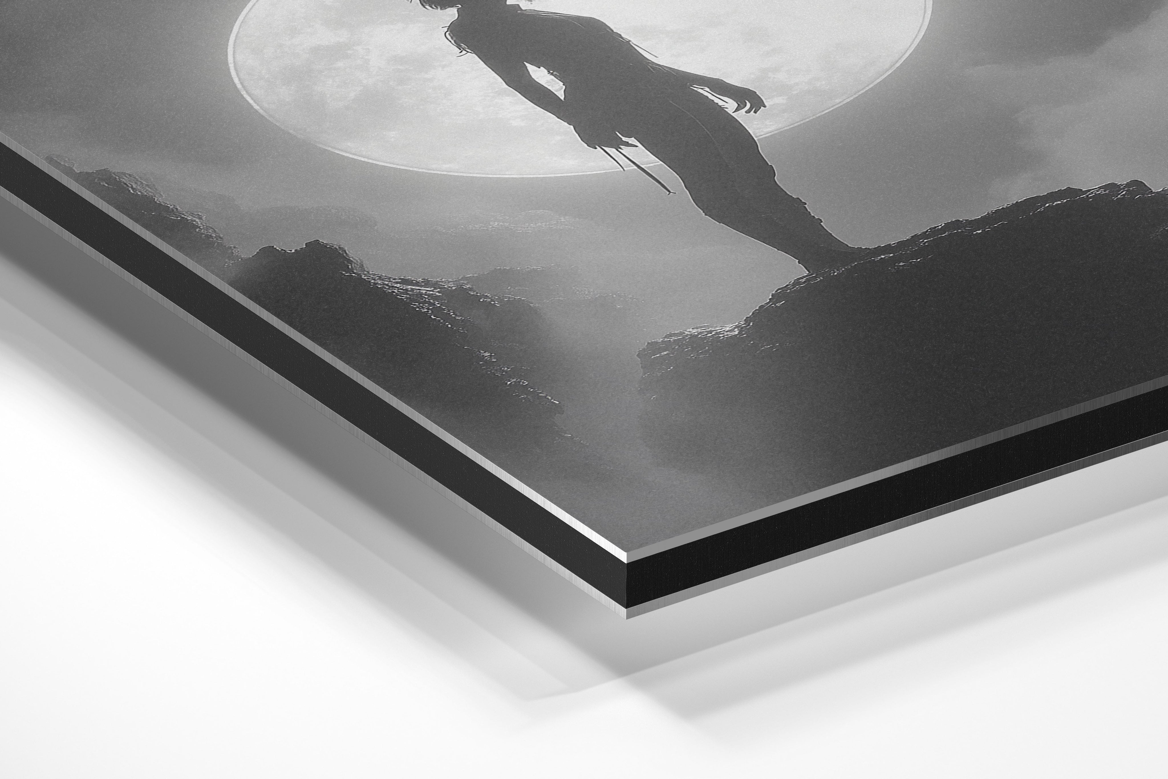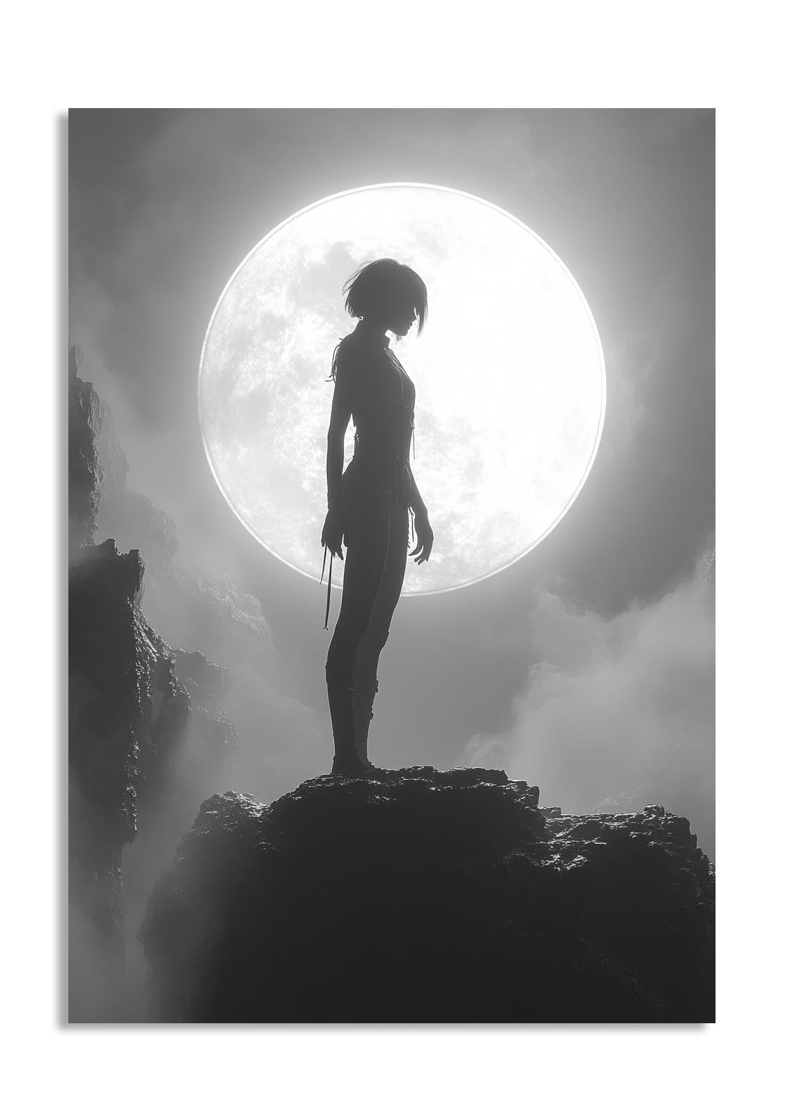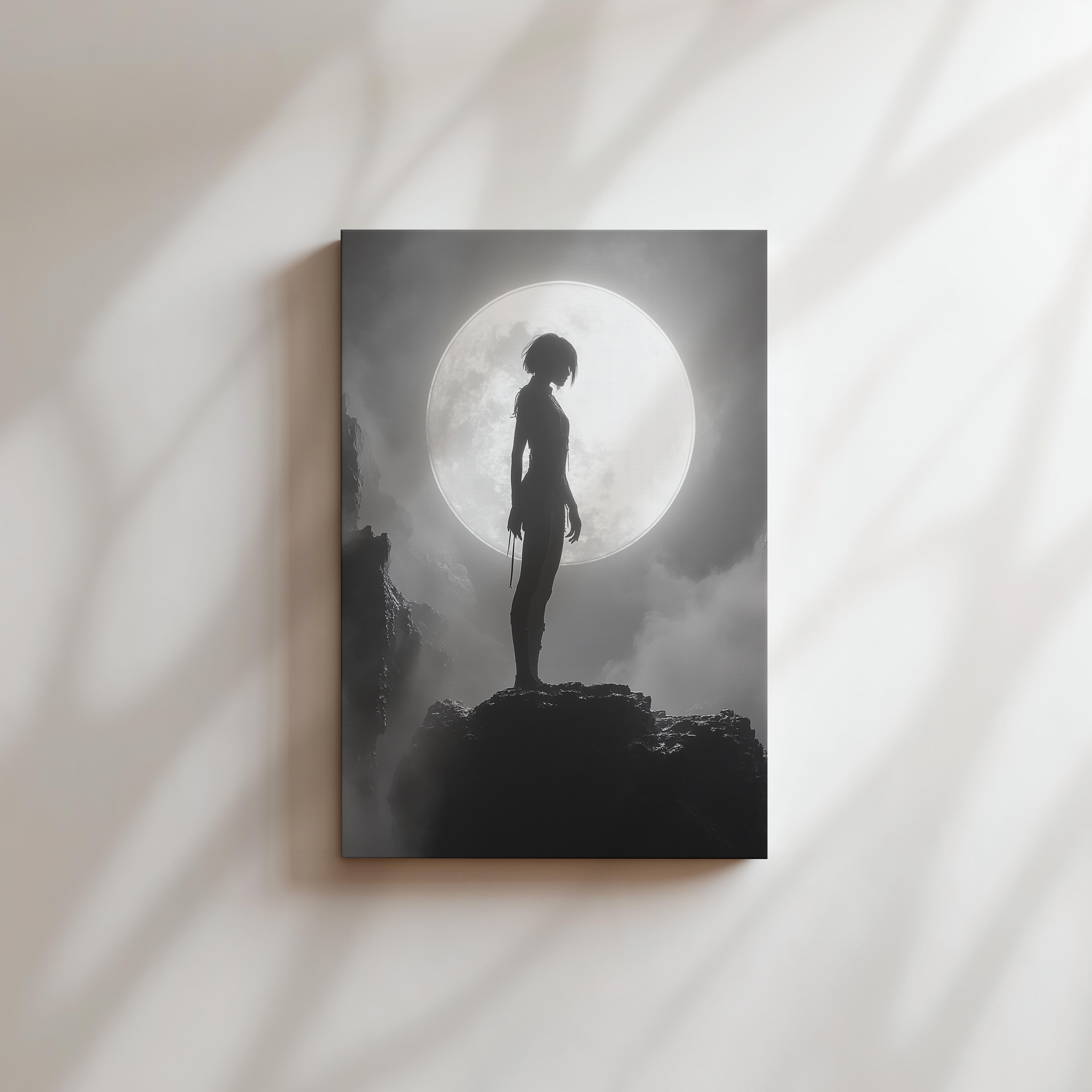 A captivating silhouette of a figure standing against a massive full moon, surrounded by a misty, ethereal atmosphere. The striking contrast between the dark silhouette and the bright moonlight creates a dramatic and dreamlike effect. Perfect for fantasy or nature-inspired interiors, this artwork evokes a sense of mystery and solitude. Its monochrome palette and surreal aesthetic make it a versatile addition to modern or minimalist spaces.