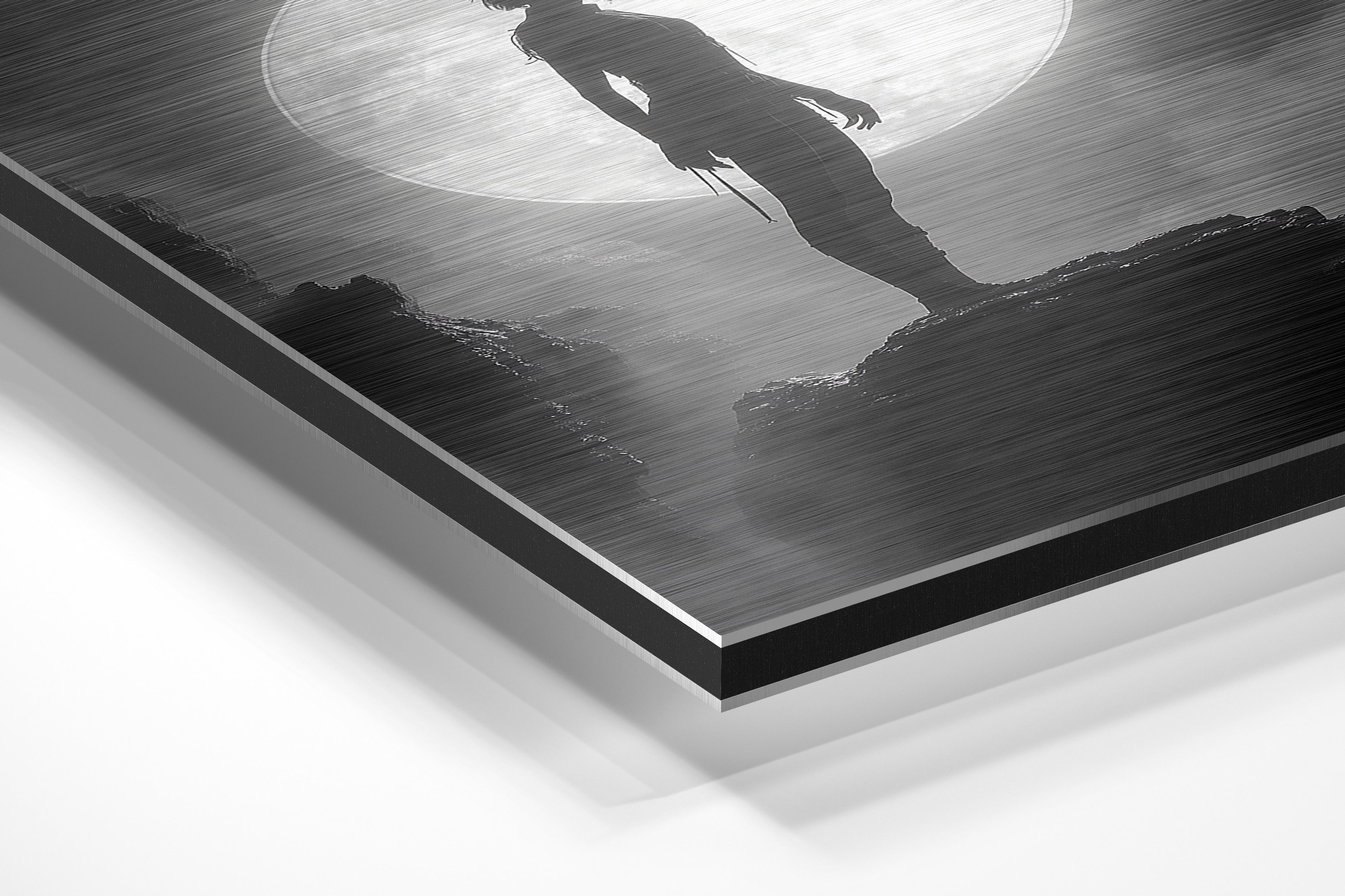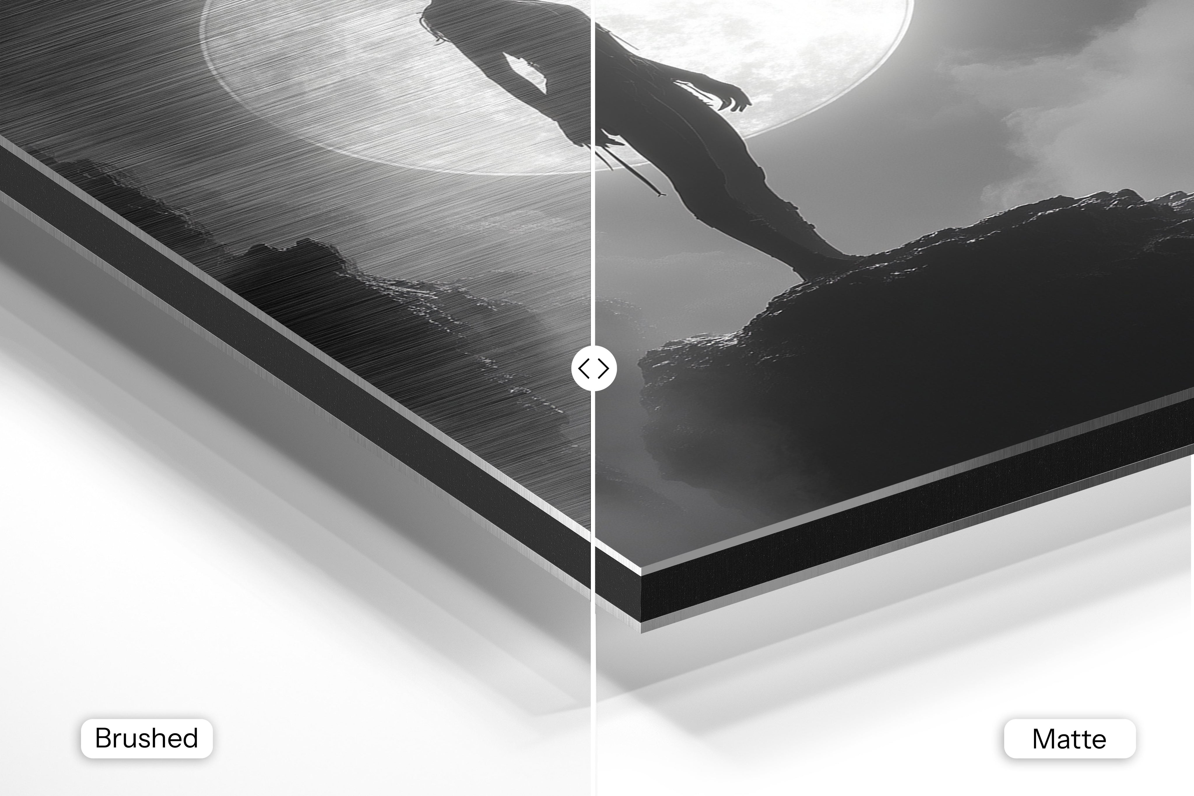 - Brushed Aluminum, on the other hand, features a raw metallic texture with visible brush strokes. Whites and highlights in your image let the silver surface show through, adding a dramatic, shimmering effect. Ideal for black-and-white images, minimalist designs, or abstract art, it creates a bold, industrial vibe with a modern edge.
