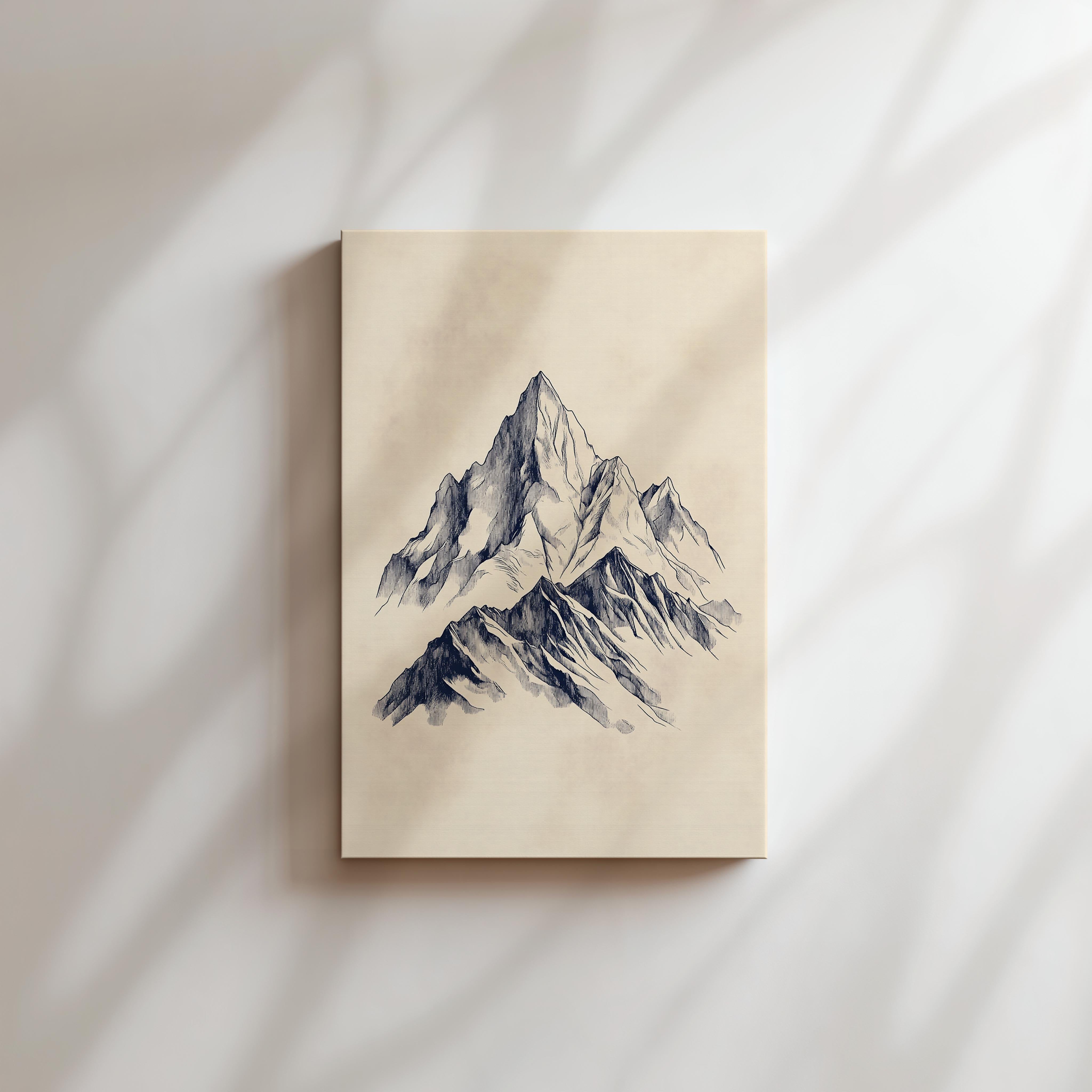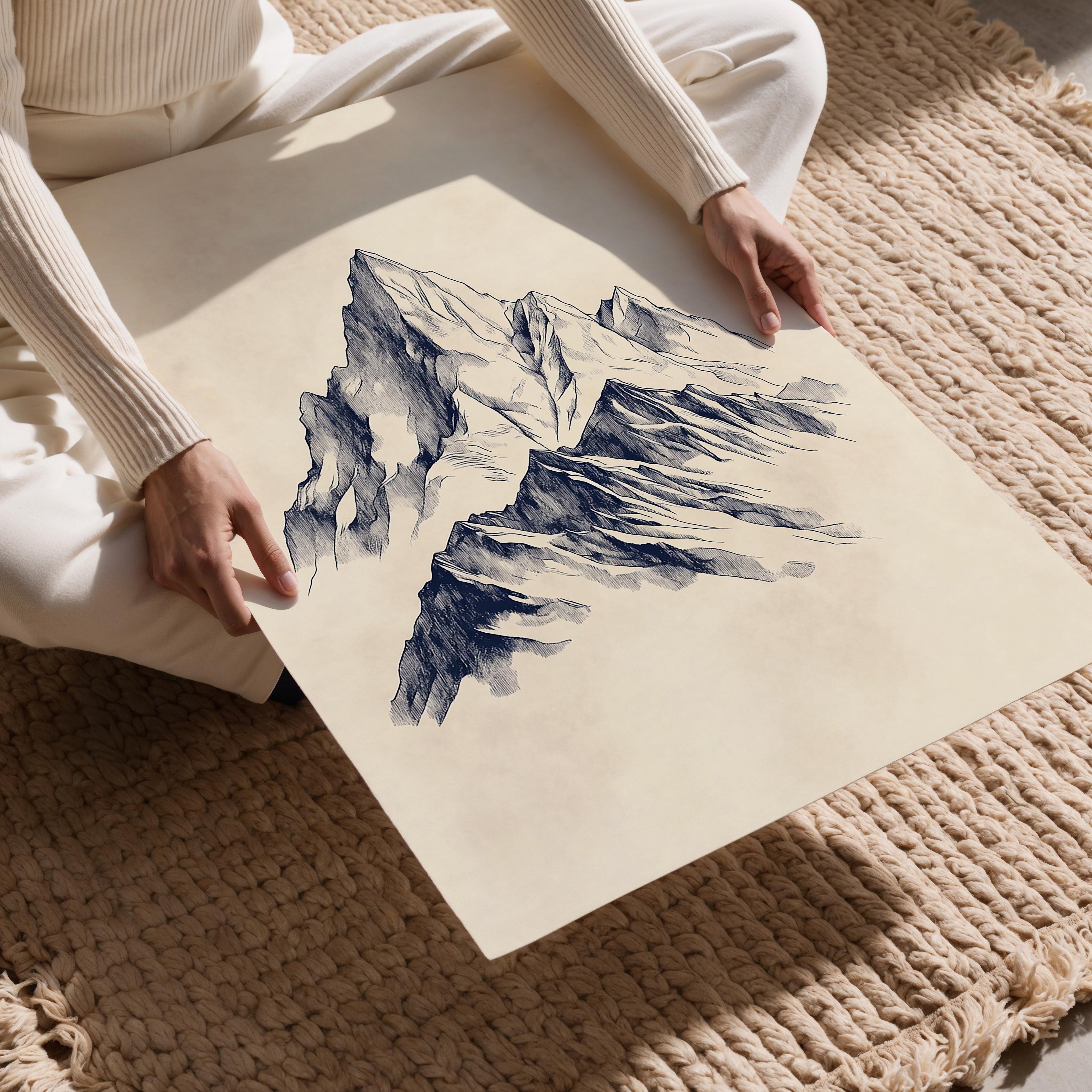 The sketched rendition of mountain peaks in this artwork highlights intricate details and a rustic charm. Its hand-drawn style fits seamlessly into natural or minimalist decor, appealing to those who value artistic craftsmanship and nature's majesty.