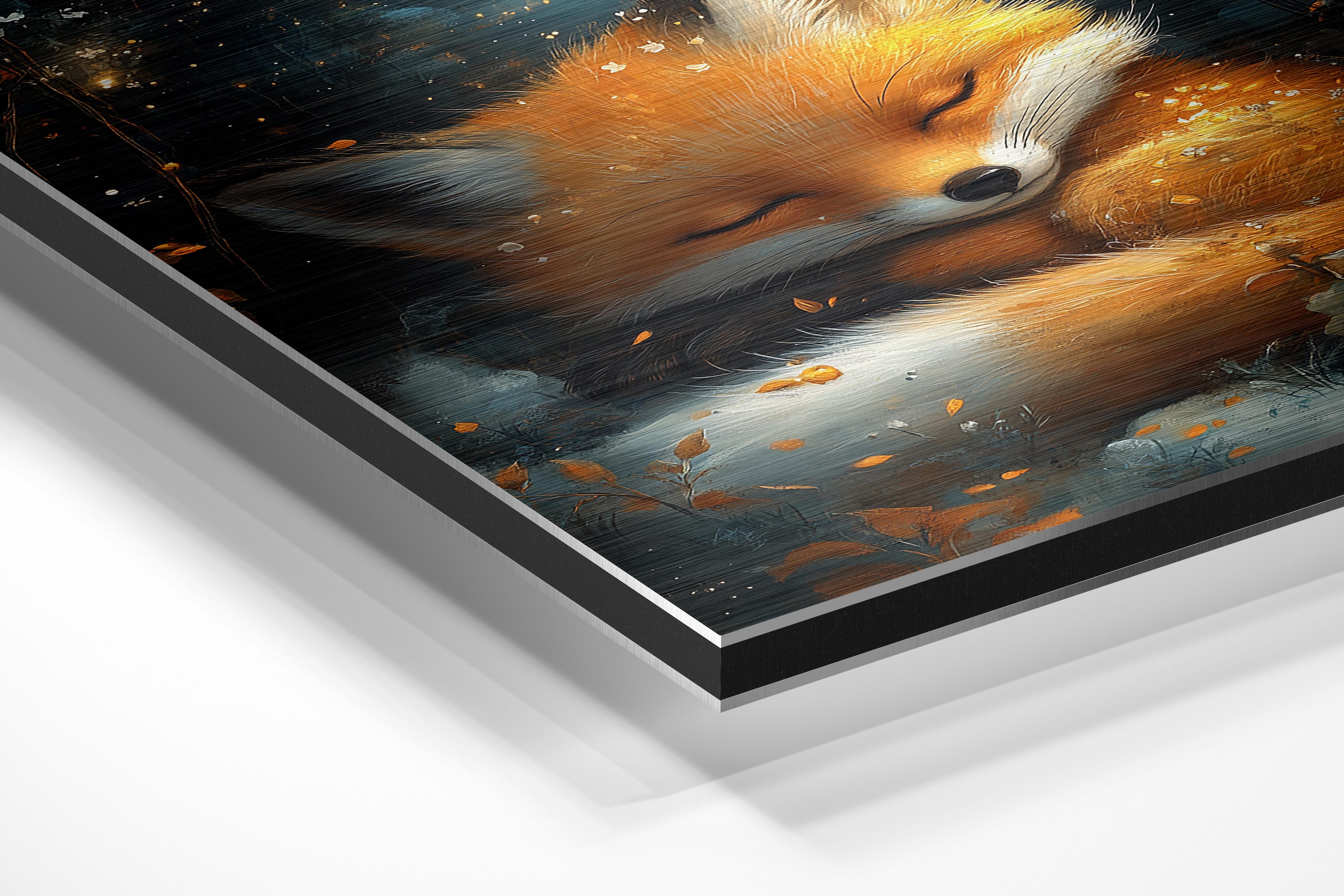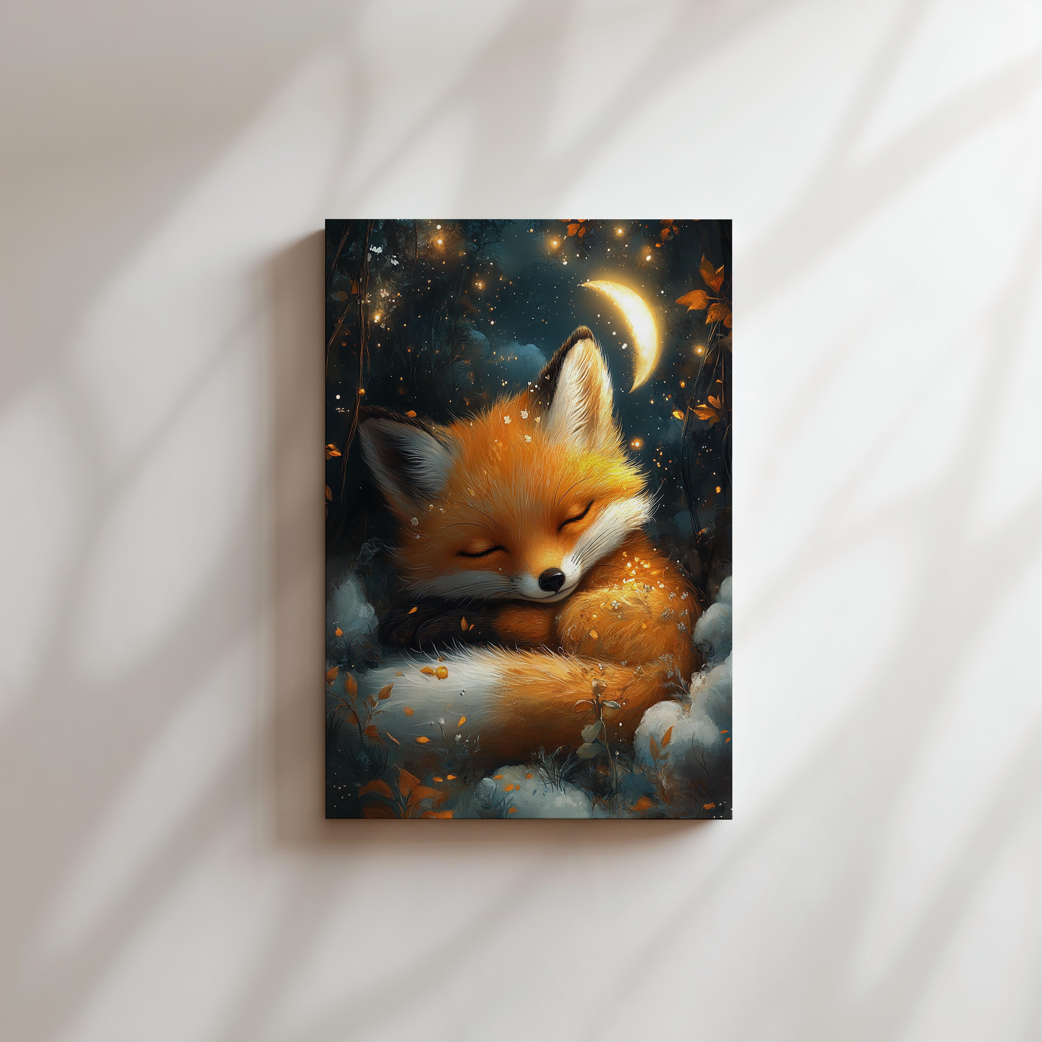 A tranquil image of a fox peacefully curled up beneath a crescent moon. The soft, warm hues of the fox’s fur contrast beautifully with the cool, starry night sky. The gentle glow of the moon casts a serene ambiance, inviting feelings of comfort and peace. The delicate details of the surrounding foliage enhance the enchanting atmosphere, making this piece perfect for cozy spaces like bedrooms or reading nooks. It’s a celebration of calm and quiet moments, bringing warmth and serenity to any room.