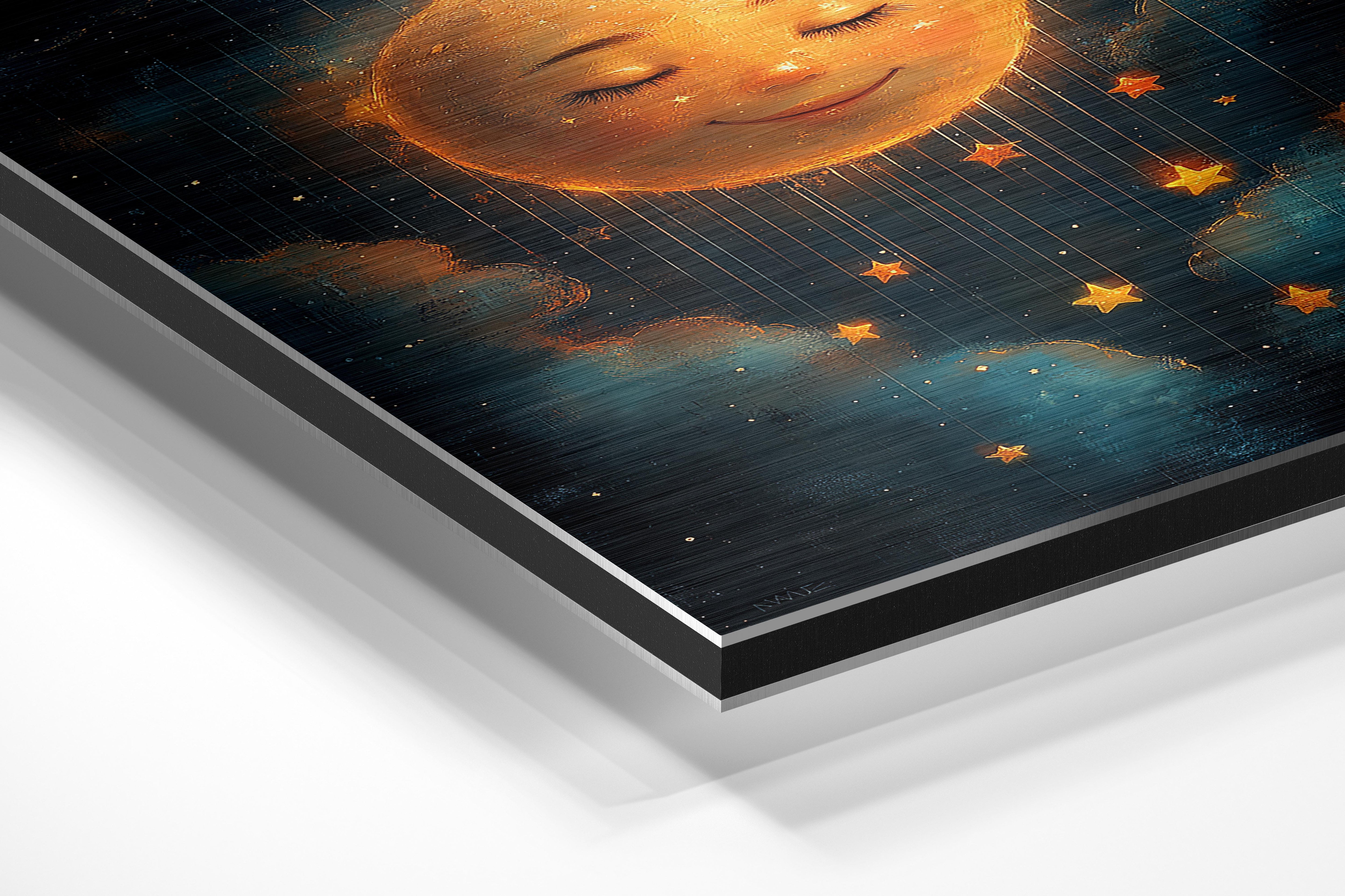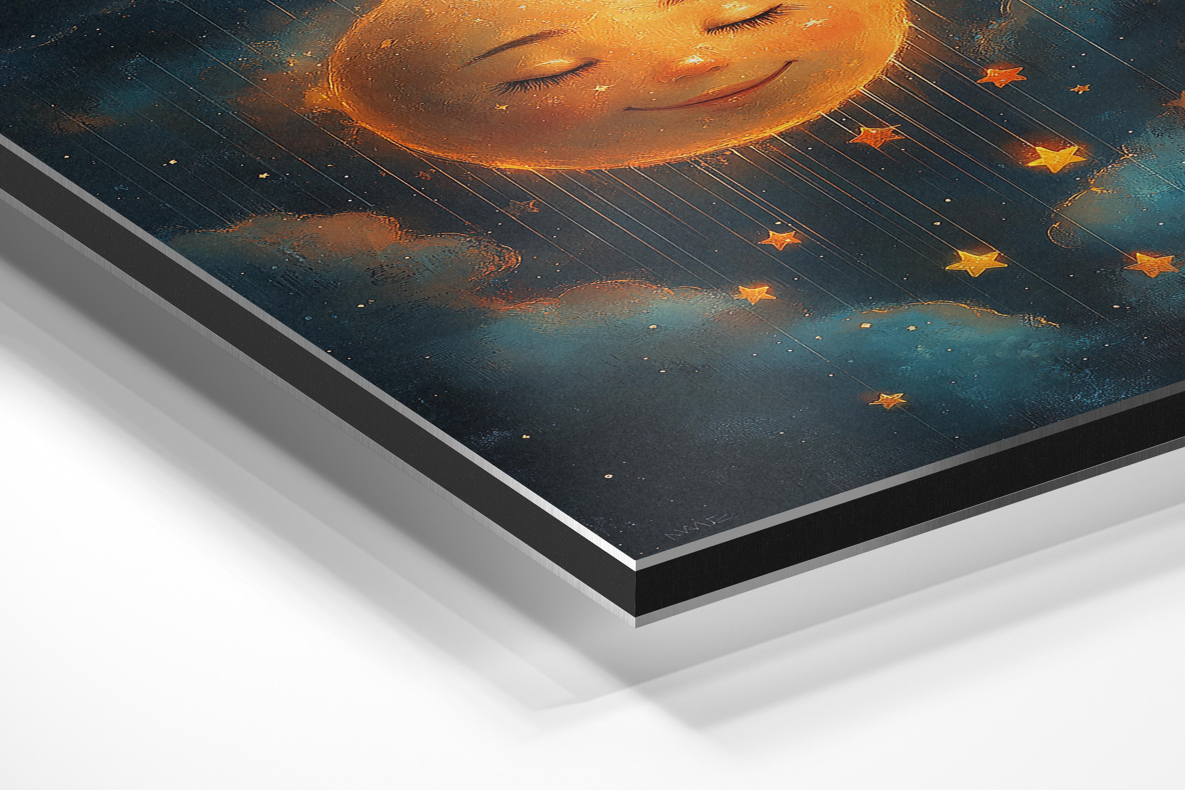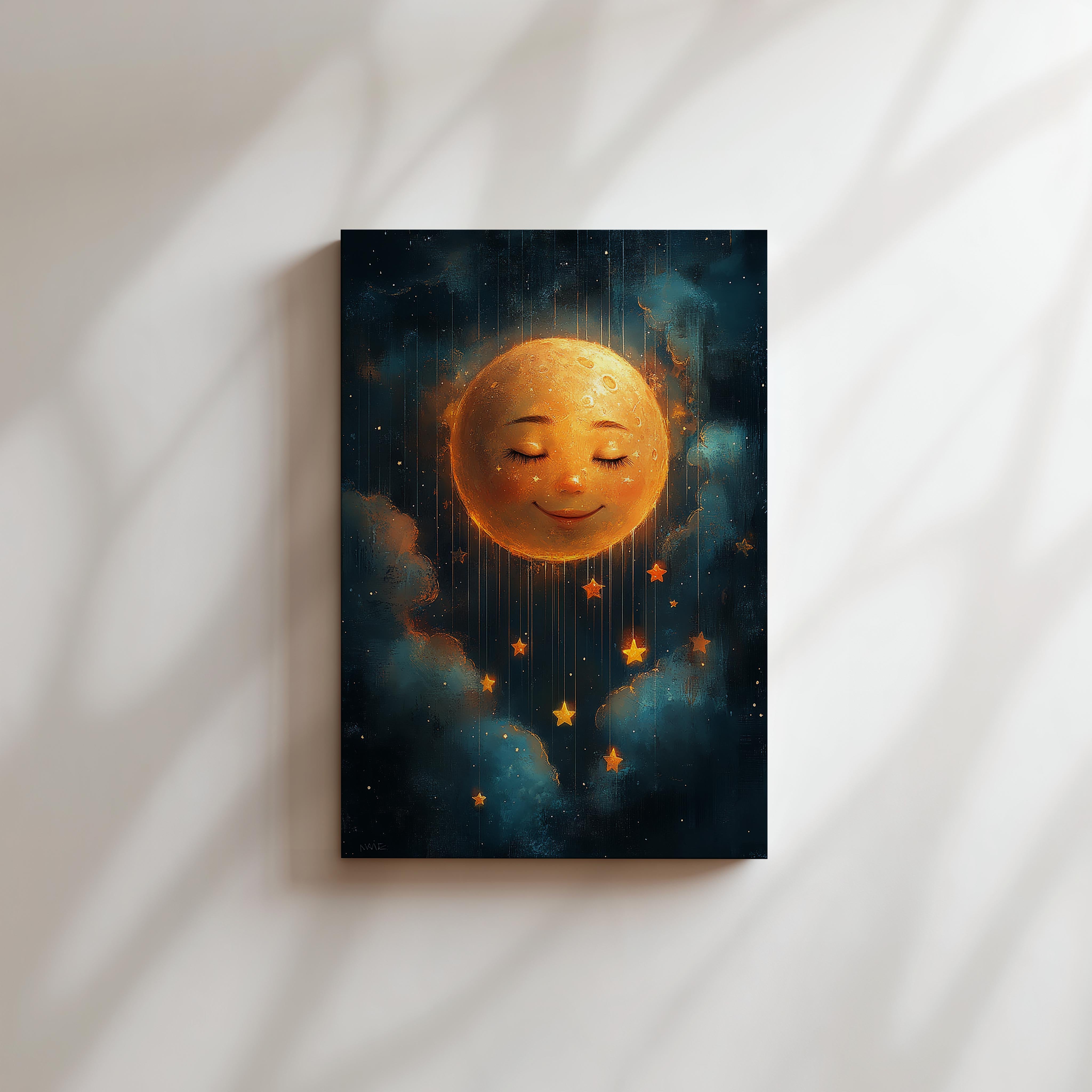 A dreamy, celestial image of a smiling moon surrounded by twinkling stars, set against a deep blue sky. The soft glow and whimsical expression of the moon create a sense of comfort and serenity, making it an excellent addition to bedrooms or nurseries. This piece evokes feelings of calm and wonder, offering a touch of magic to any space. It is perfect for those who love stargazing or celestial themes, adding a warm, inviting charm to walls with its gentle and soothing aesthetic.