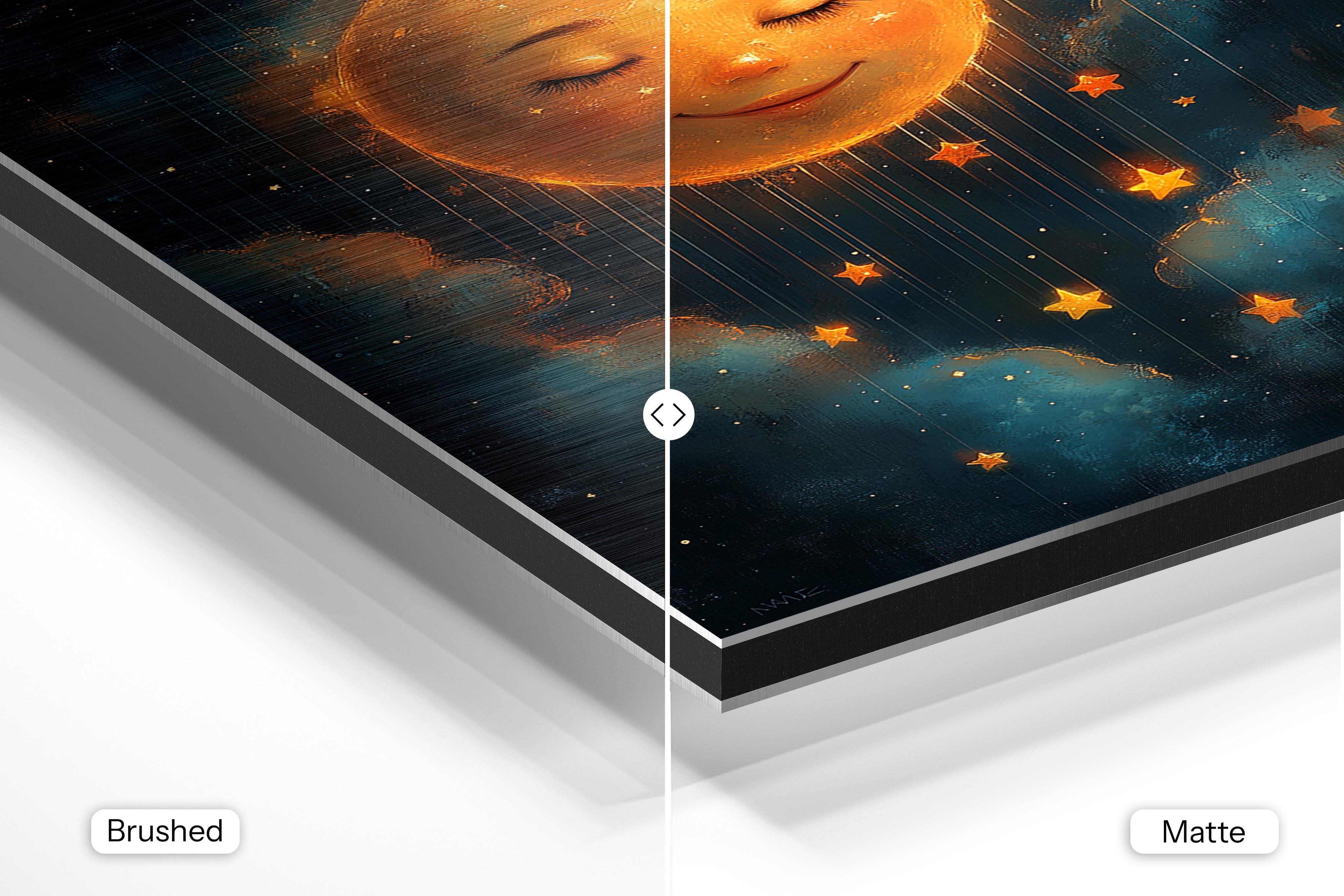 - Brushed Aluminum, on the other hand, features a raw metallic texture with visible brush strokes. Whites and highlights in your image let the silver surface show through, adding a dramatic, shimmering effect. Ideal for black-and-white images, minimalist designs, or abstract art, it creates a bold, industrial vibe with a modern edge.