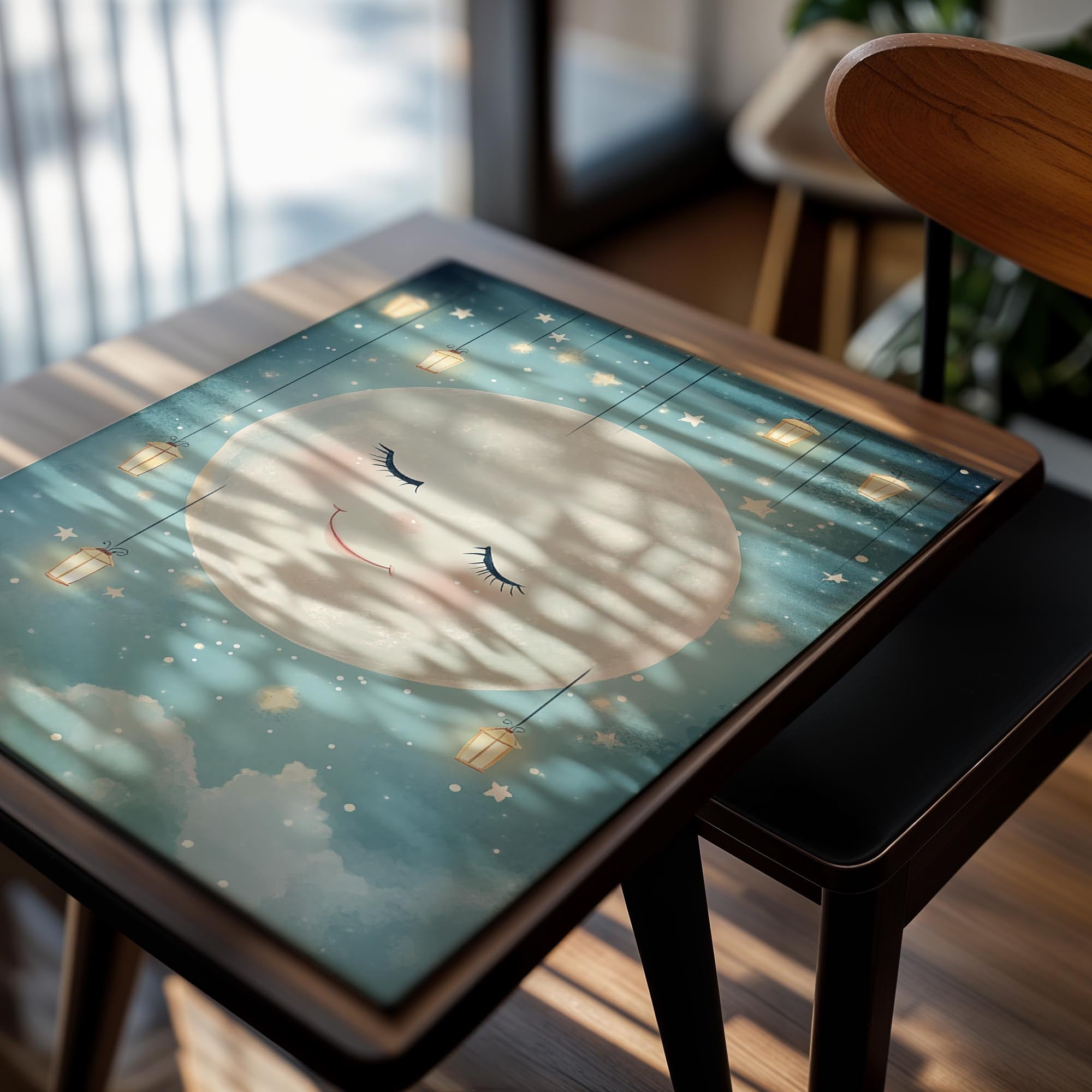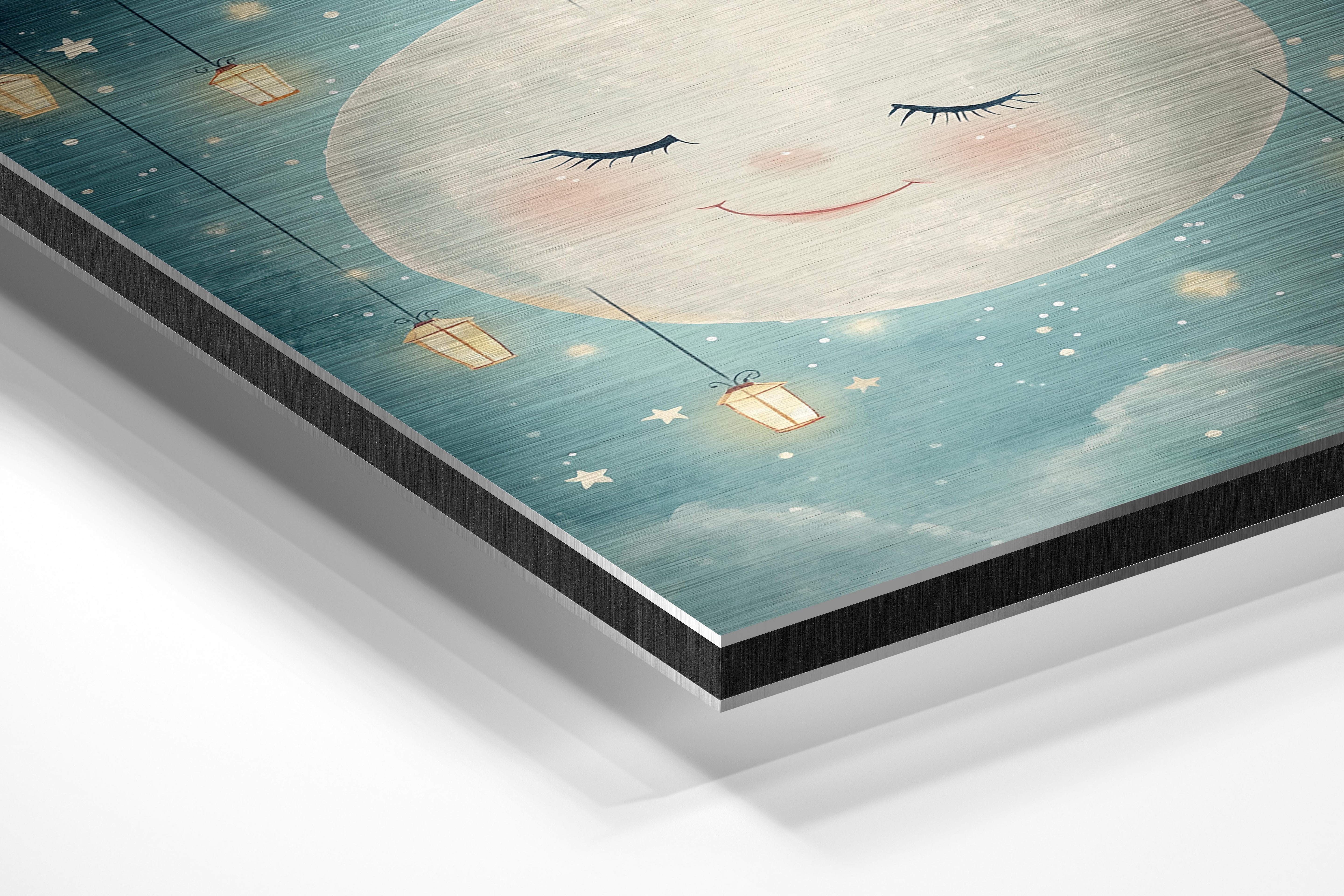 This charming piece depicts a smiling moon surrounded by glowing lanterns and twinkling stars. The soft blues of the night sky, combined with the warm golden light of the lanterns, create a cozy and comforting atmosphere. The moon’s gentle expression adds a whimsical touch, making it a perfect addition to nurseries, bedtime spaces, or meditation corners. The combination of serene colors and playful details ensures that this artwork appeals to both children and adults, bringing peace and a sense of wonder to any room.
