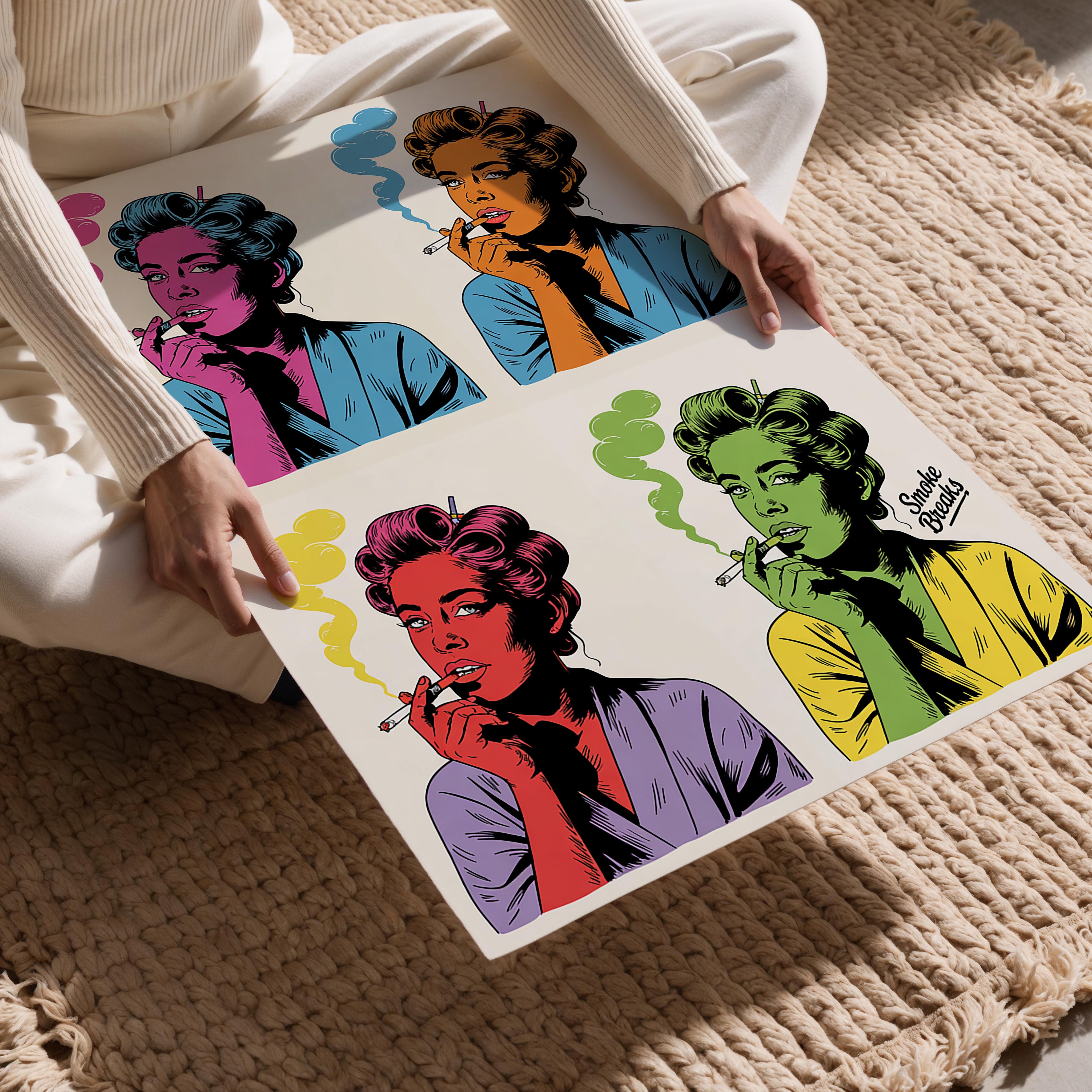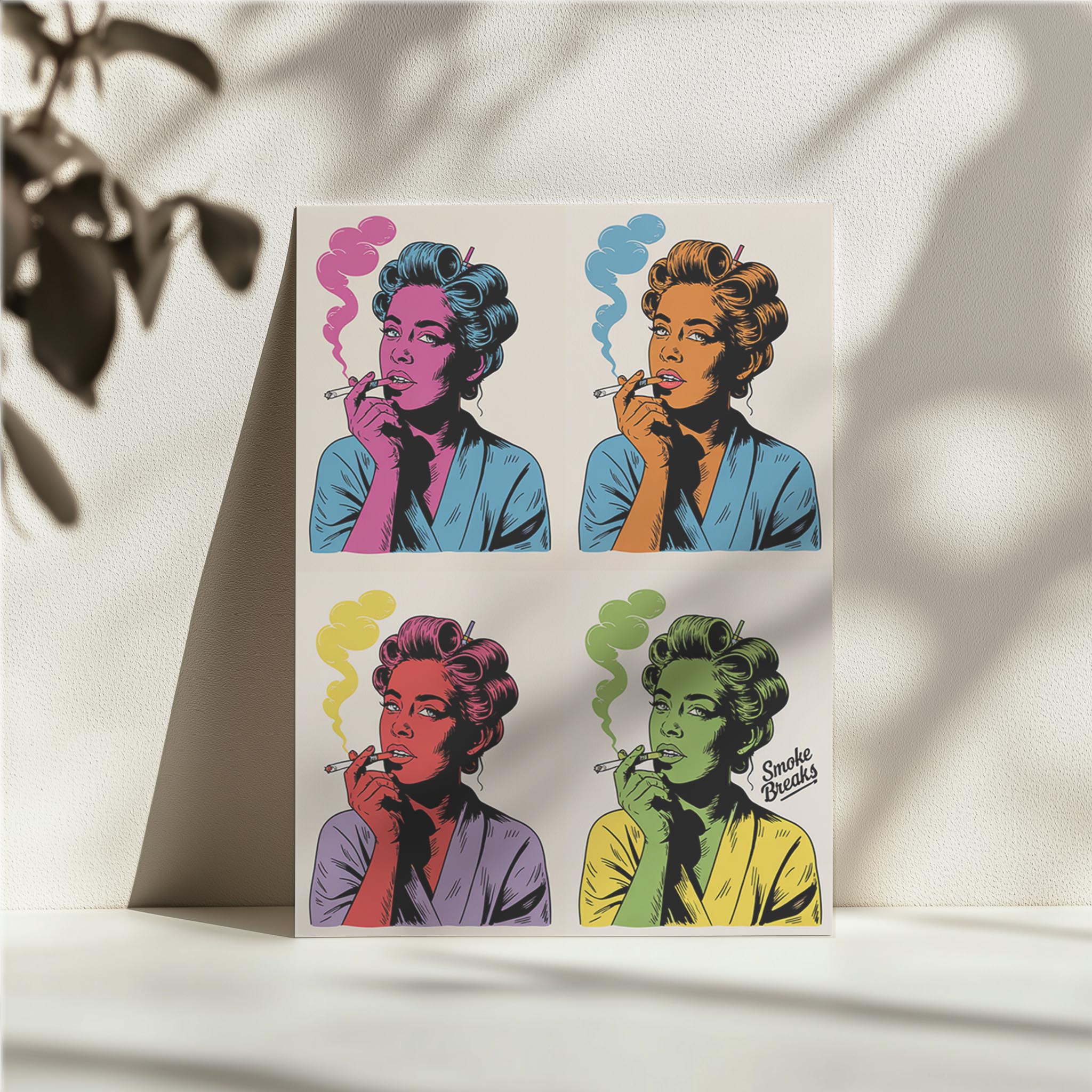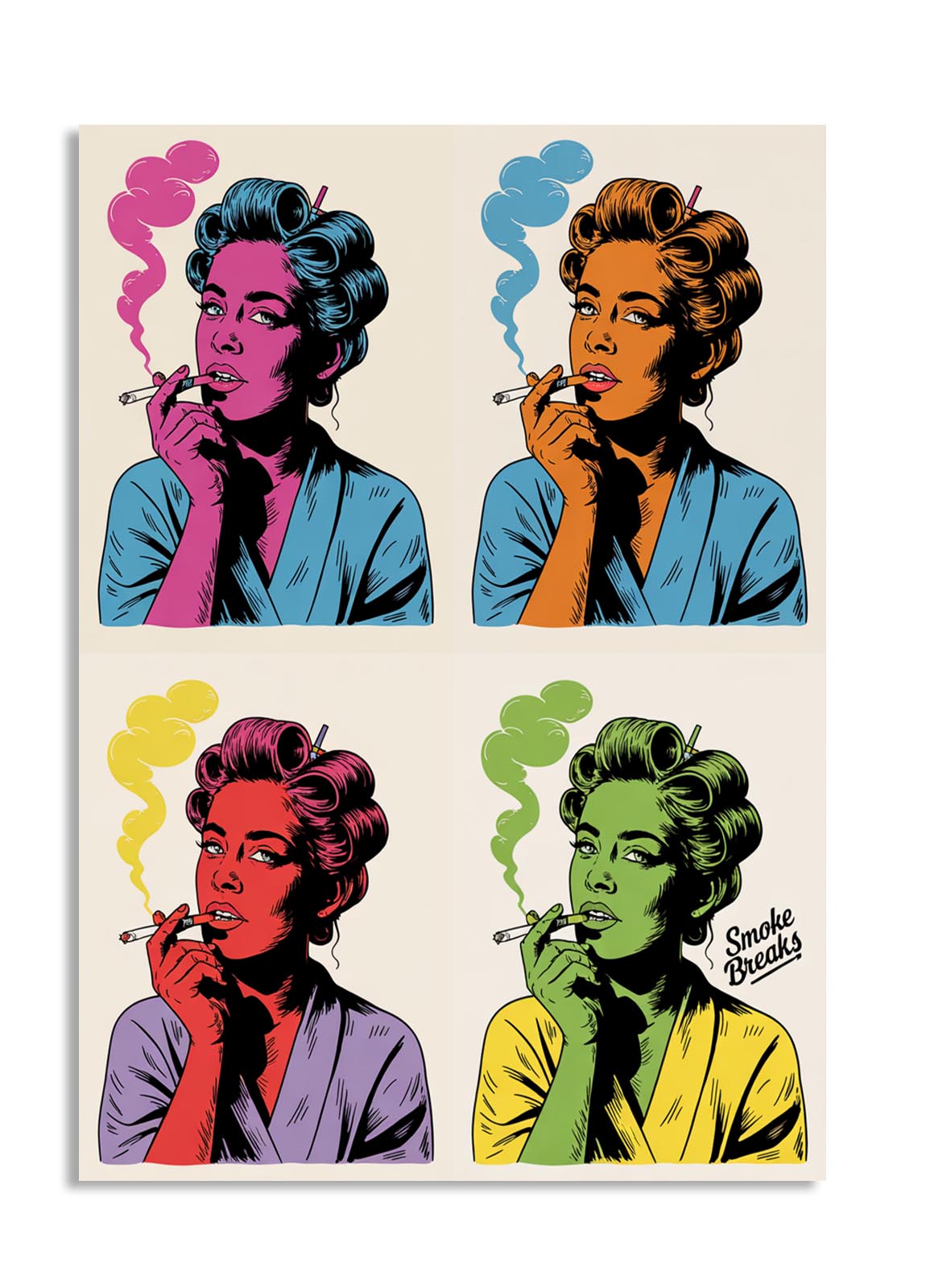 This image showcases a pop art-inspired quartet of a glamorous woman smoking, each variation rendered in bold, contrasting color schemes. The repetition with differing hues—magenta, orange, red, and green—evokes a Warhol-esque vibe, infusing retro appeal with modern irony. The woman’s relaxed expression, hair curlers, and rising colored smoke suggest a mid-century domestic archetype enjoying a rebellious pause. The inclusion of the phrase “Smoke Breaks” in the fourth quadrant adds a satirical twist, hinting at a blend of nostalgia and critique. This piece would suit pop culture enthusiasts and collectors of retro-inspired art. Ideal for hanging in creative offices, cafes, or trendy living spaces.