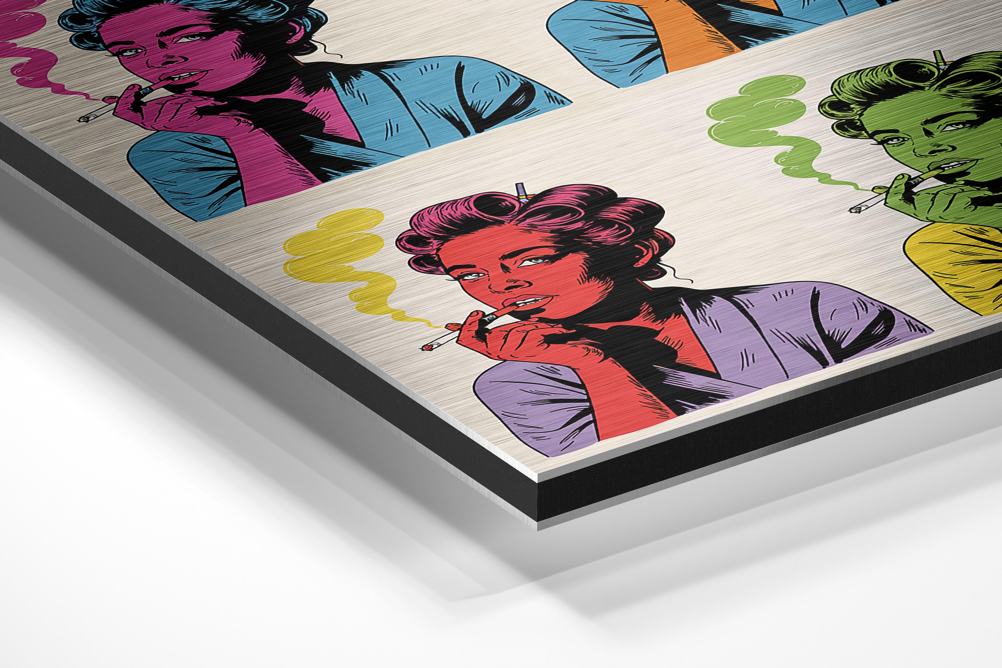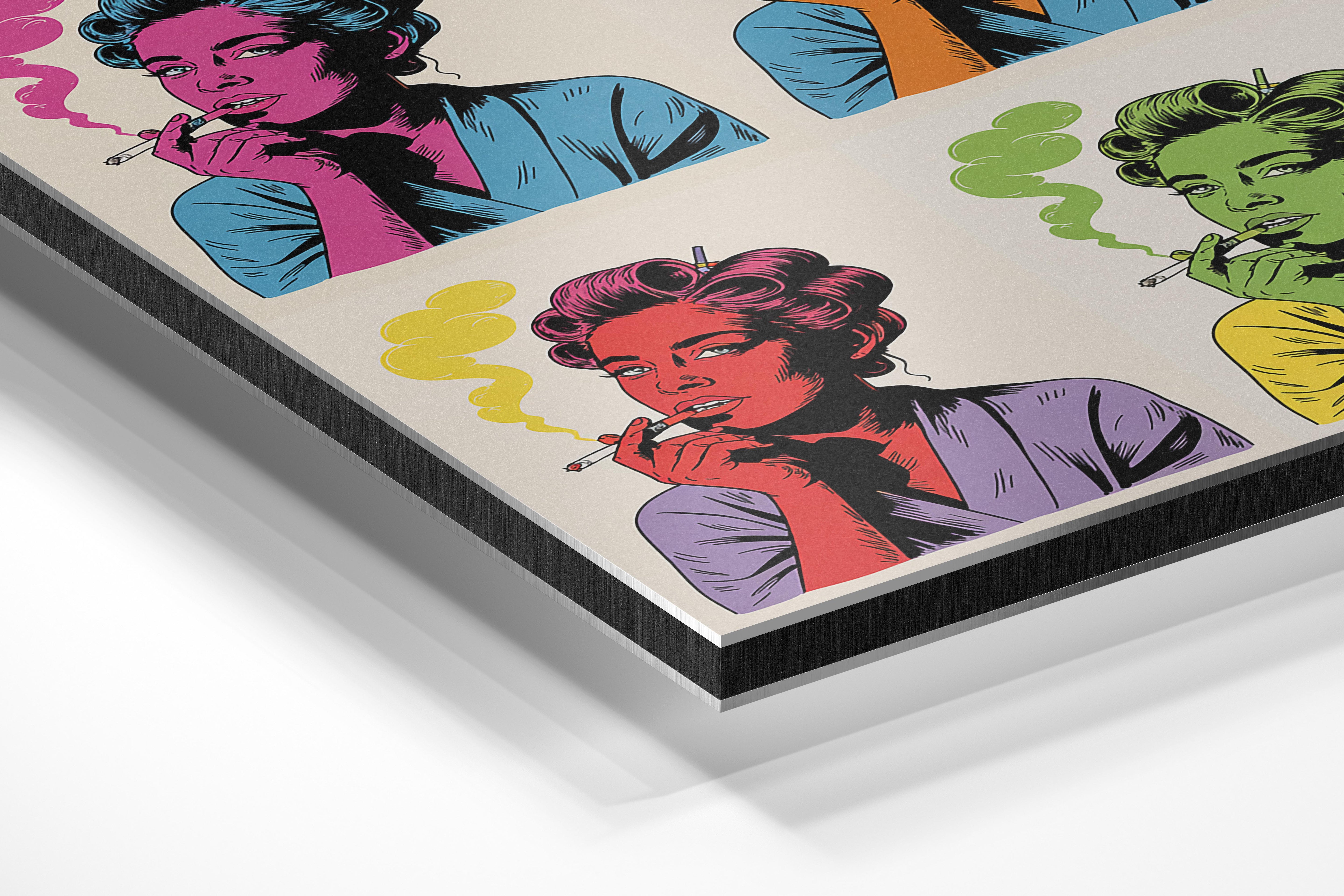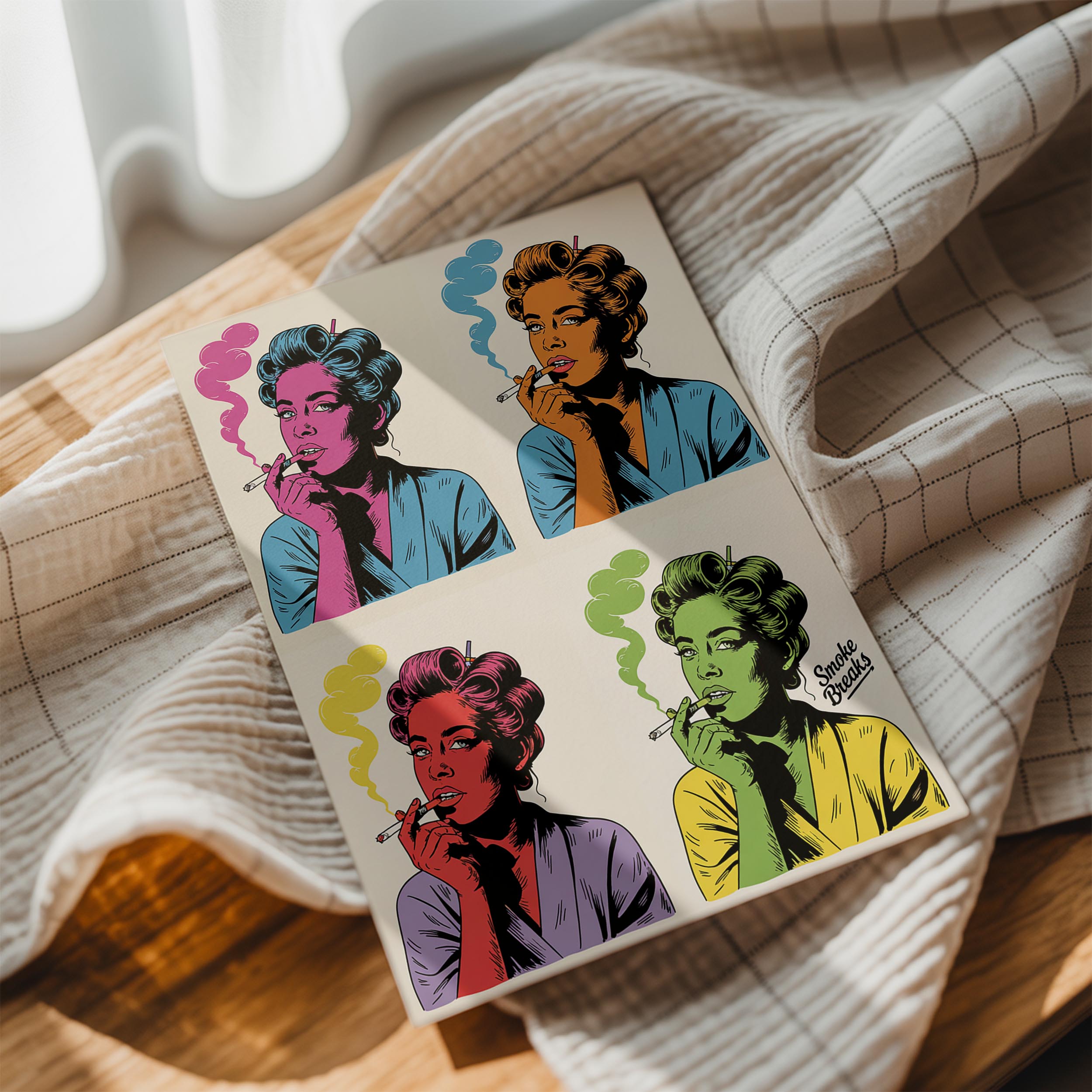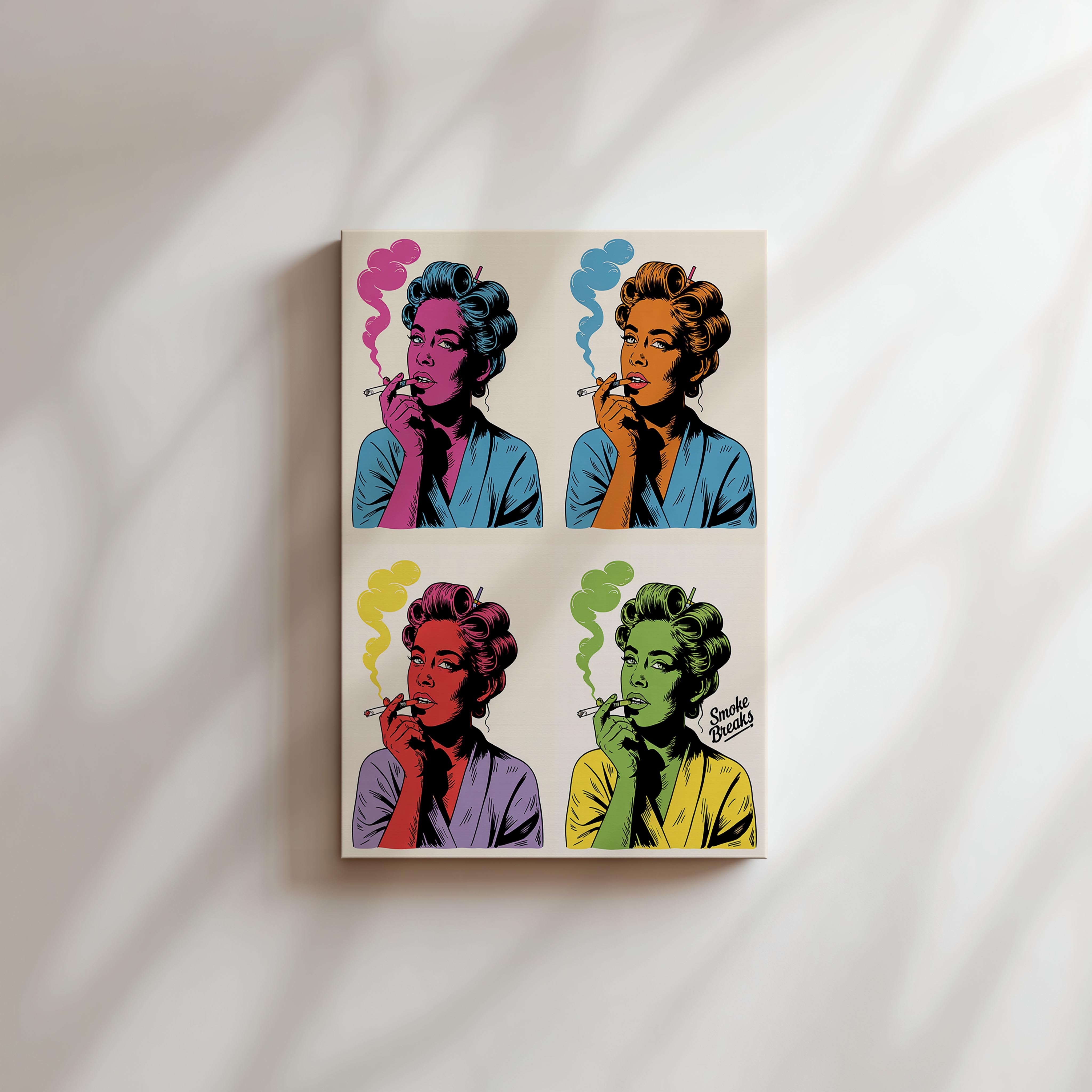 This image showcases a pop art-inspired quartet of a glamorous woman smoking, each variation rendered in bold, contrasting color schemes. The repetition with differing hues—magenta, orange, red, and green—evokes a Warhol-esque vibe, infusing retro appeal with modern irony. The woman’s relaxed expression, hair curlers, and rising colored smoke suggest a mid-century domestic archetype enjoying a rebellious pause. The inclusion of the phrase “Smoke Breaks” in the fourth quadrant adds a satirical twist, hinting at a blend of nostalgia and critique. This piece would suit pop culture enthusiasts and collectors of retro-inspired art. Ideal for hanging in creative offices, cafes, or trendy living spaces.