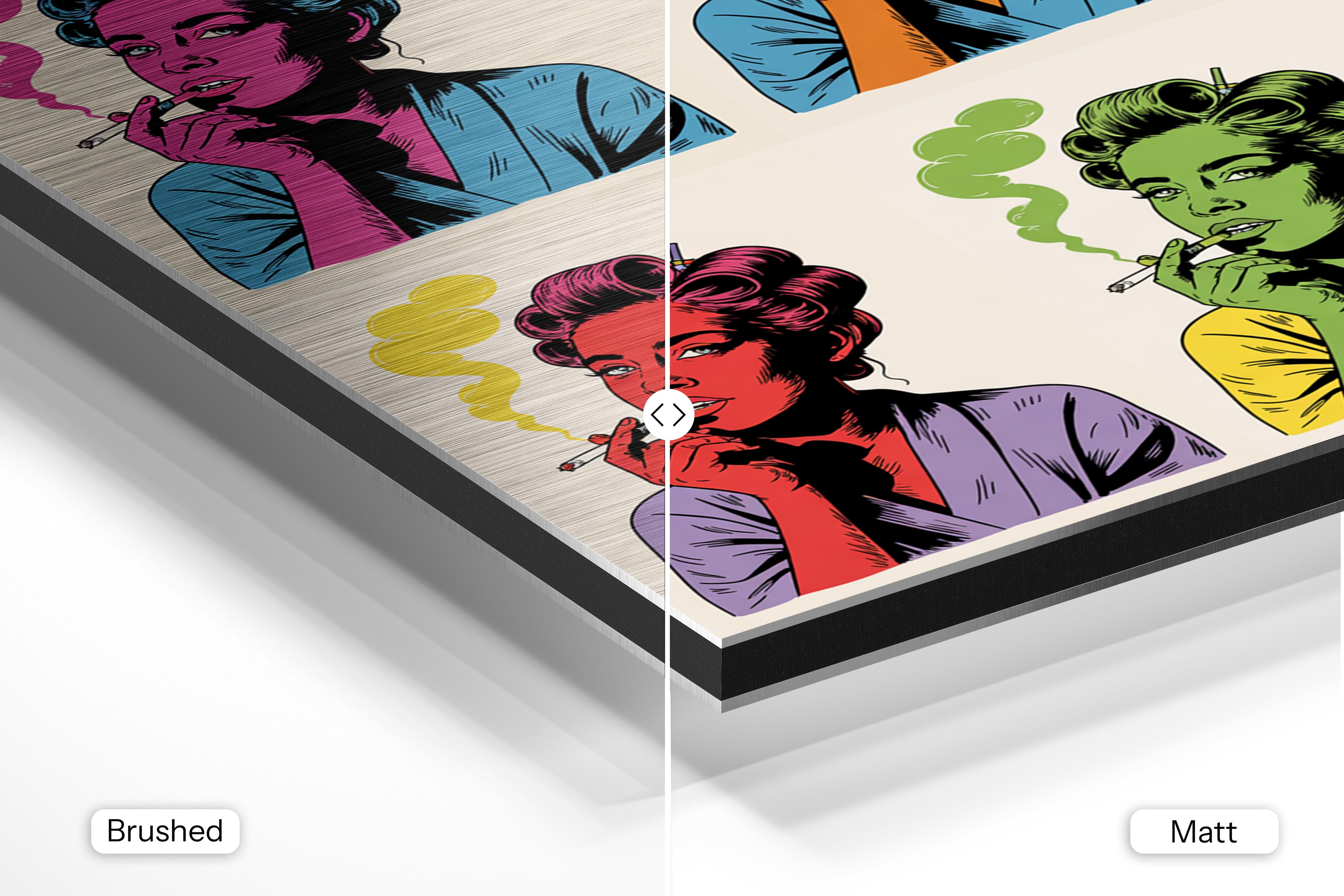 - Brushed Aluminum, on the other hand, features a raw metallic texture with visible brush strokes. Whites and highlights in your image let the silver surface show through, adding a dramatic, shimmering effect. Ideal for black-and-white images, minimalist designs, or abstract art, it creates a bold, industrial vibe with a modern edge.