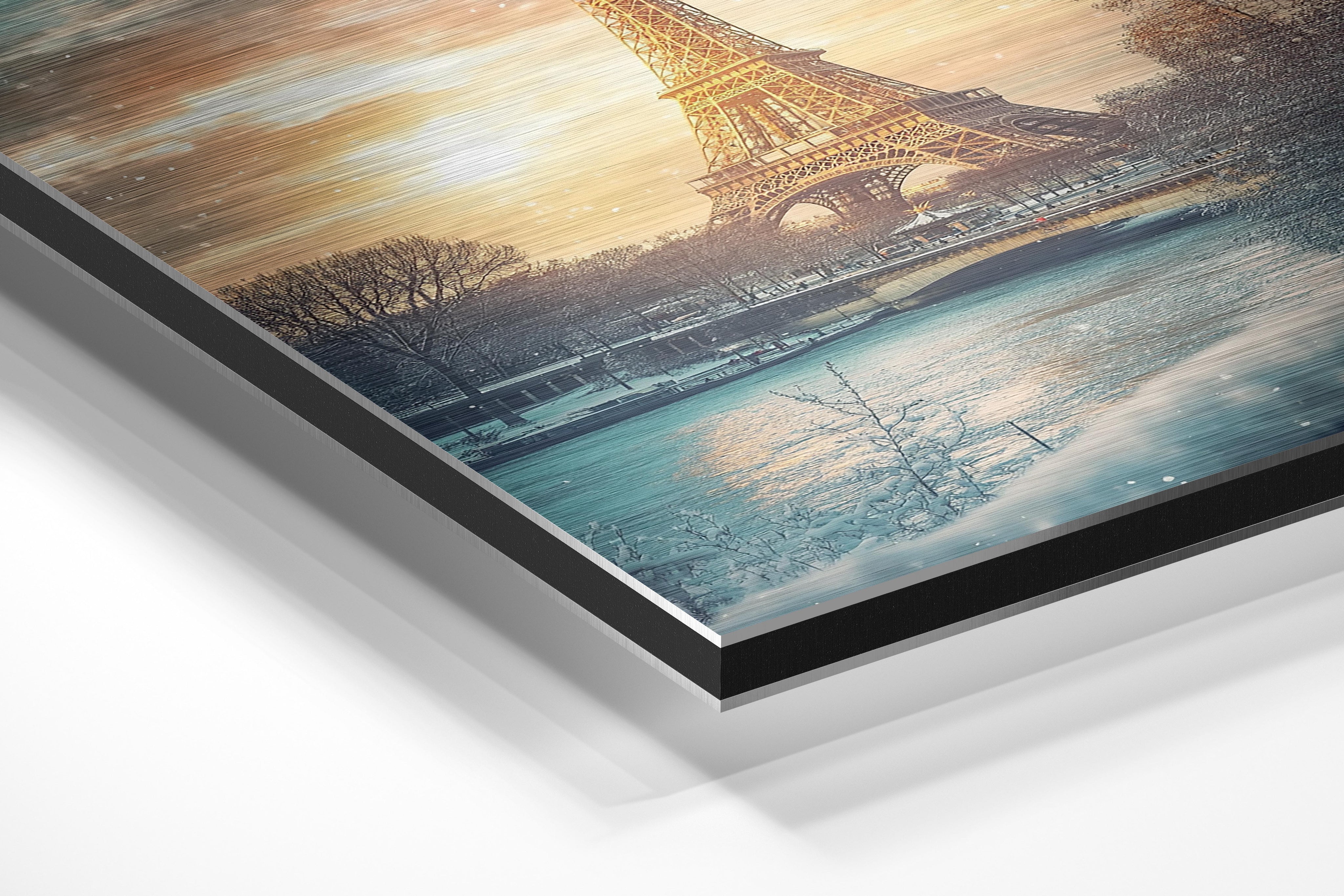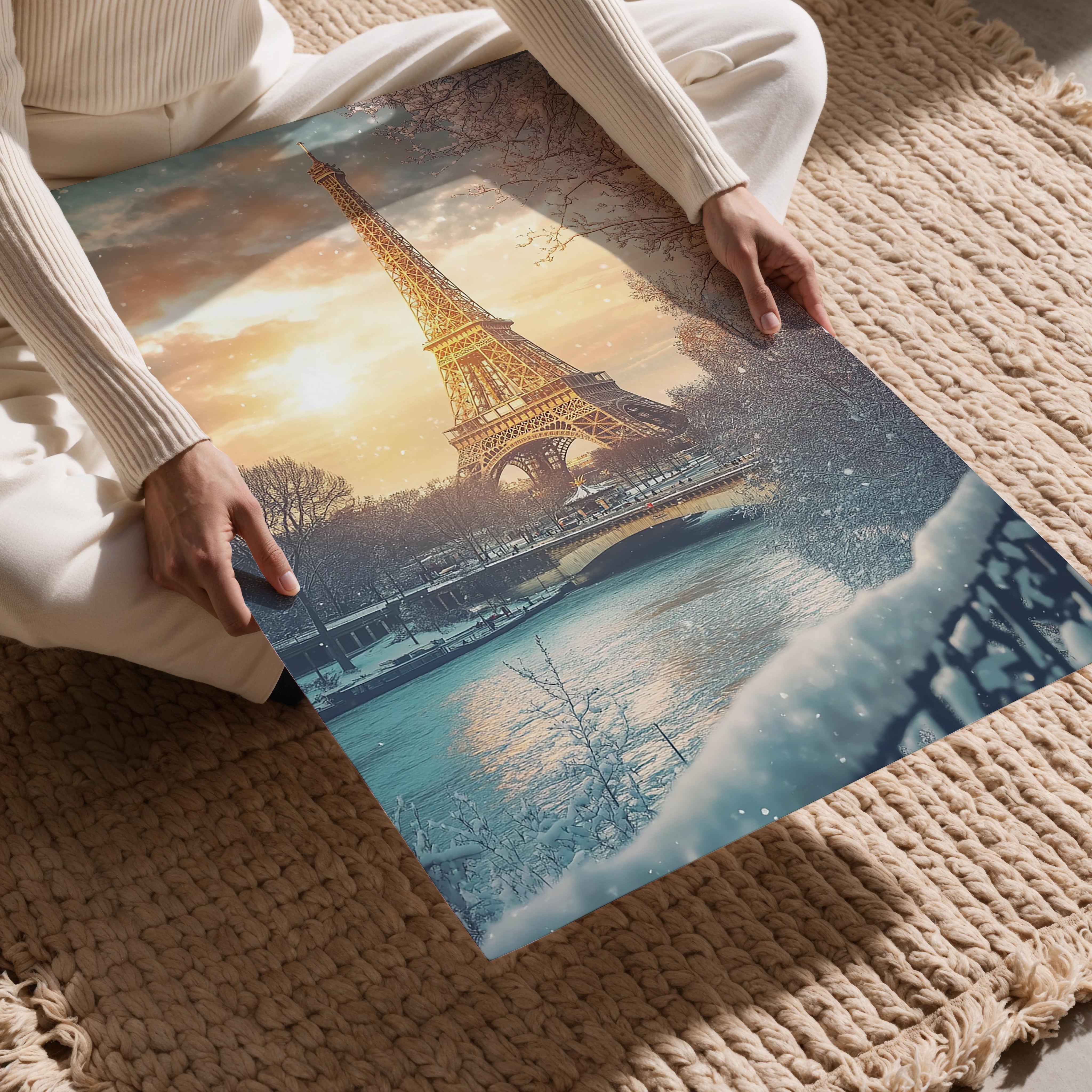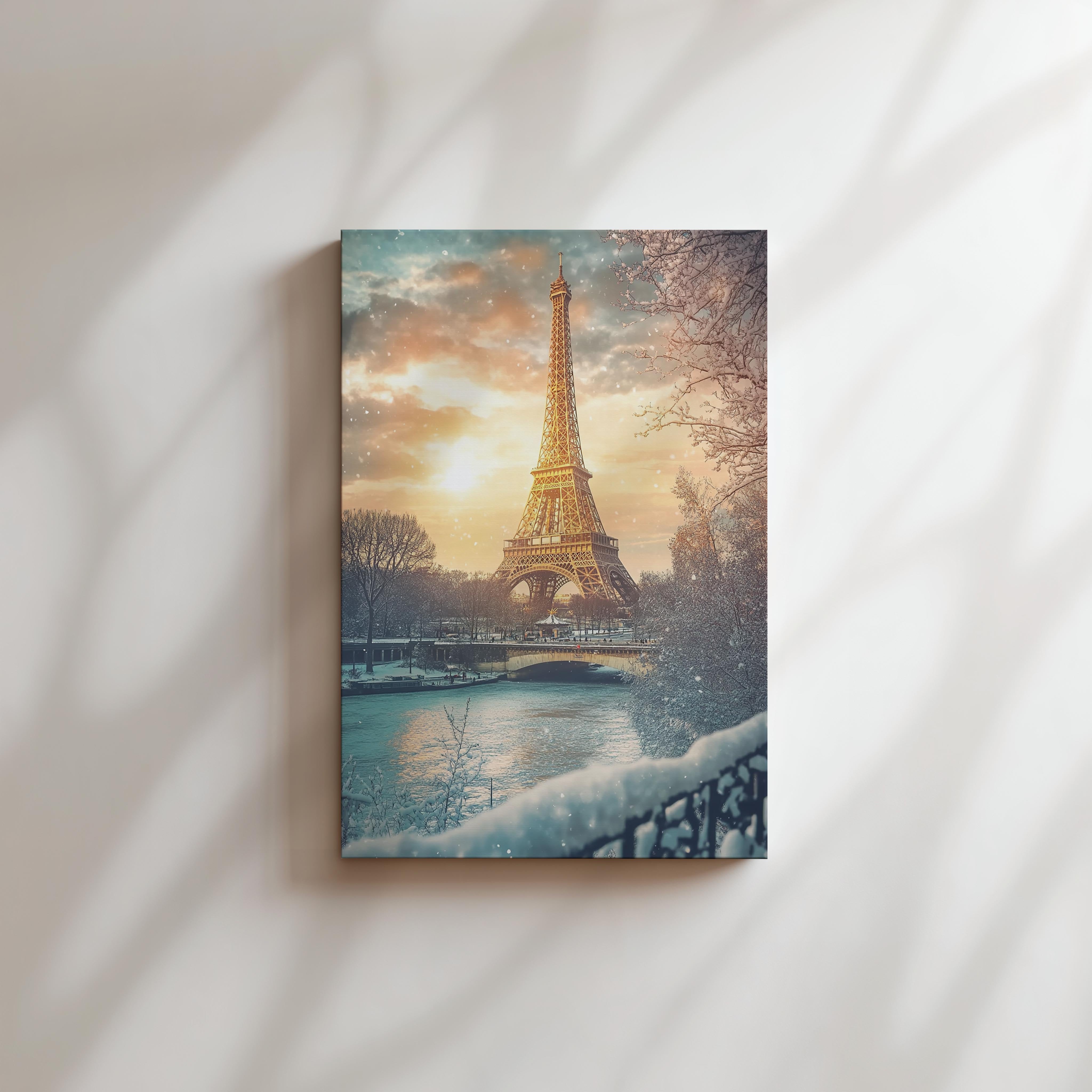 A picturesque scene of the Eiffel Tower amidst a serene winter landscape. The snow-covered surroundings and gentle sunlight bring warmth and beauty to the cold season. Ideal for creating a cozy yet elegant ambiance in living spaces or galleries. This artwork captures the harmony of nature and architecture, highlighting Parisian charm in wintertime.